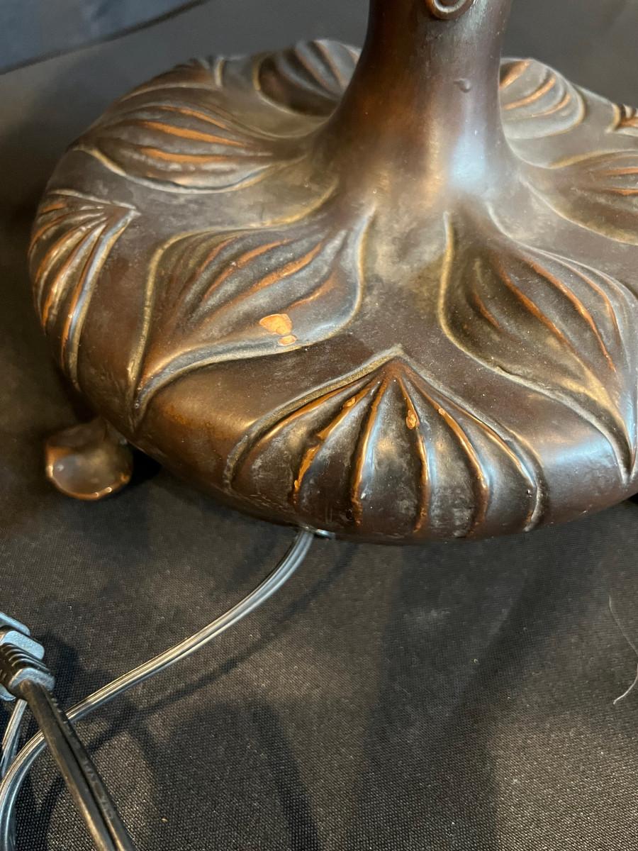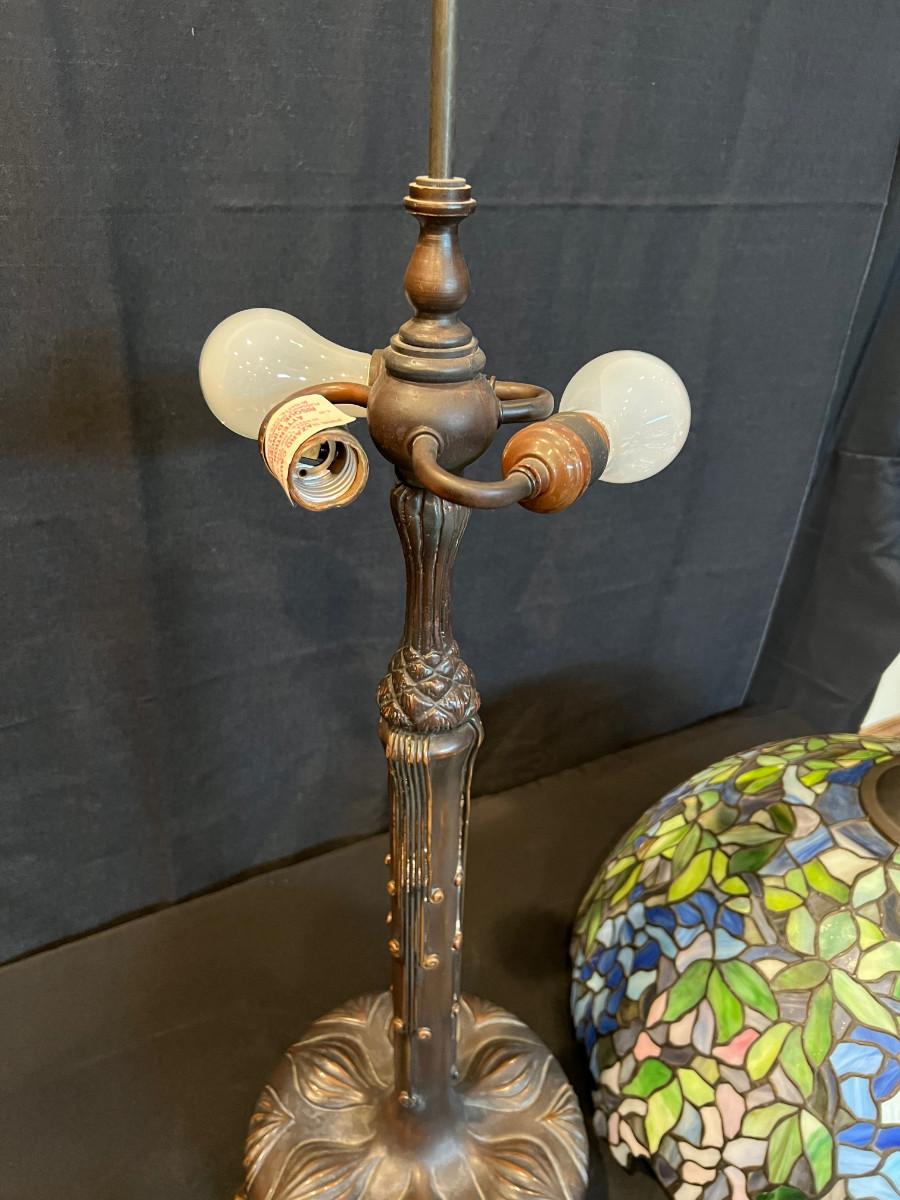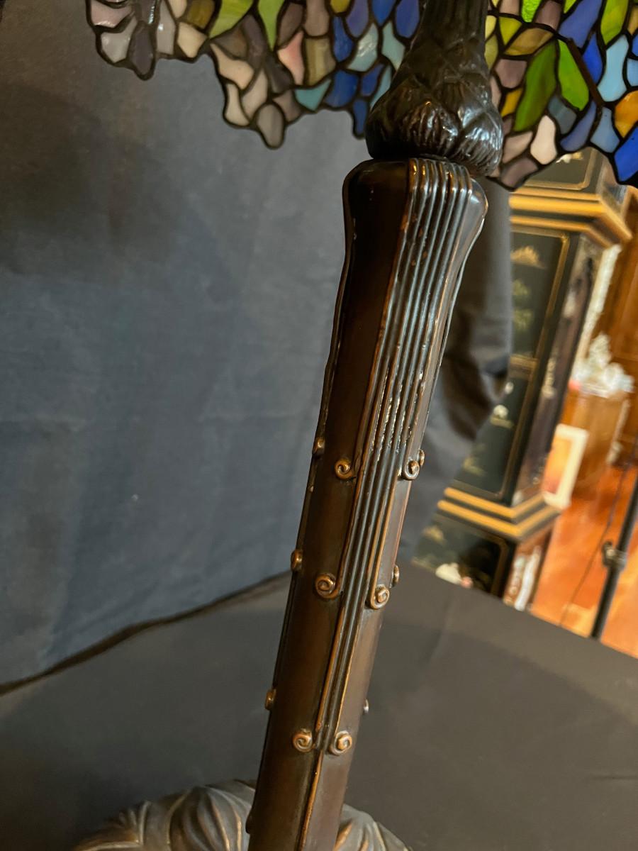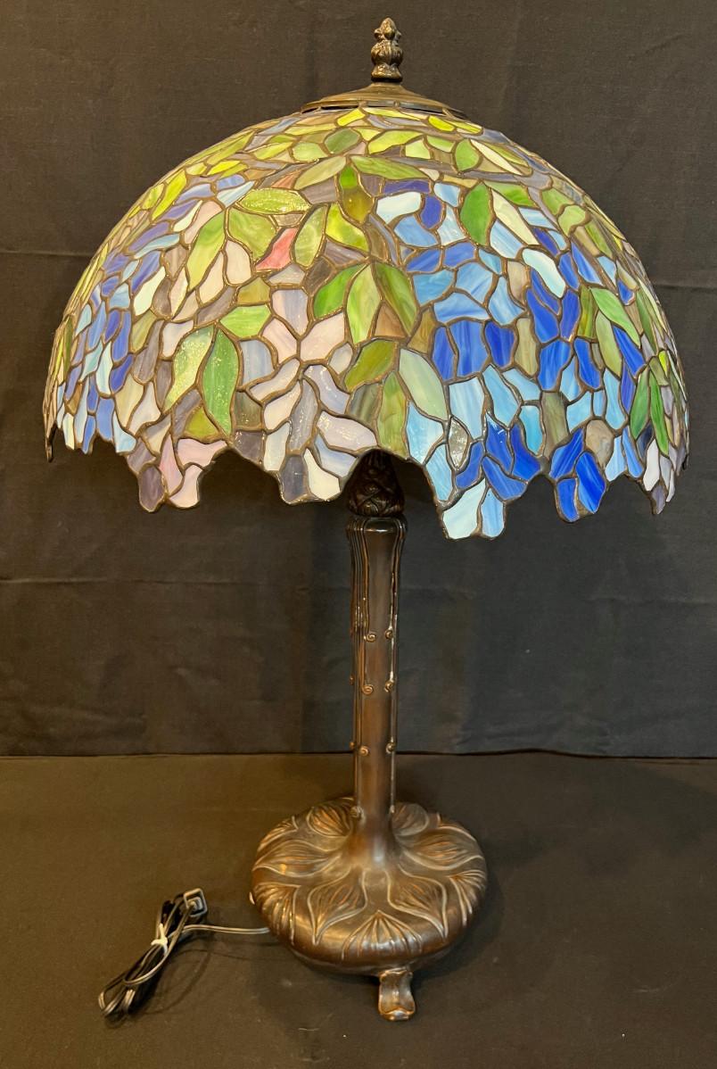Tiffany Style Stainglass Lamp by Quoizel Collectables, signature tab on shade. Beautiful well made antique reproduction of a Tiffany lamp. Solid bronze base with leaded glass shade. 32" tall shade has a 20" diameter and is 12' high. weight is approximately 40 pounds. This item can be shipped but we will have a boxing fee.