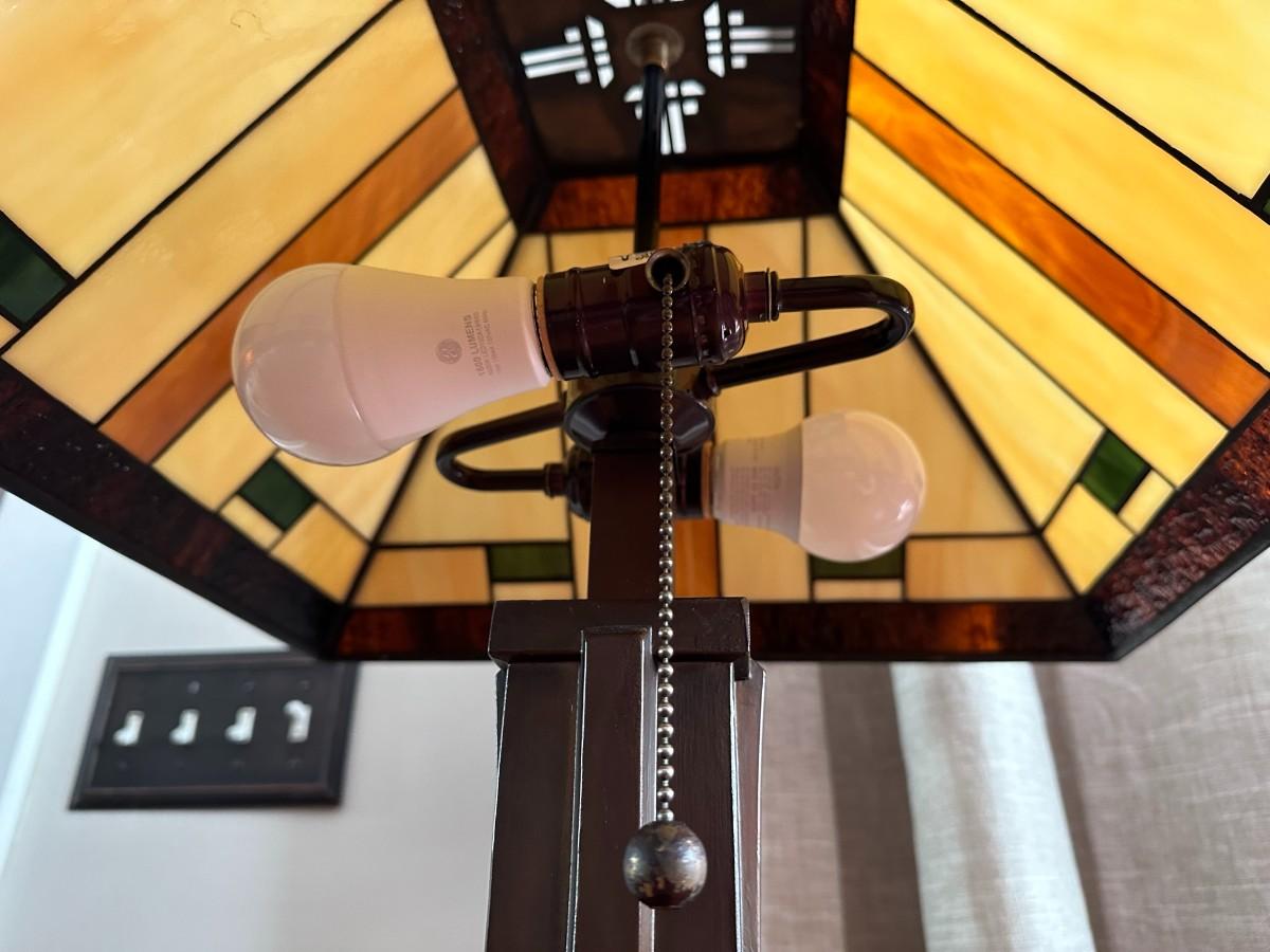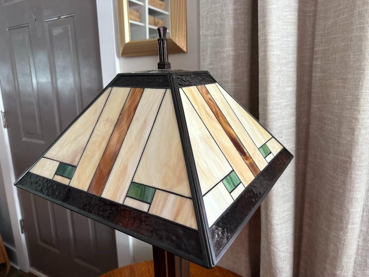 Lamp features 2 sockets; dark brown with beige/green/brown cut-glass shade measures 31" to top of finial.