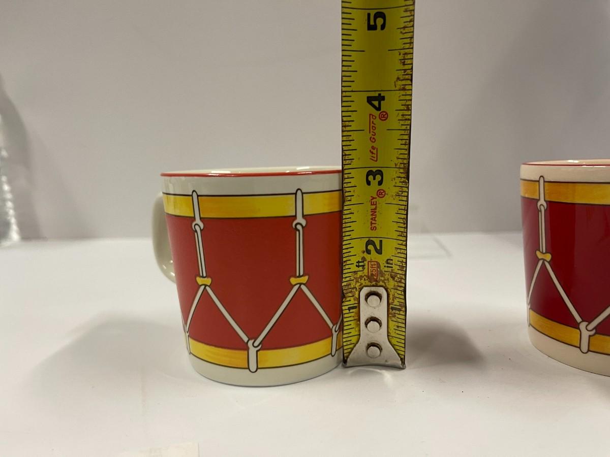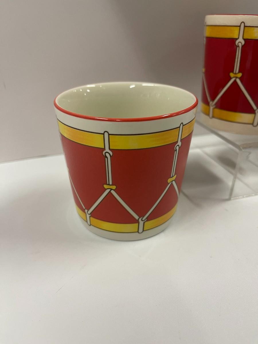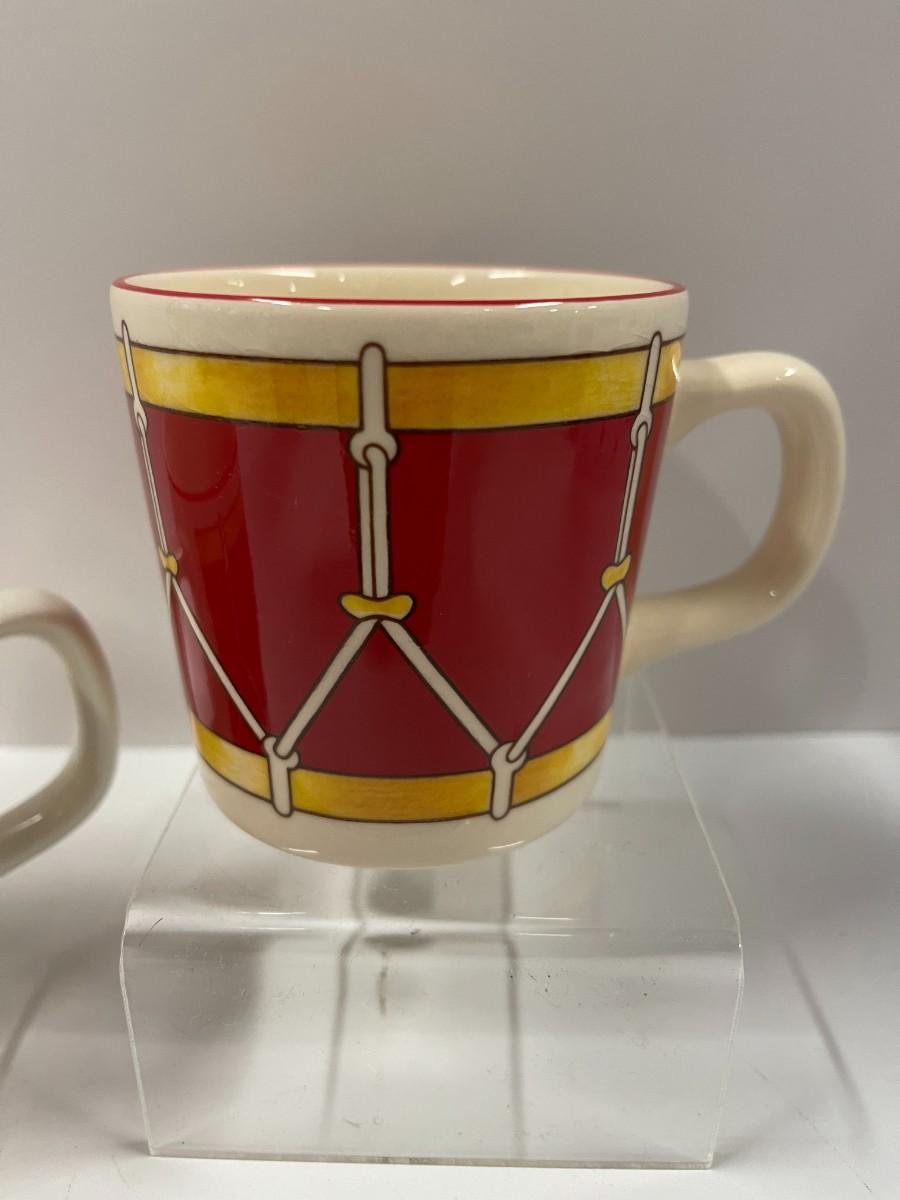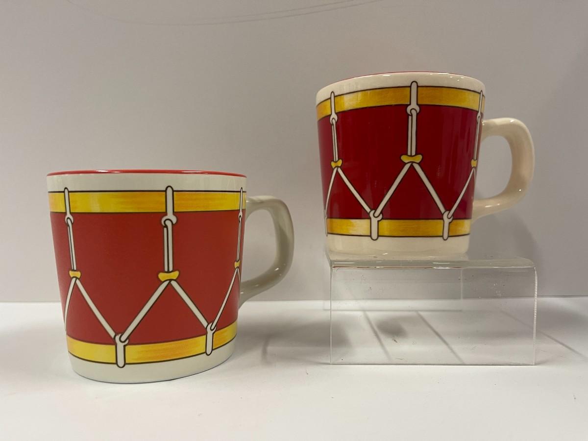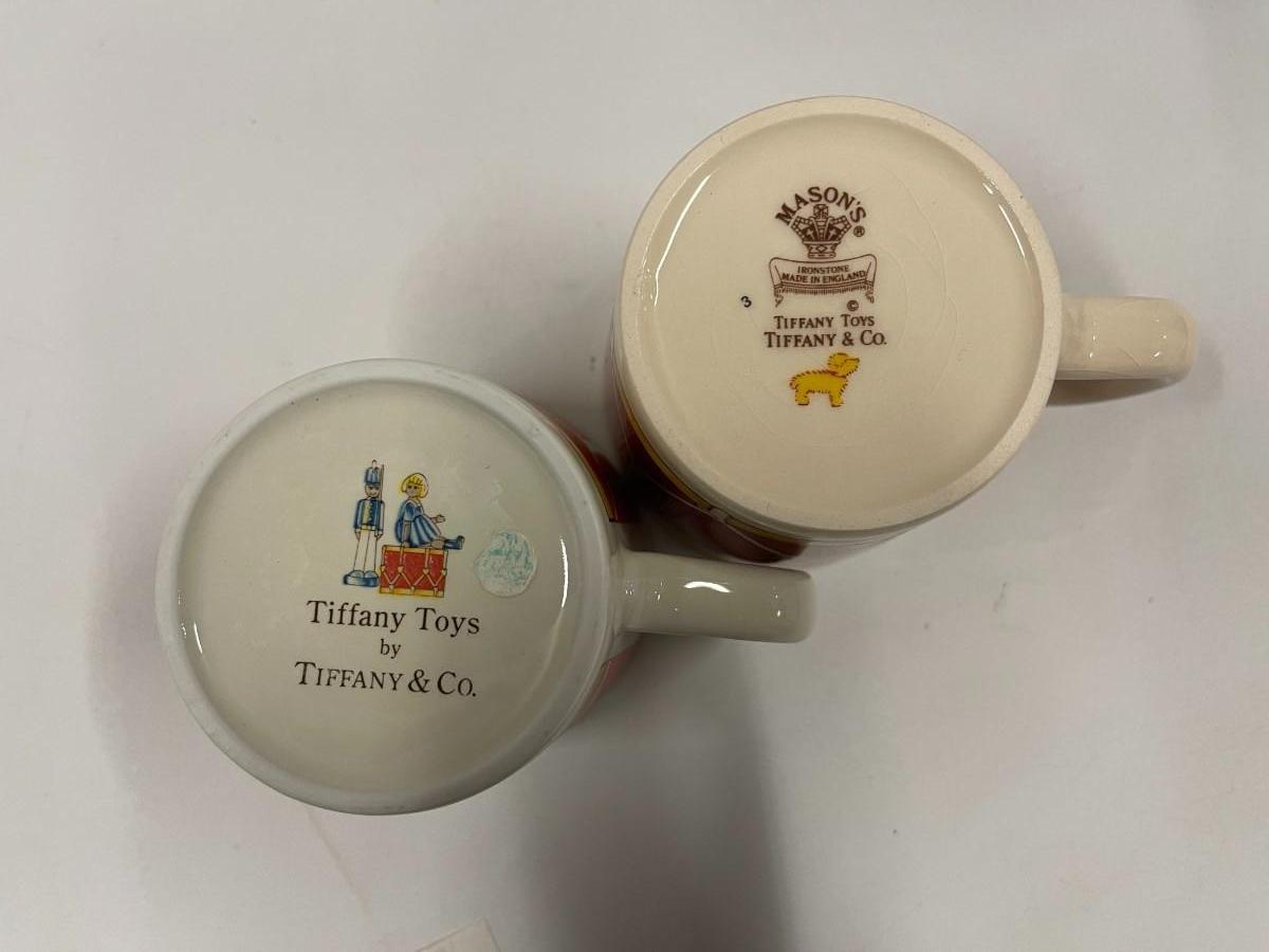 2 Tiffany & Co mugs. One has a shinier finish and was produced by Mason's Ironstone. This specific mug has crazing throughout. The other mug has a matte finish and is only marked Tiffany & Co., excellent condition, no crazing. Each is 3" high.