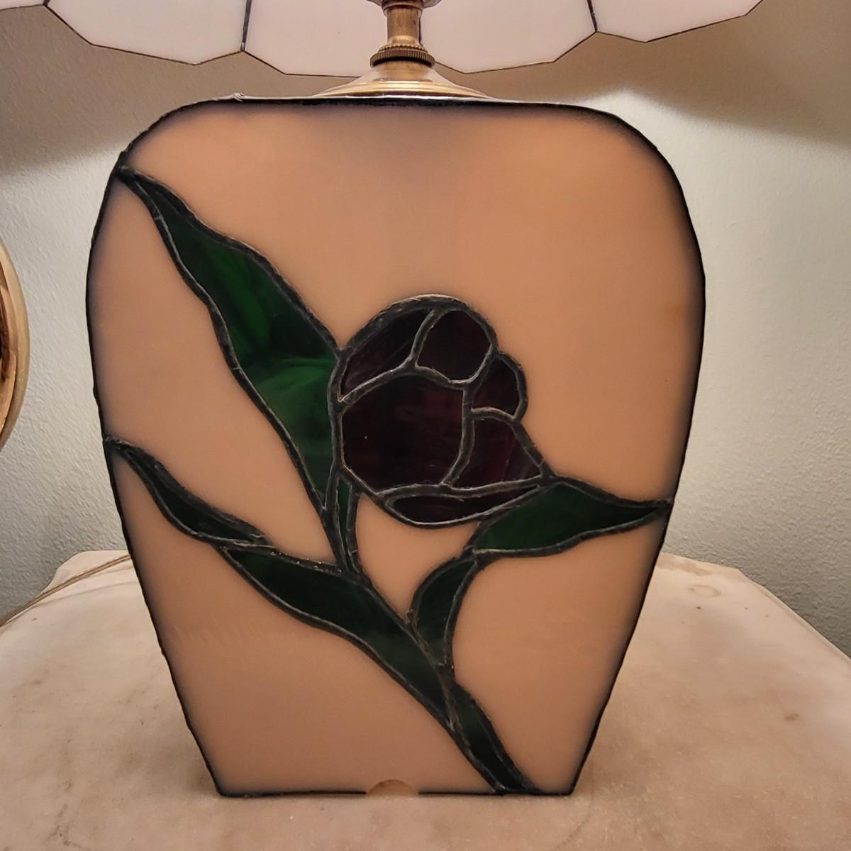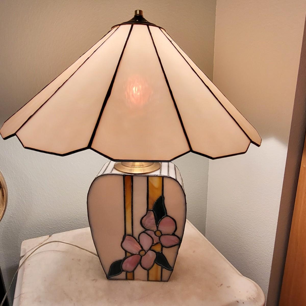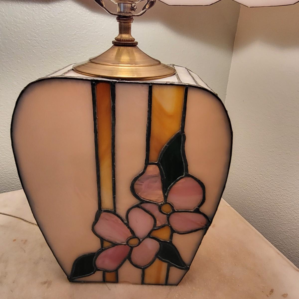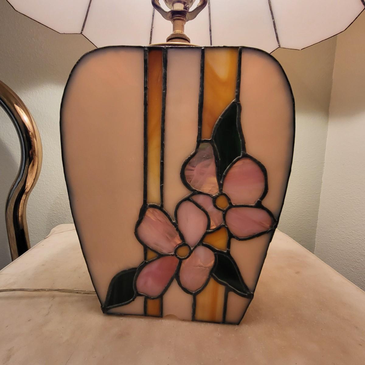 Pink floral Tiffany style stained glass and brass table lamp. Bottom part is 8" wide x 11" tall x 5" deep. The shade is 18" wide x 12" long. Overall from top to bottom is about 22" tall.