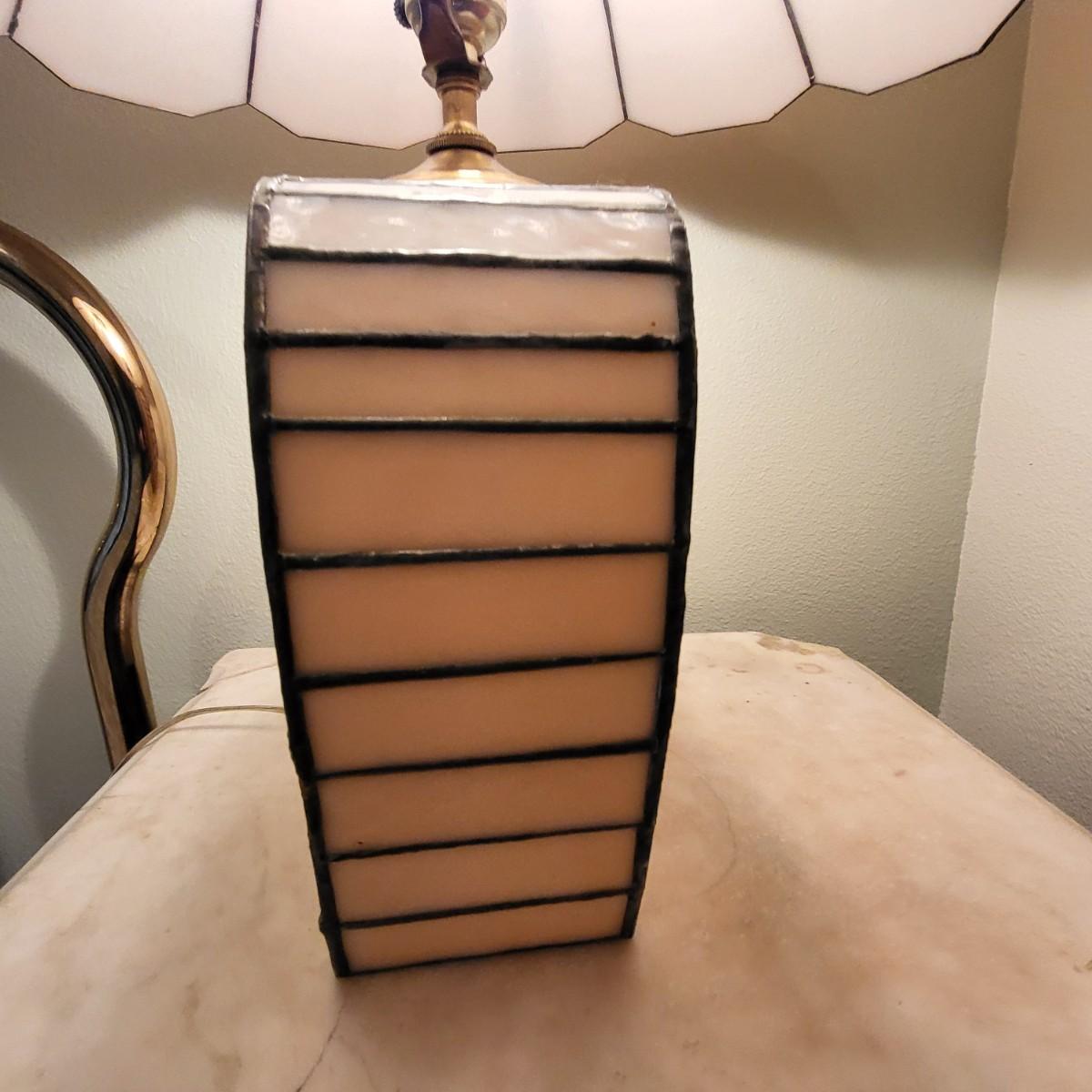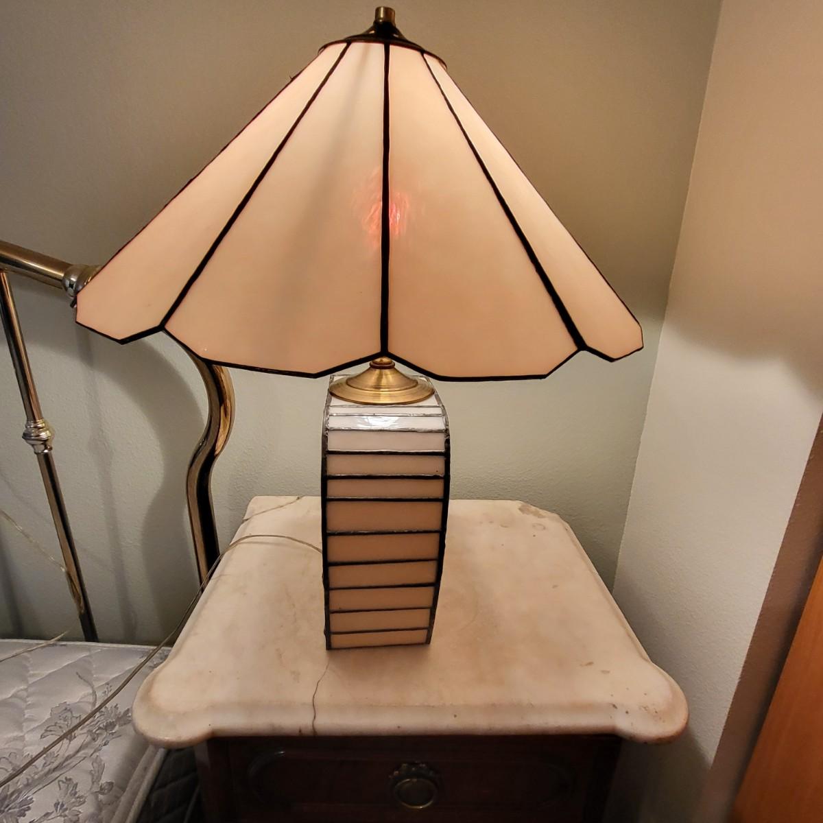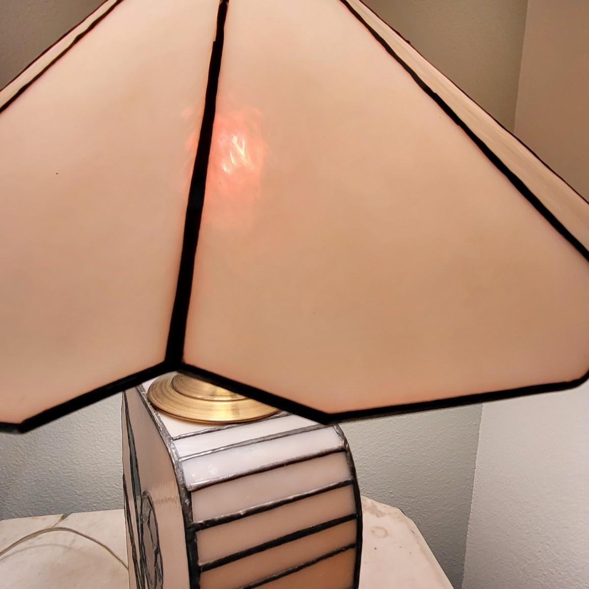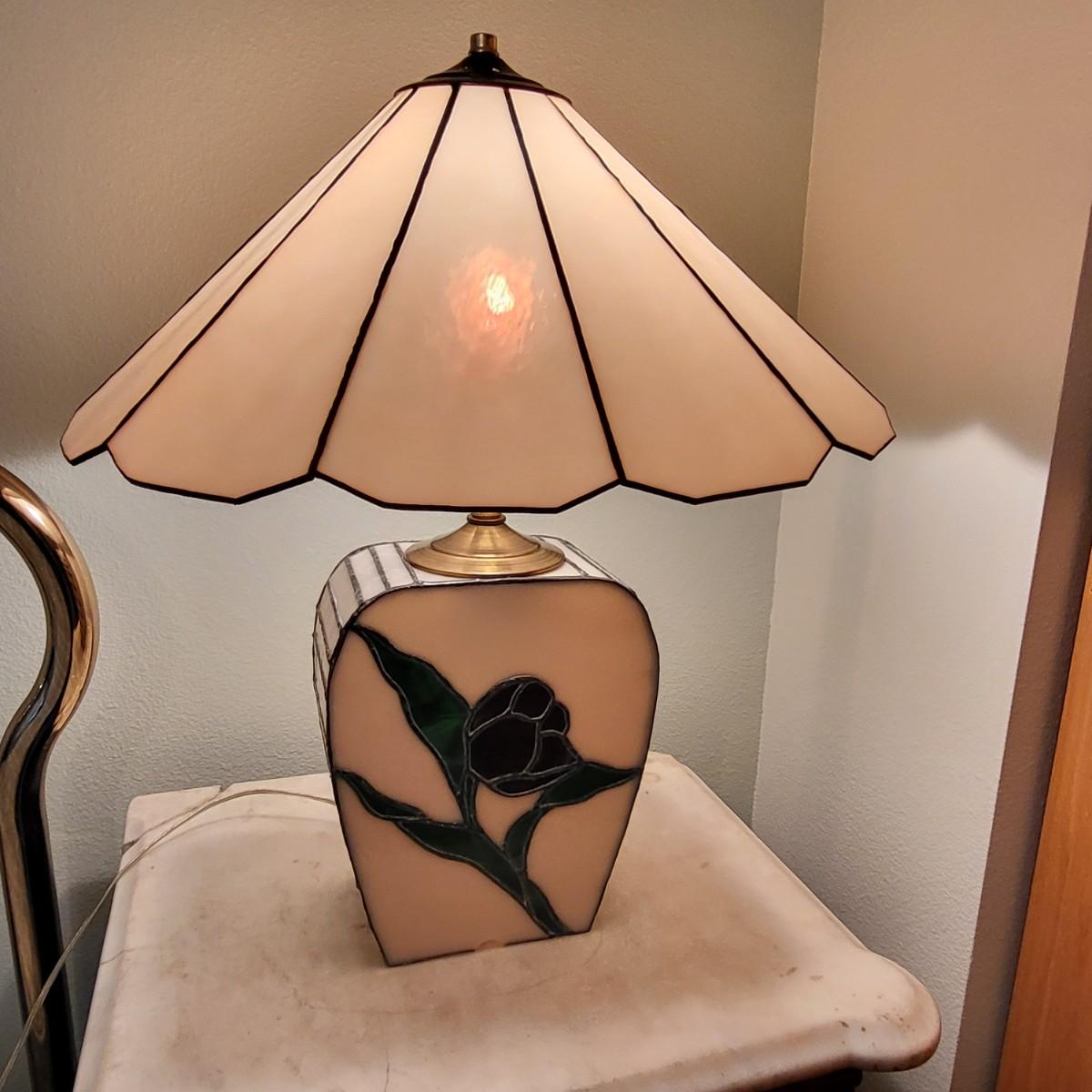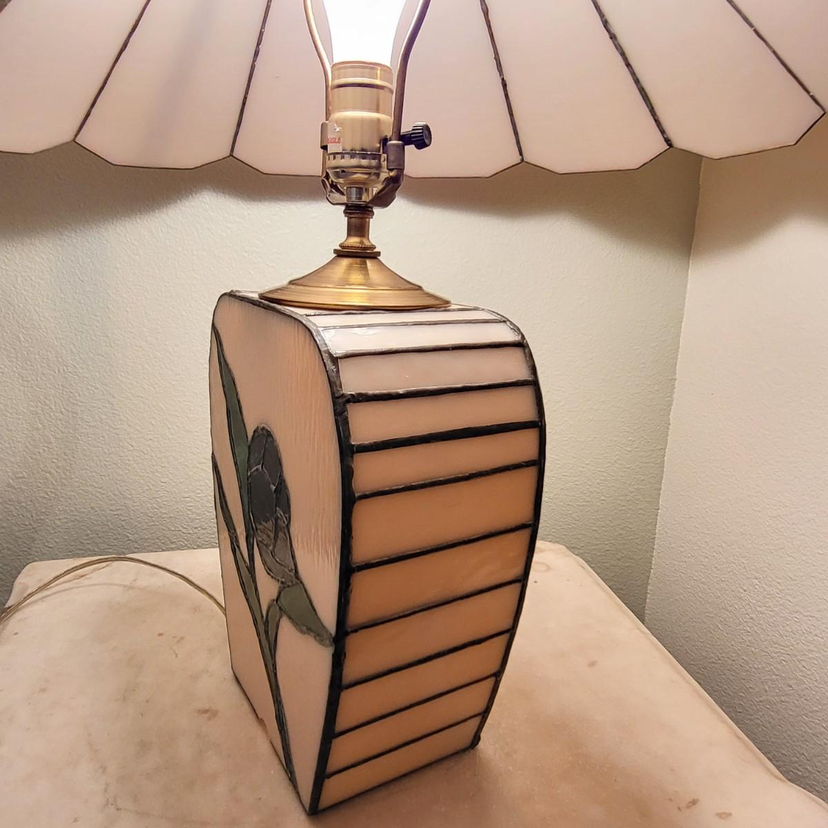 Pink floral Tiffany style stained glass and brass table lamp. Bottom part is 8" wide x 11" tall x 5" deep. The shade is 18" wide x 12" long. Overall from top to bottom is about 22" tall.