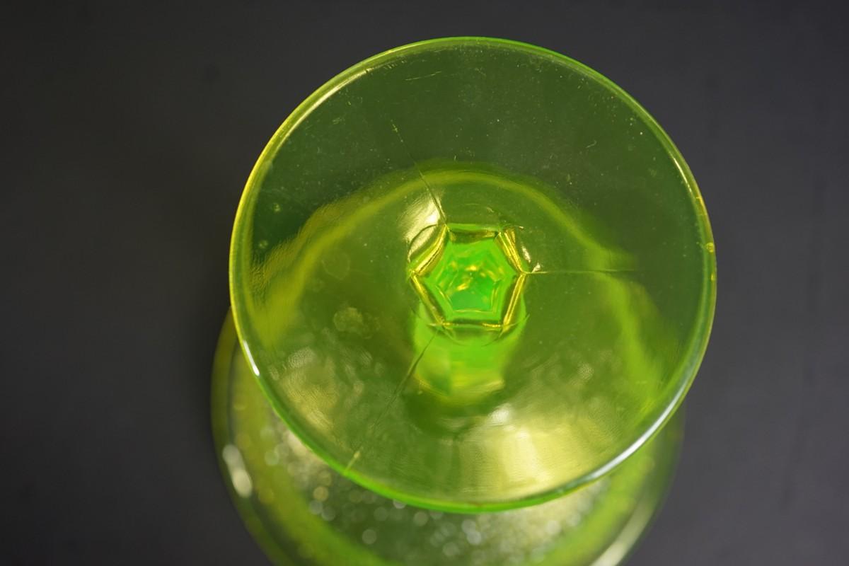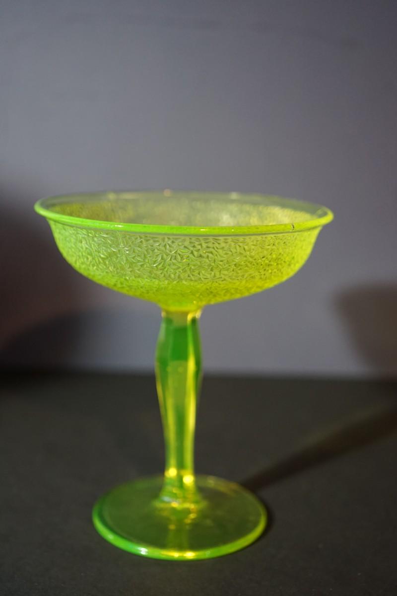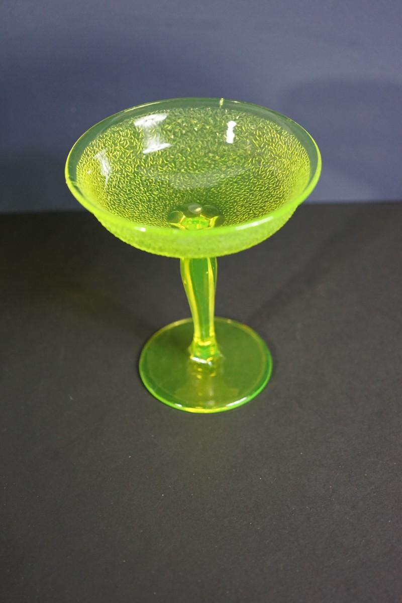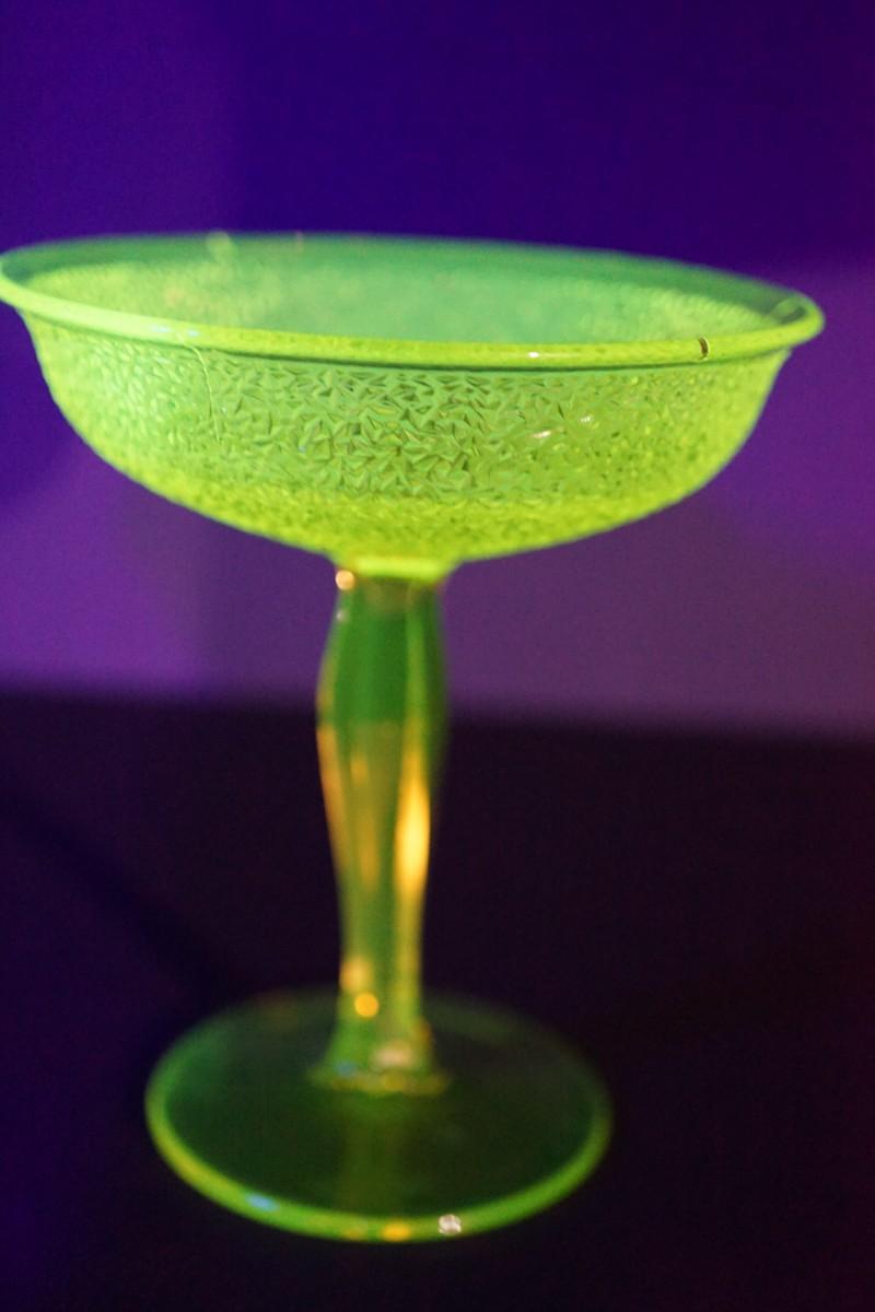 The compote glows under black light. Uranium glass.