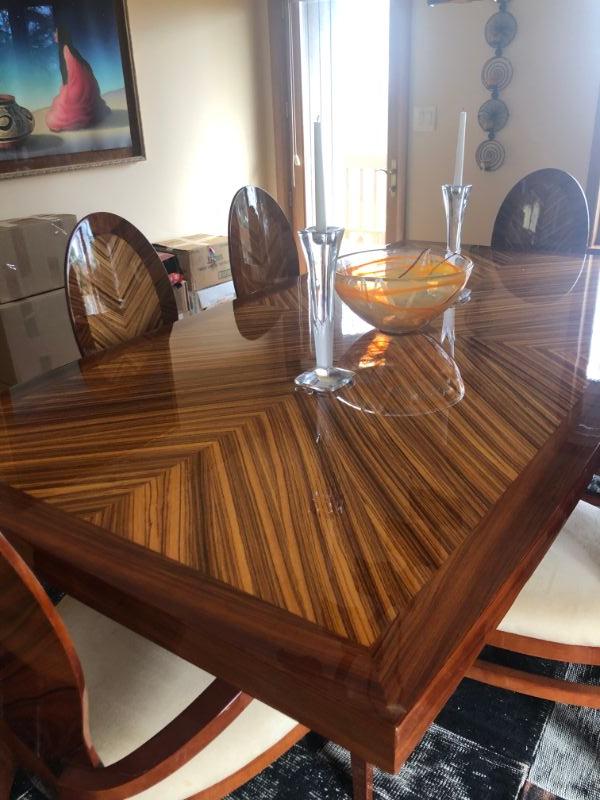 Excellent condition Tiger and Zebra Wood Table with Six Chairs and Matching Buffet. The table has two additional leaves. Please contact 610-659-9091 with any additional questions.