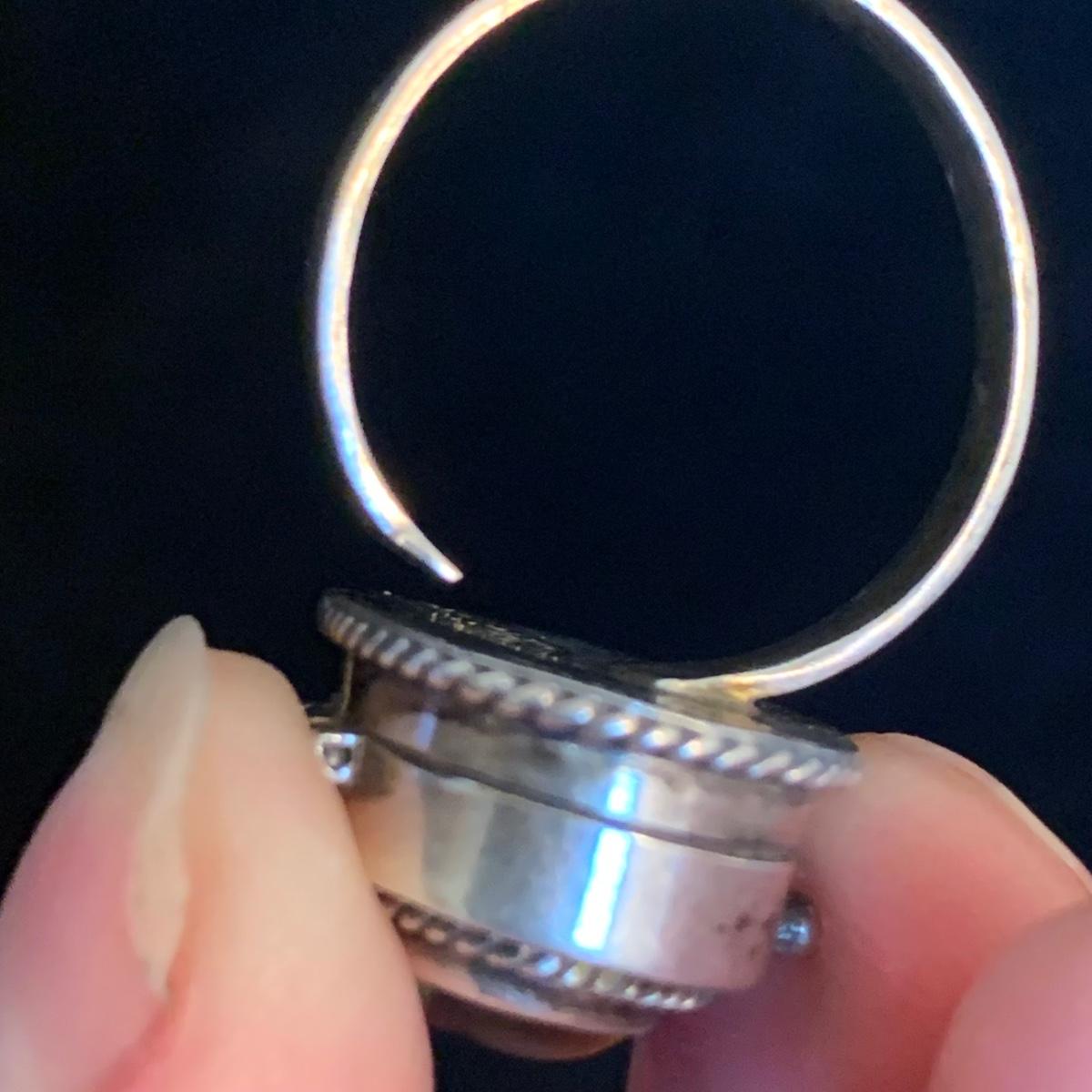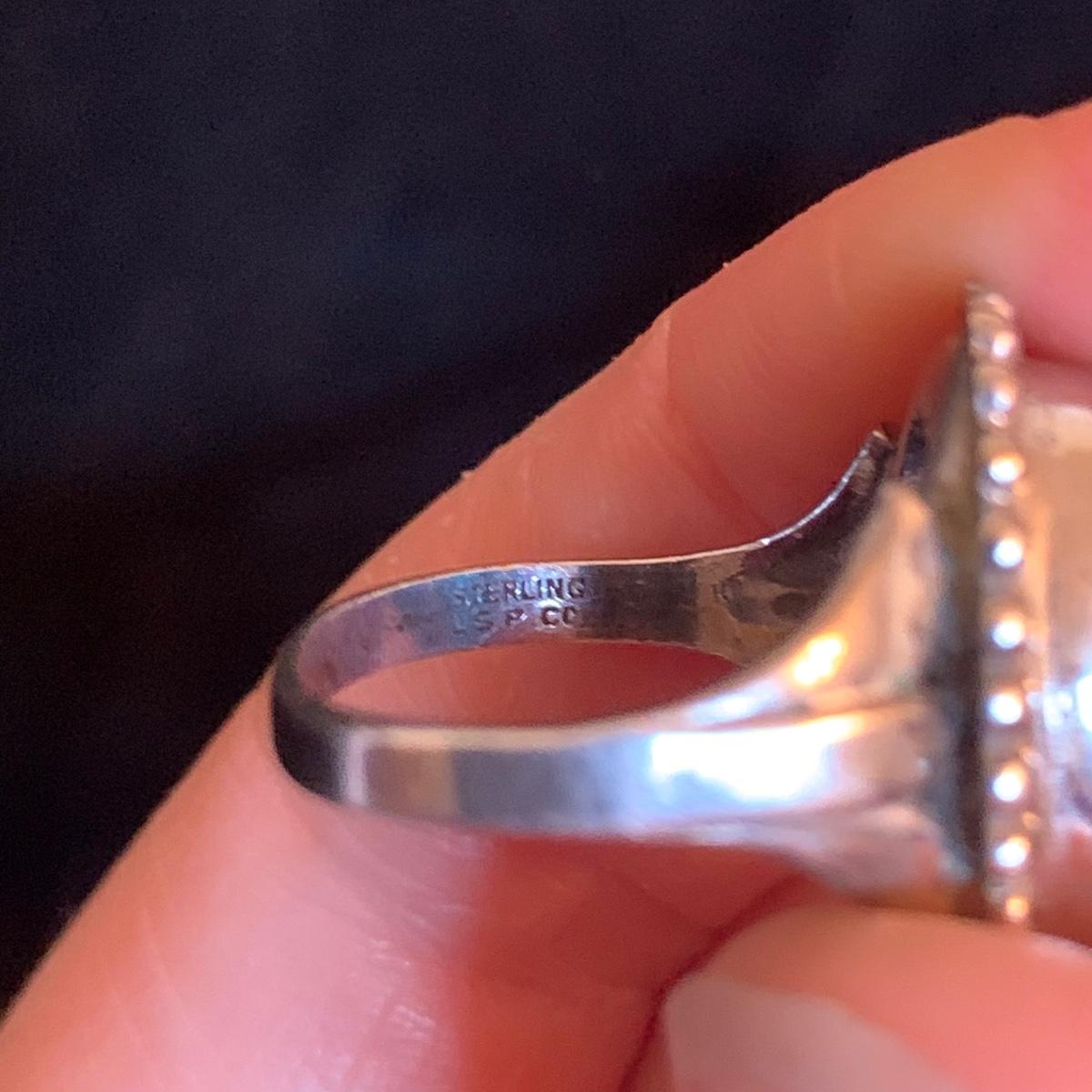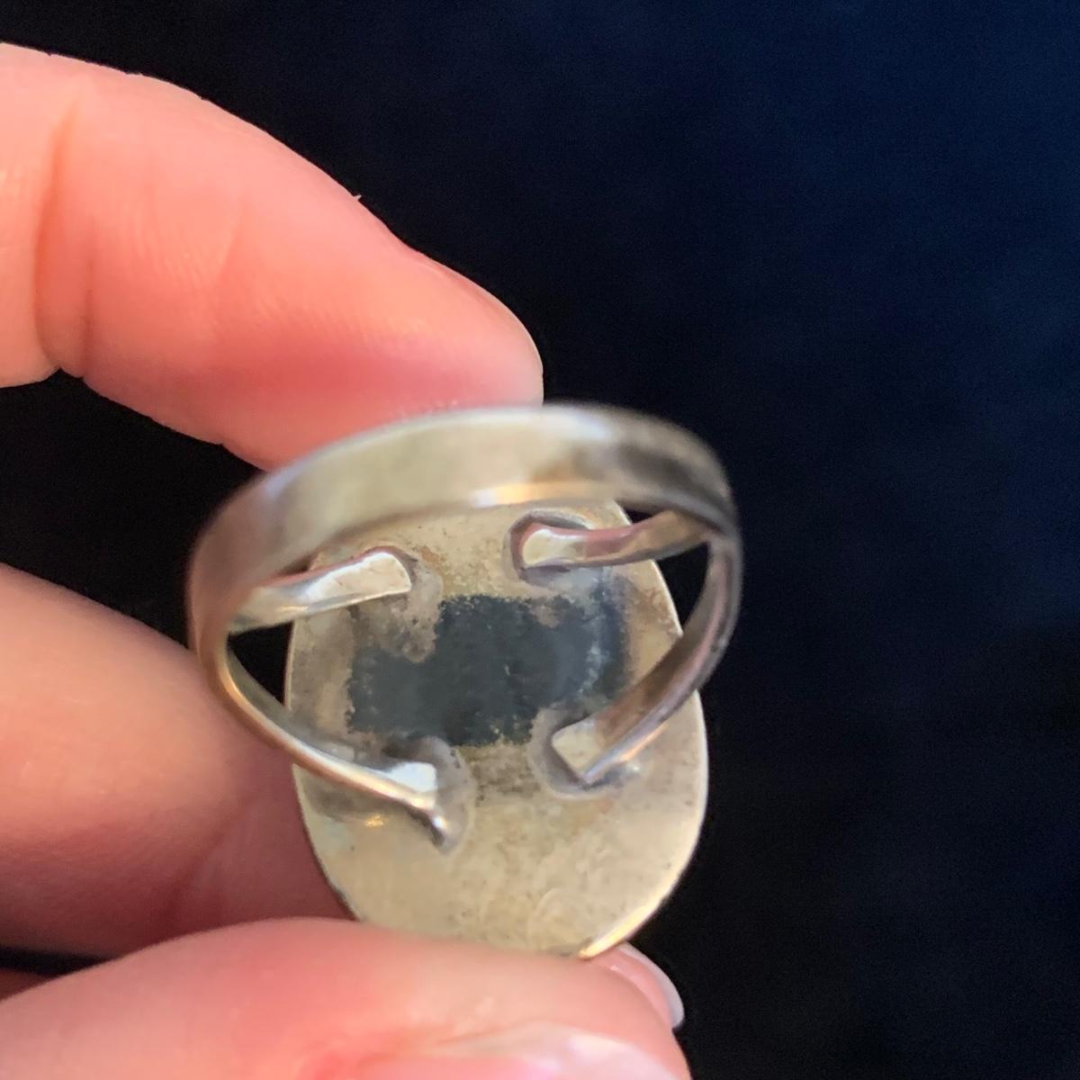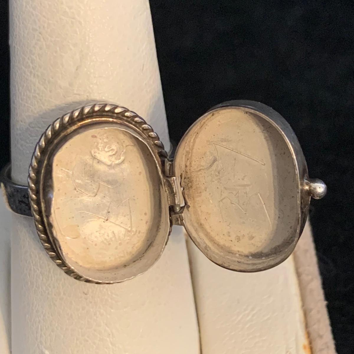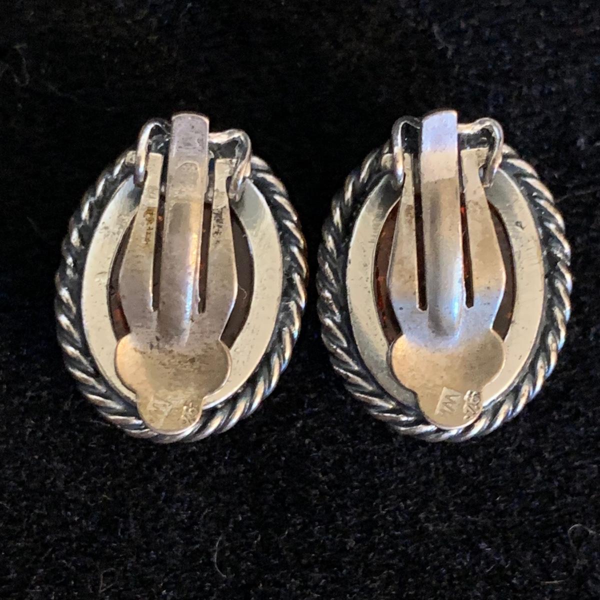 This collection contains three rings and a pair of amber clip on earrings, all stamped “˜Sterling’ or “˜925’. The ring with the Tiger Eye-like stone is a poison ring style that is size adjustable. The other two rings have stones with the appearance of malachite and turquoise. Please see photos for all markings and size details.