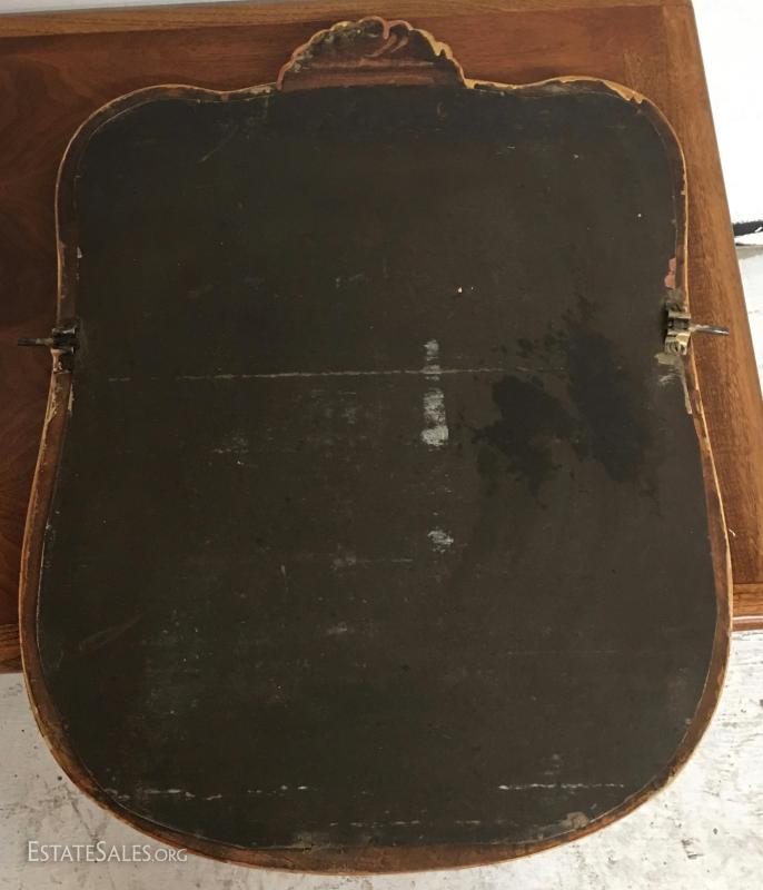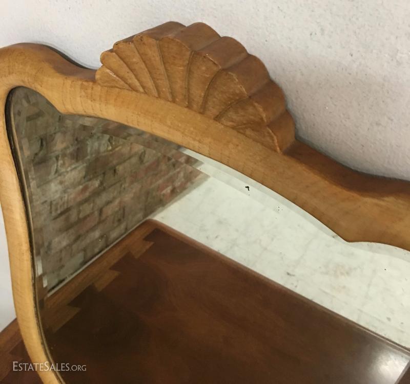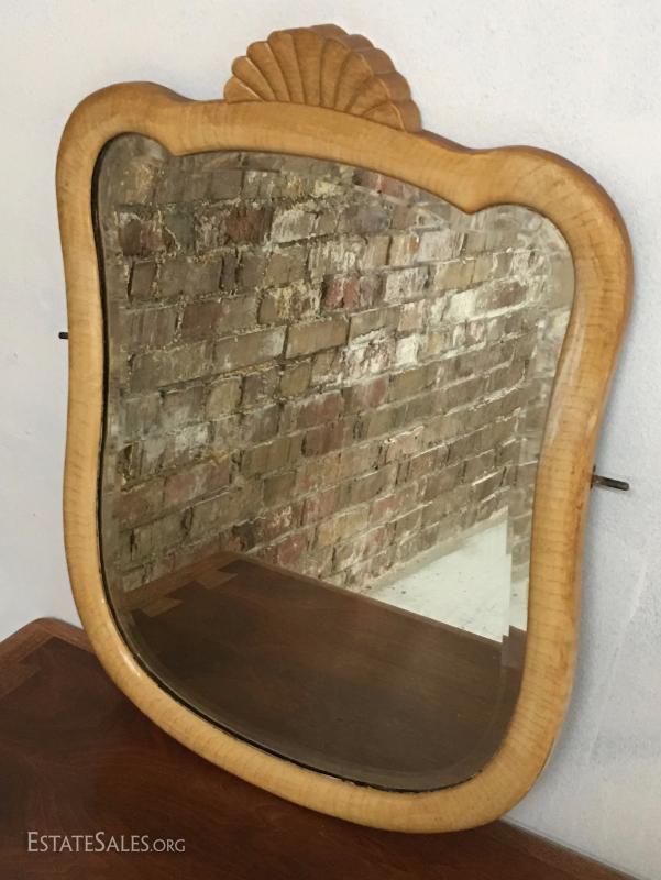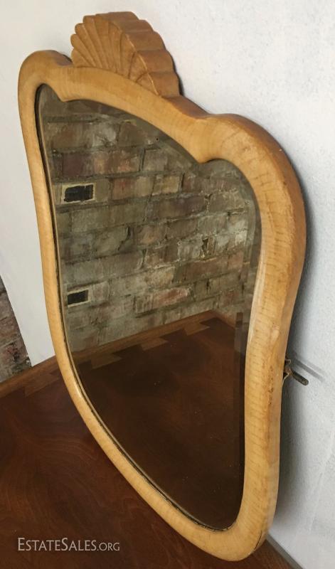 Mirror in in good condition with some flaking on the old silver, glass is beveled, wood is solid maple, still has brackets for attaching to antlers on a dresser or vanity. Measures 18" by 24".