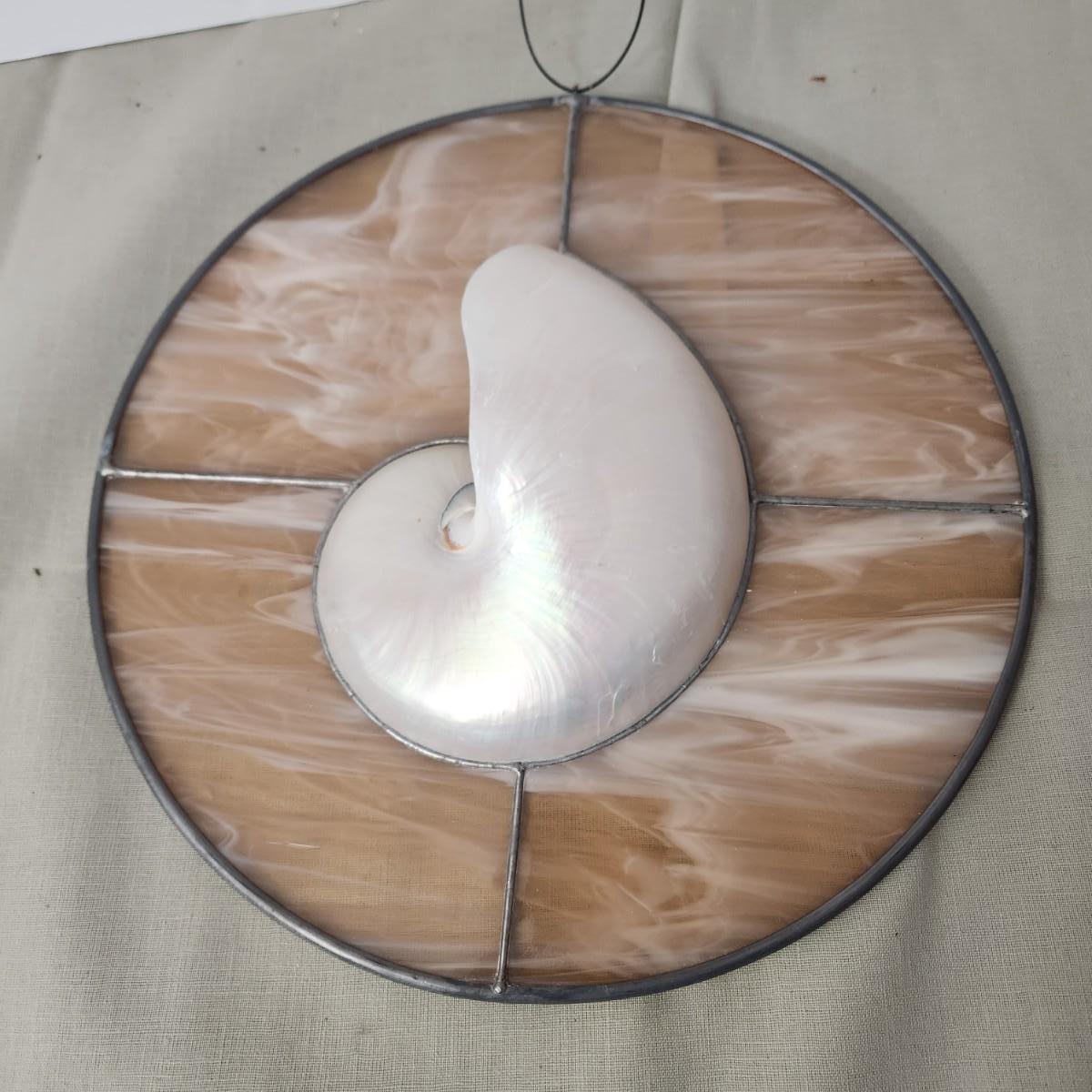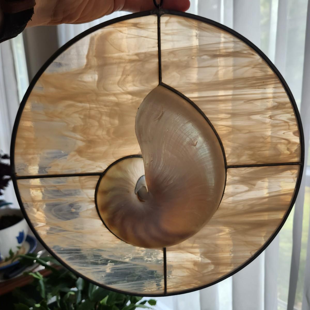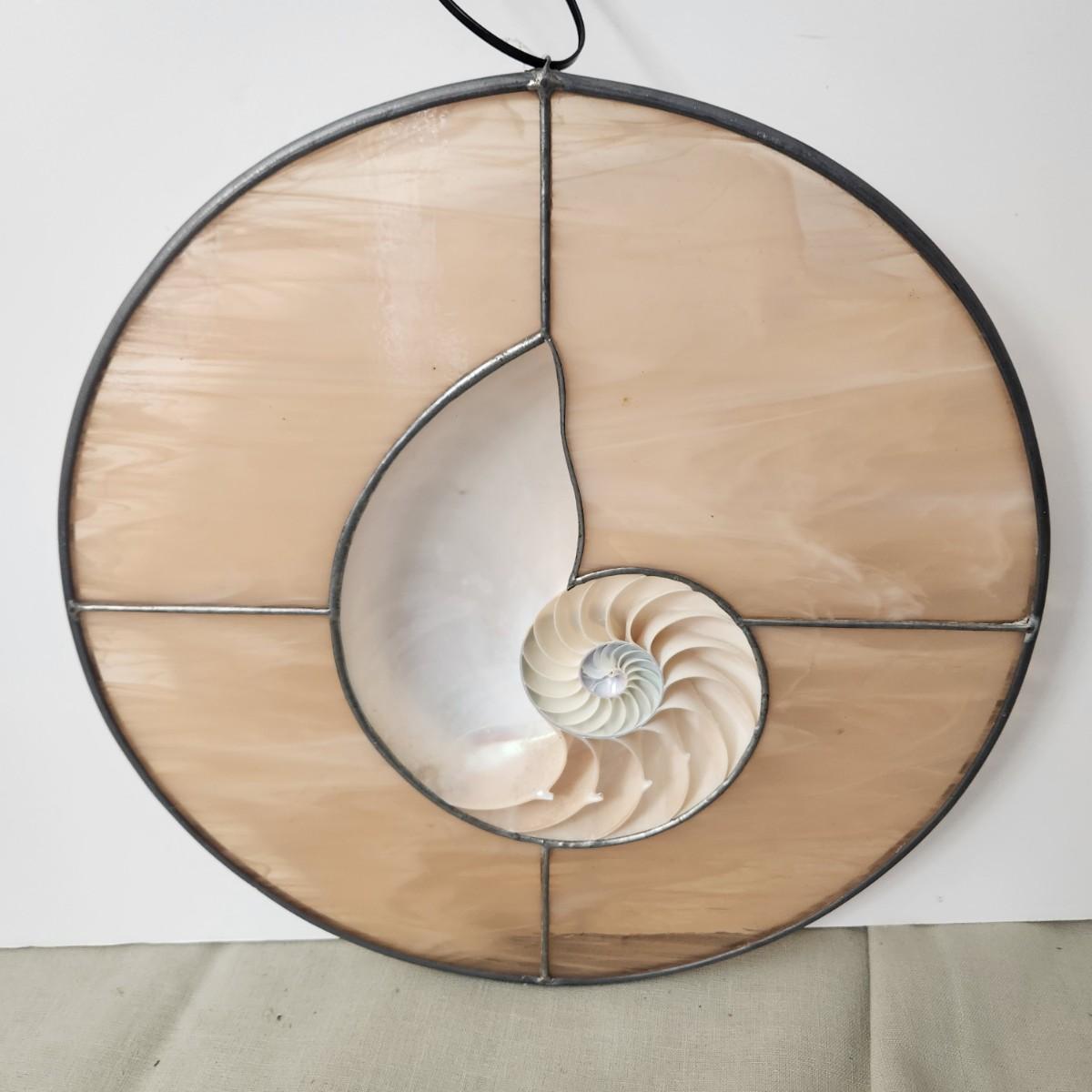 Tiger Nautilus Half shell surrounded by stained leaded glass sun catcher 12"