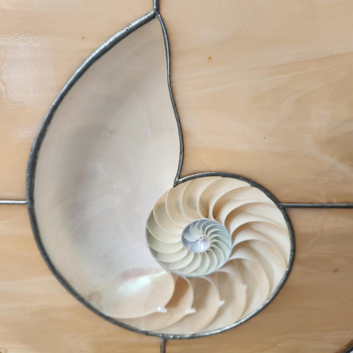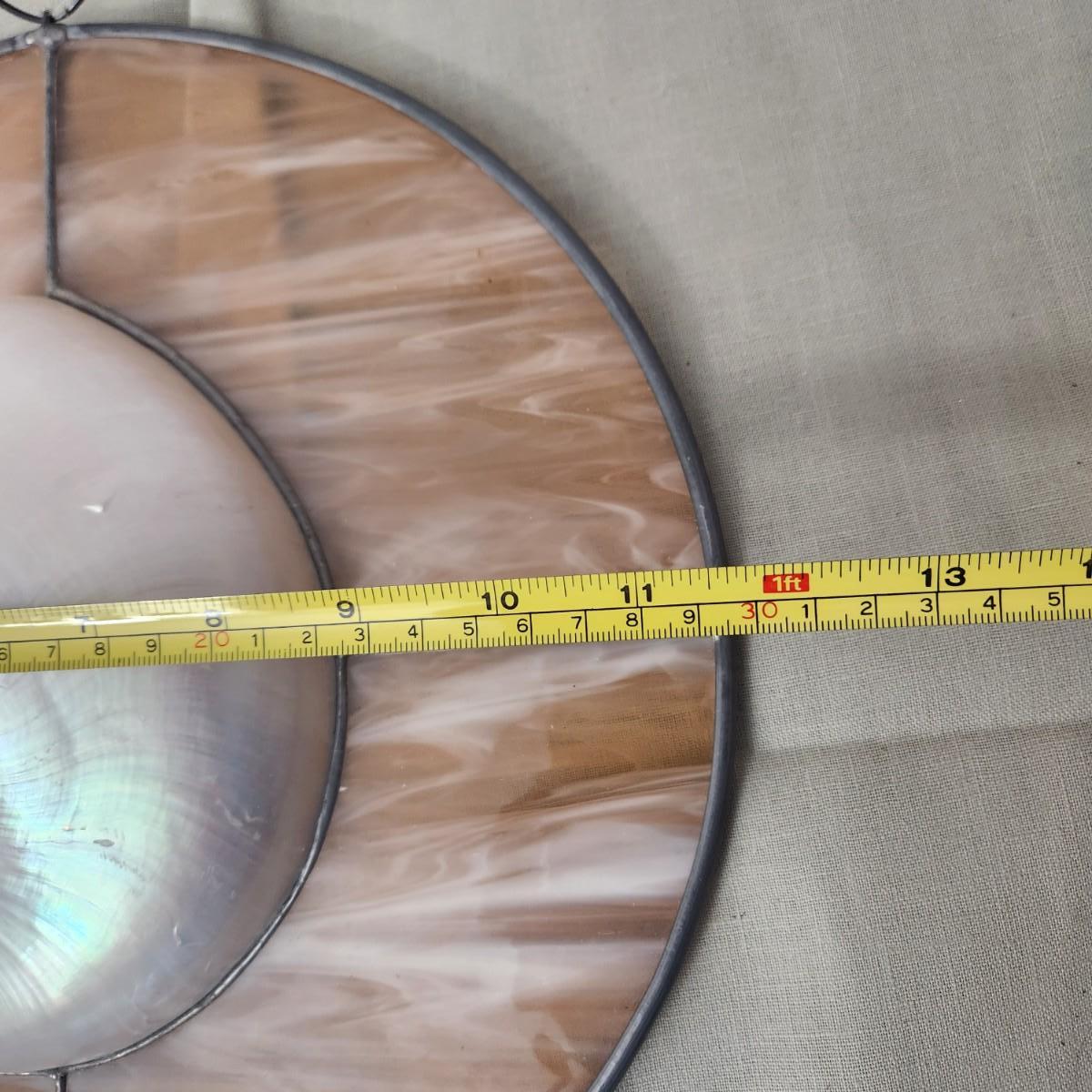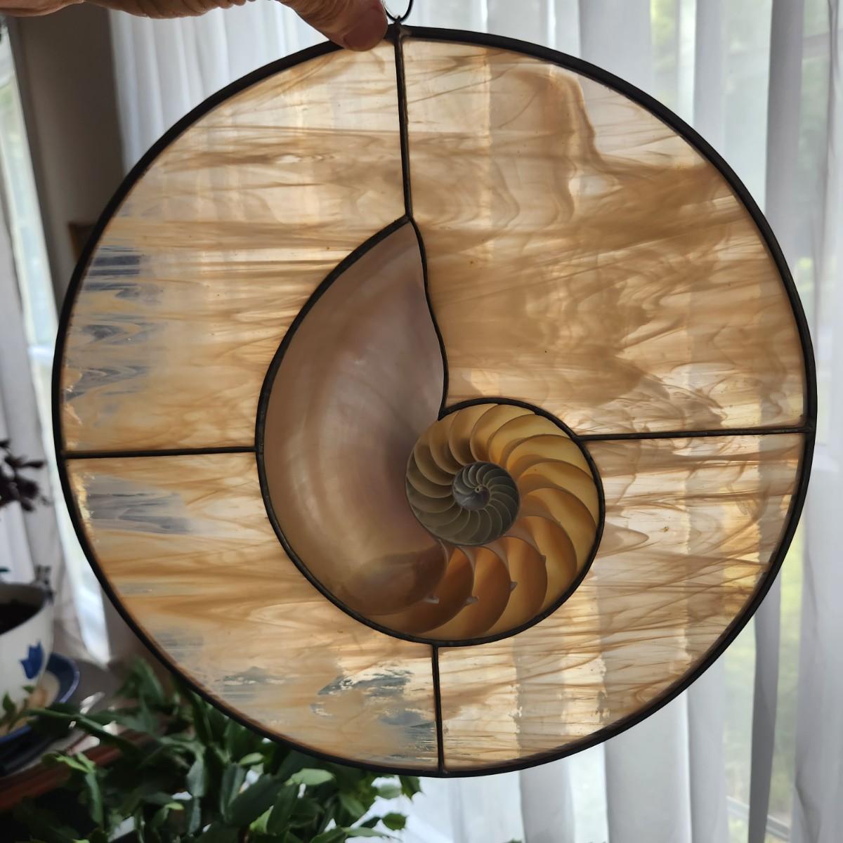 Tiger Nautilus Half shell surrounded by stained leaded glass sun catcher 12"