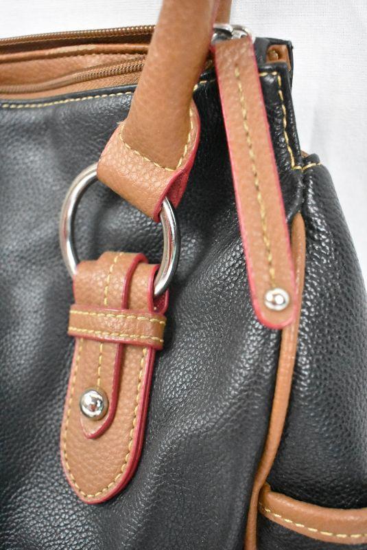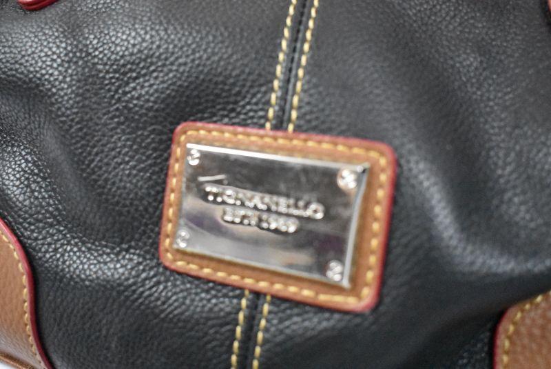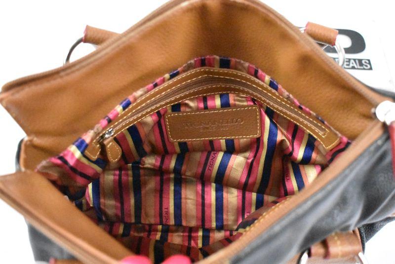 Tignanello Leather Purse Handbag. Black with Brown Trim. Striped inside