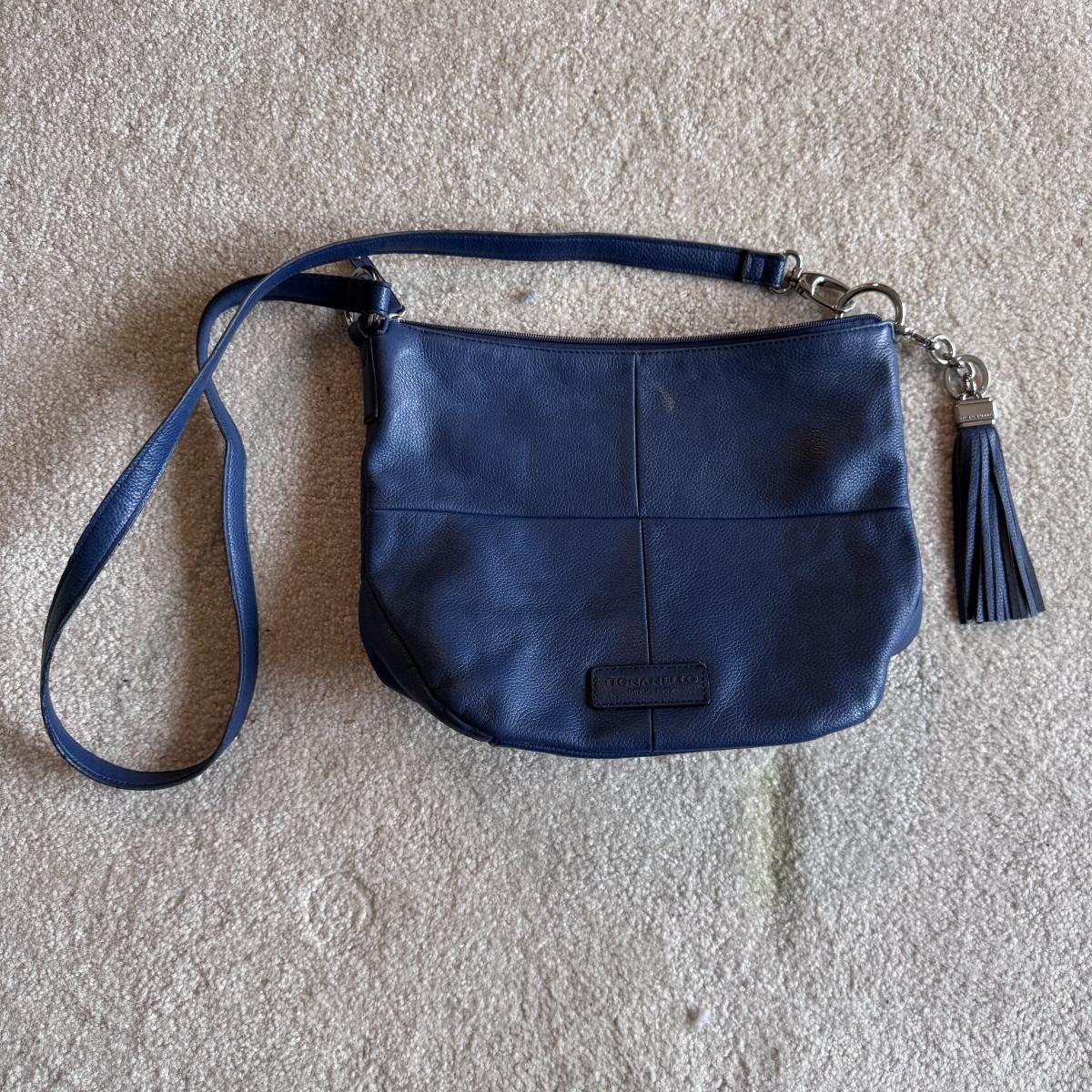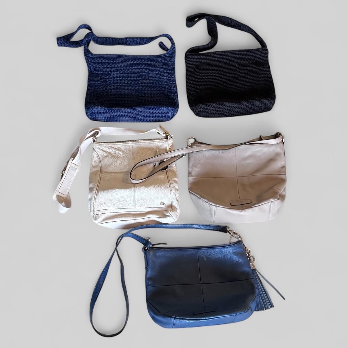 This lot includes five crossbody bags, with three being from The Sak, and two from Tignanello. The blue Tignanello crossbody has a few small white stains on it - see pictures included. The largest bag is the white “The Sak” bag that measures 11” x 4” x 12”H, not including the strap. The strap is adjustable. Shipping available.