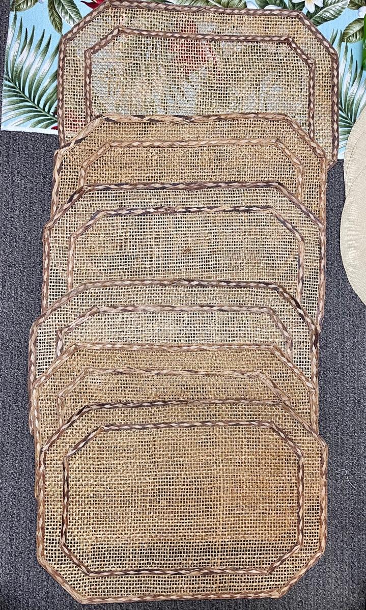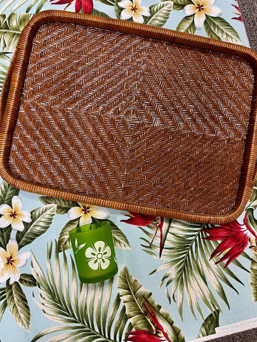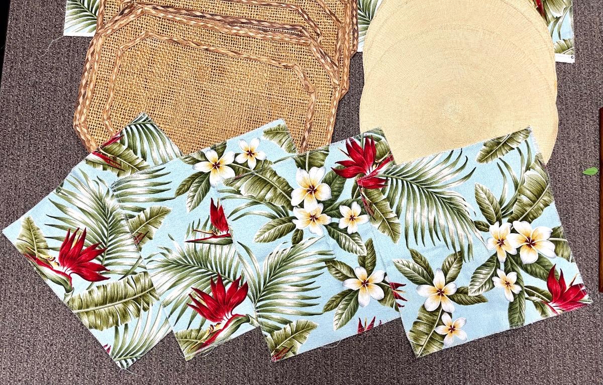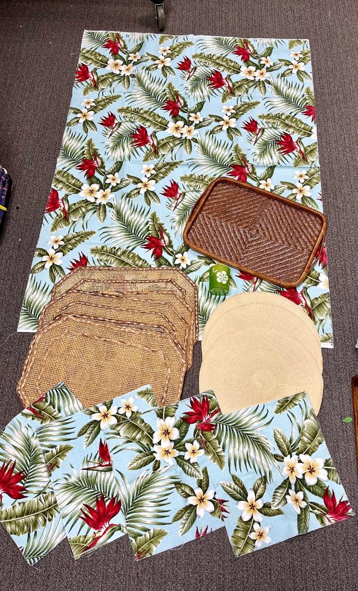 Tiki luau decor, ““ tropical material, placemats, basket, candle holder