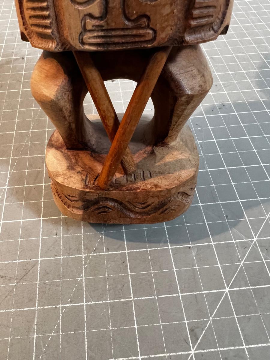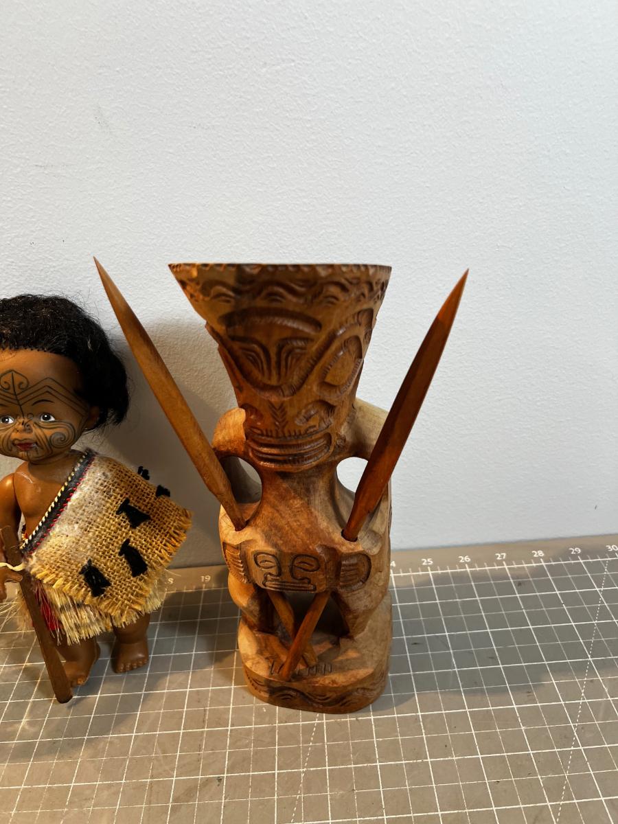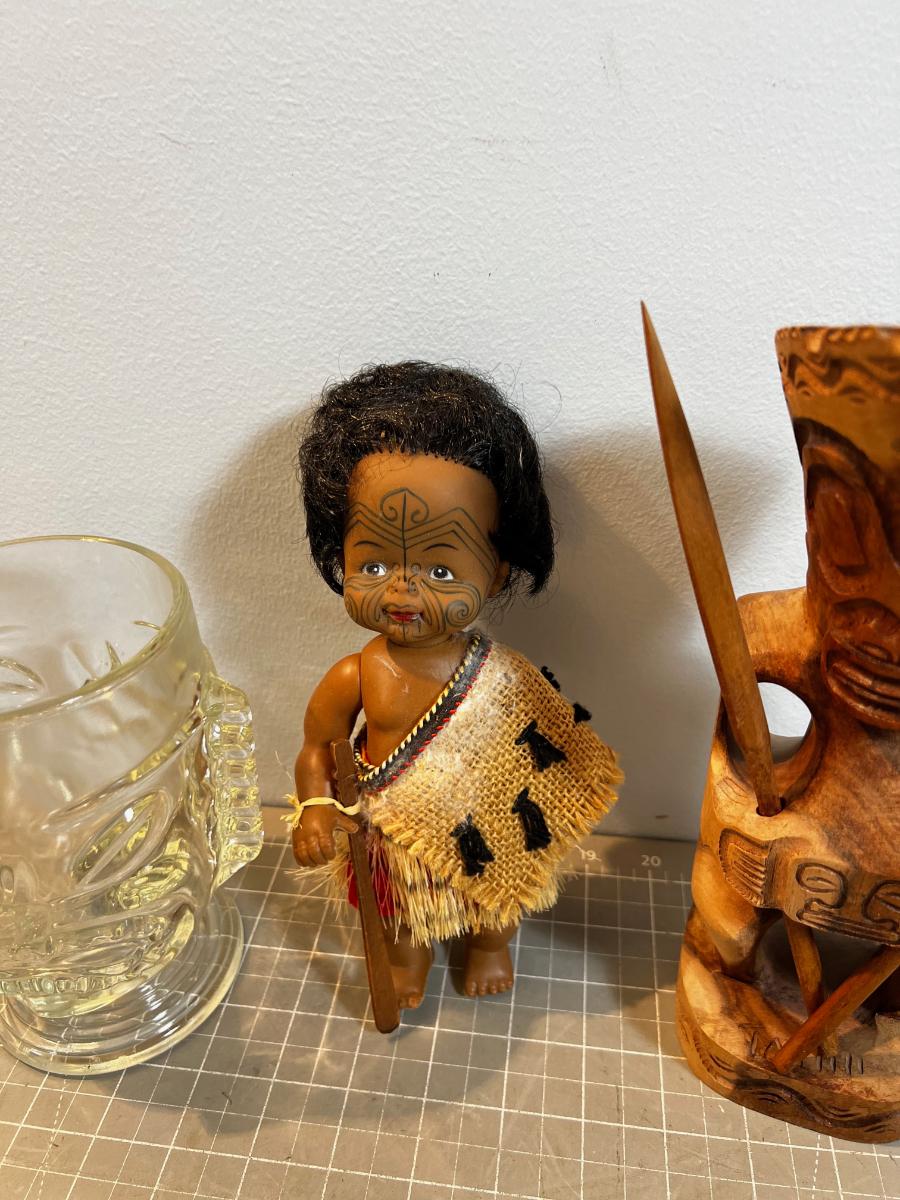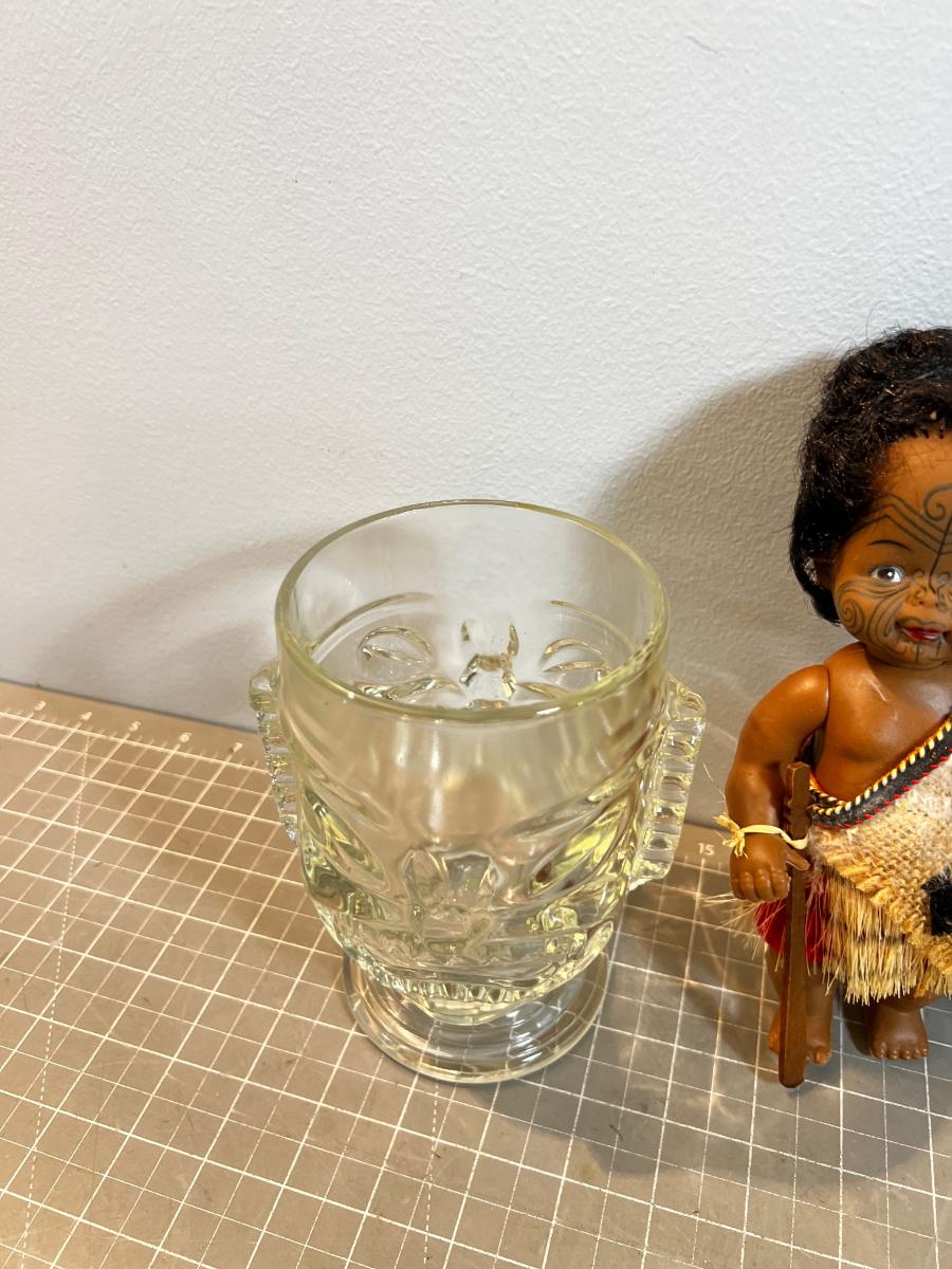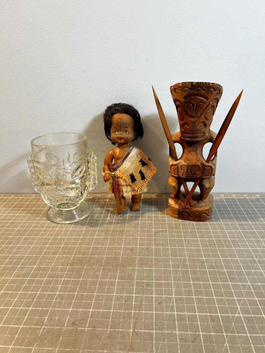 Tiki Wood Carved, Moria Dolls, Glass Tiki Mug