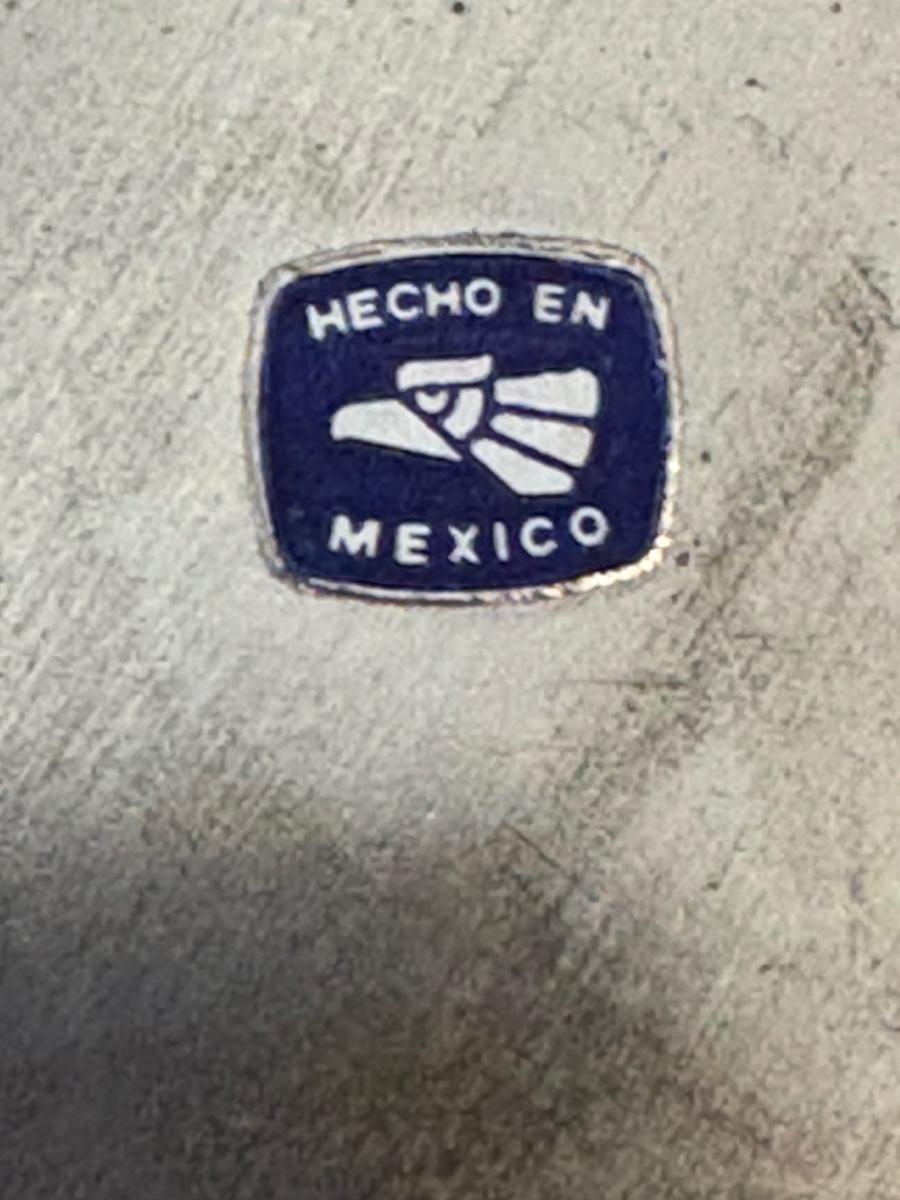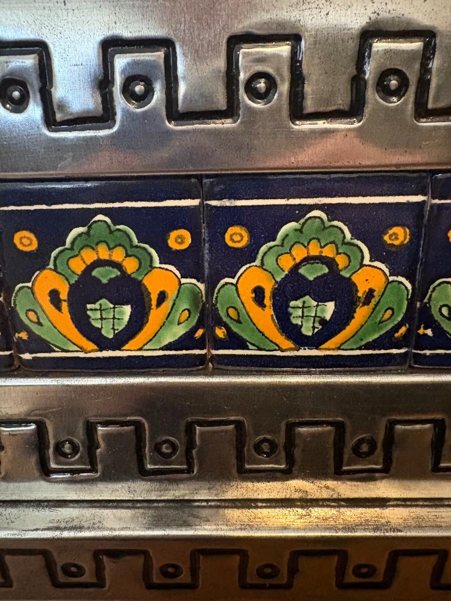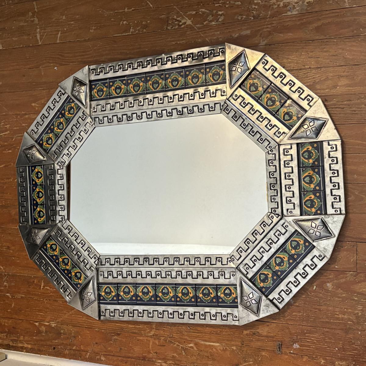 Unique mirror has a folk art feel and is labeled ‘hecho en Mexico’. It measures 33.5” x 25”H at widest points. Made from a lightweight metal and tiles. Shipping available. Shipping can be costly. We suggest contacting our preferred local shipping provider, Postage Express, with dimensions and getting an estimate before bidding: (828) 255-9250 or shipping@postageexpressnc.com.