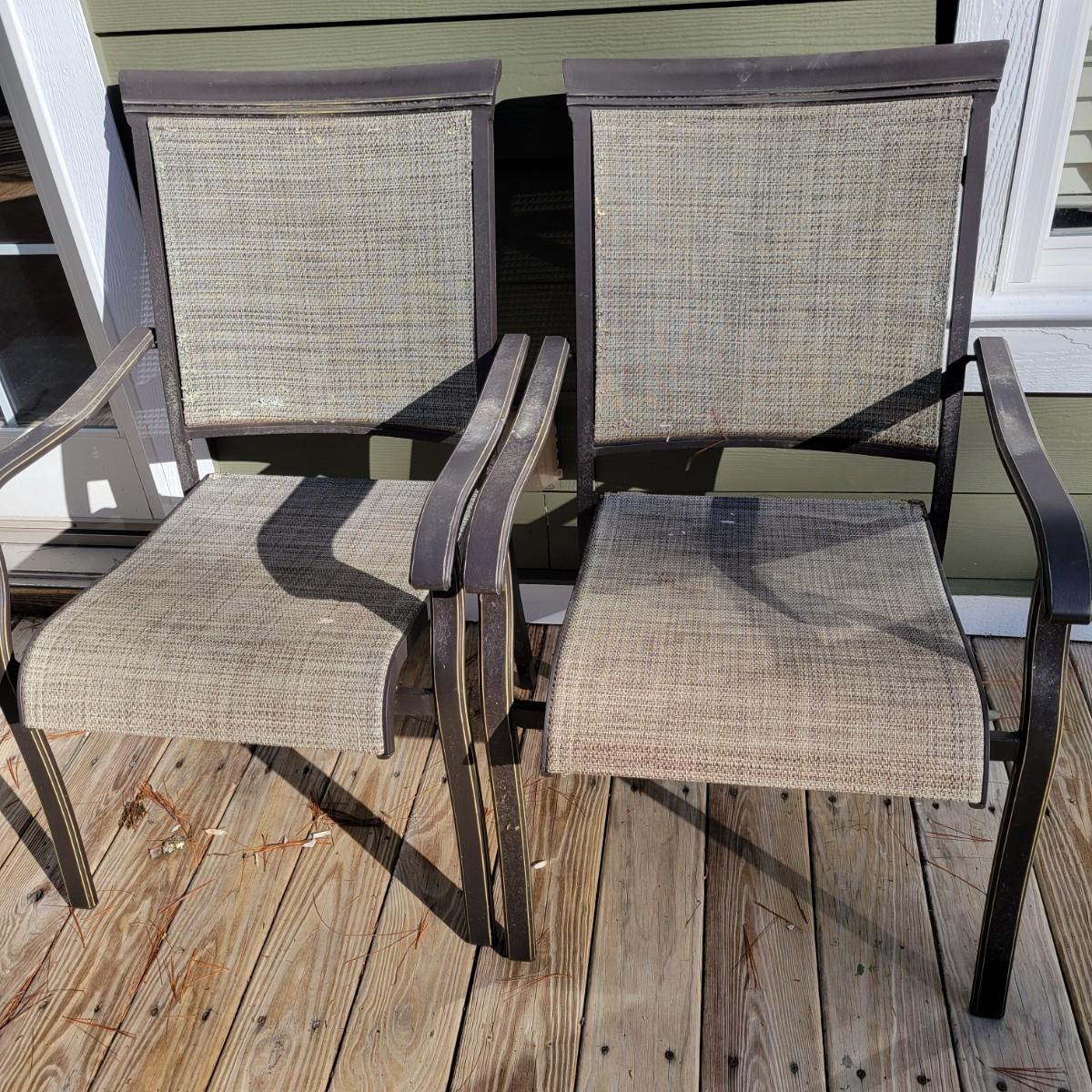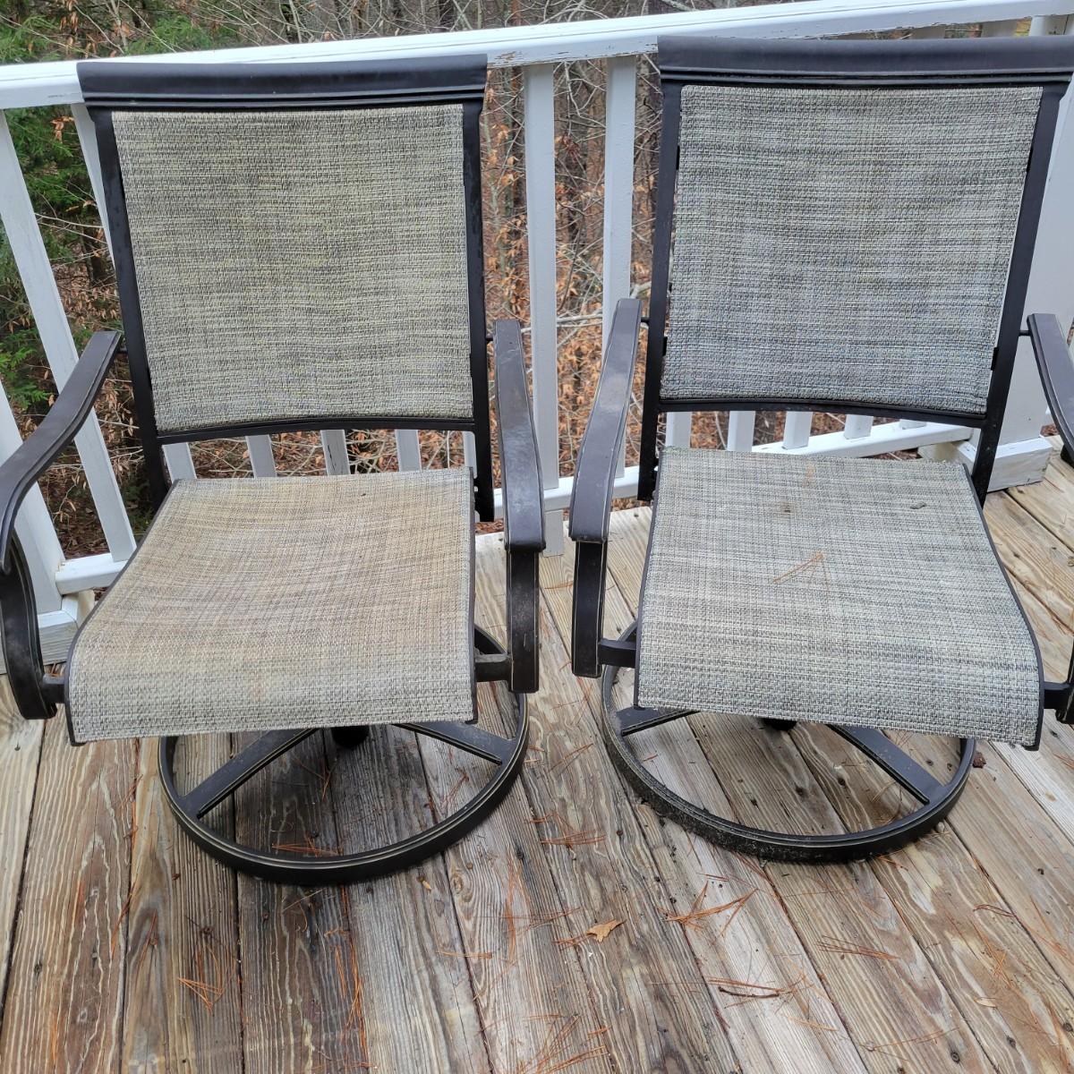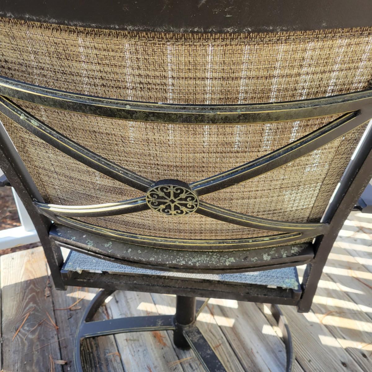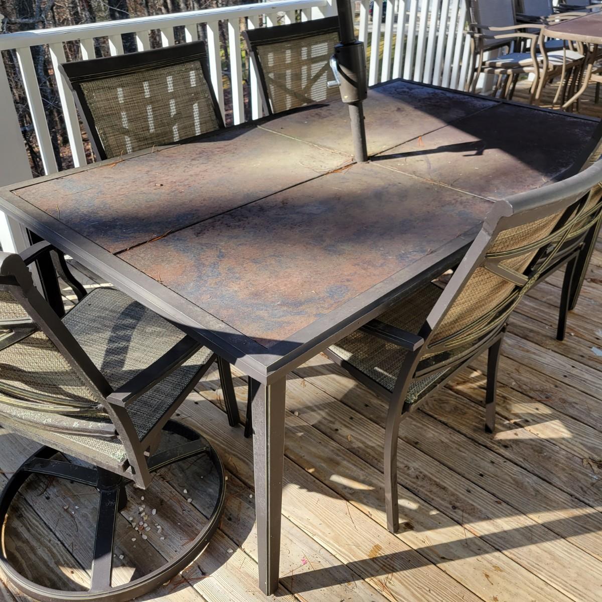 A patio table, chairs and umbrella in good condition. The umbrella and chairs have some lichen growing on them, but otherwise no notable damage. Included is a large patio table with a tile top and metal base. Table measures approximately 68" x 40 x 28.5". Also included is an umbrella that functions as it should, but has no base, and six metal and fabric chairs. Two chairs have a round base and swivel. Local pickup only