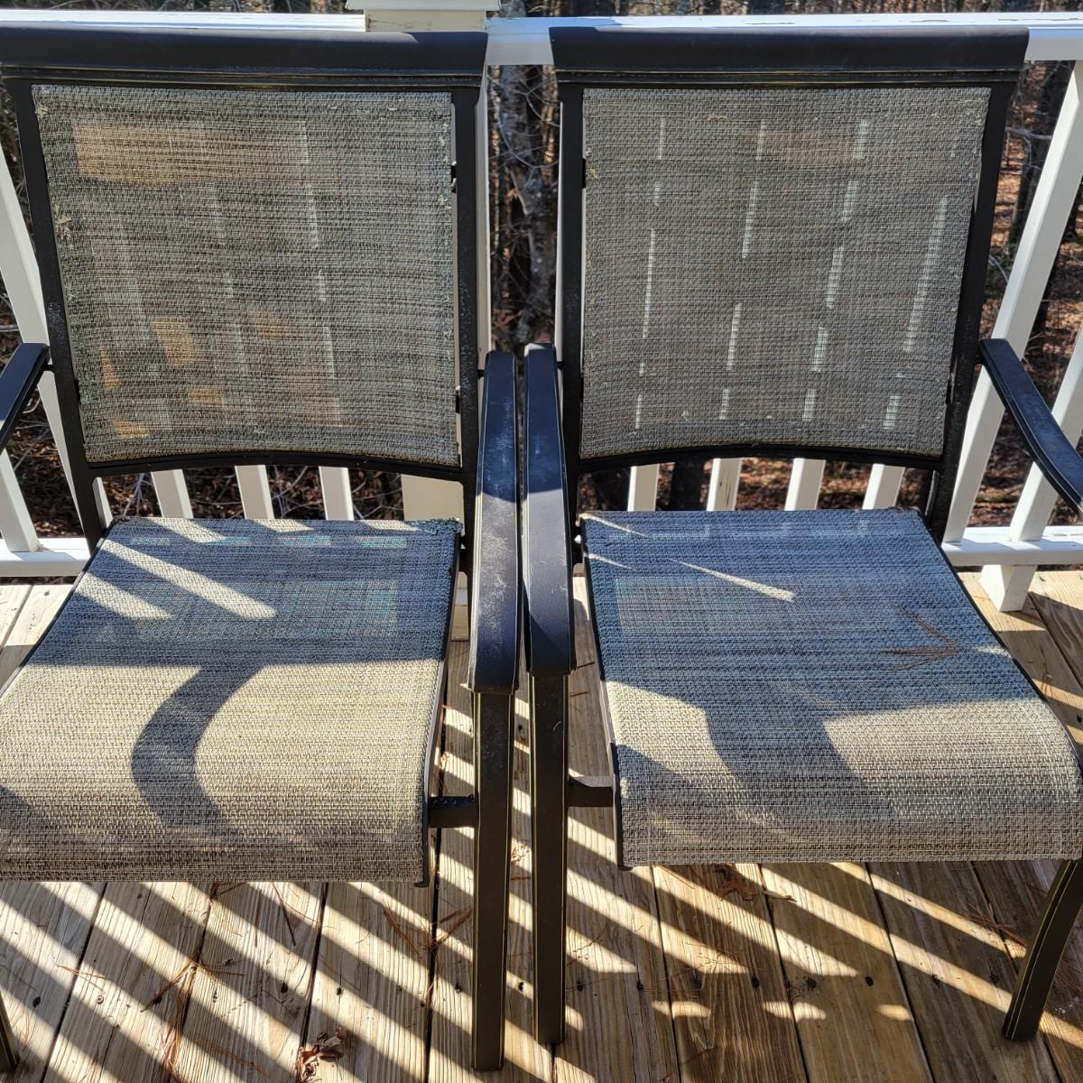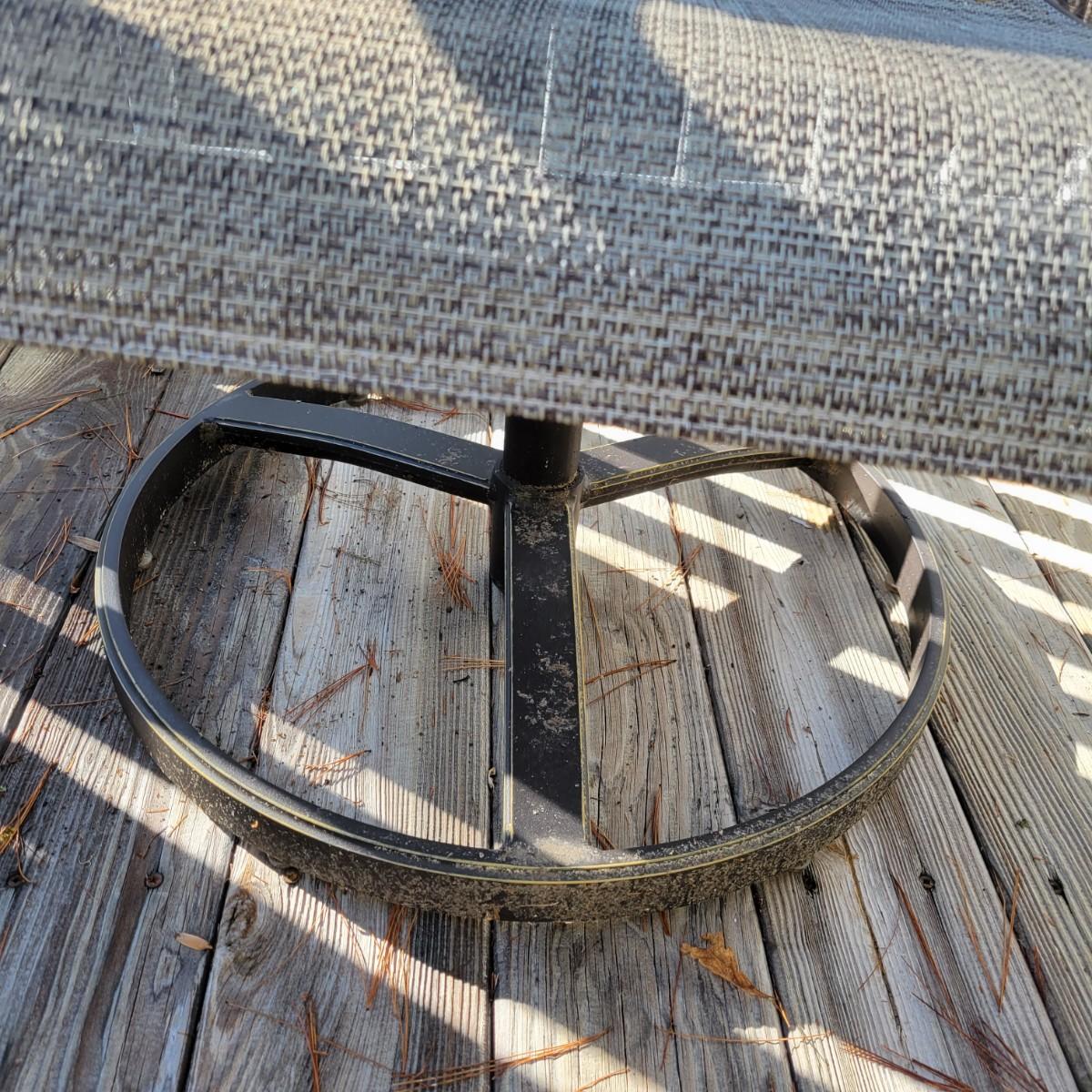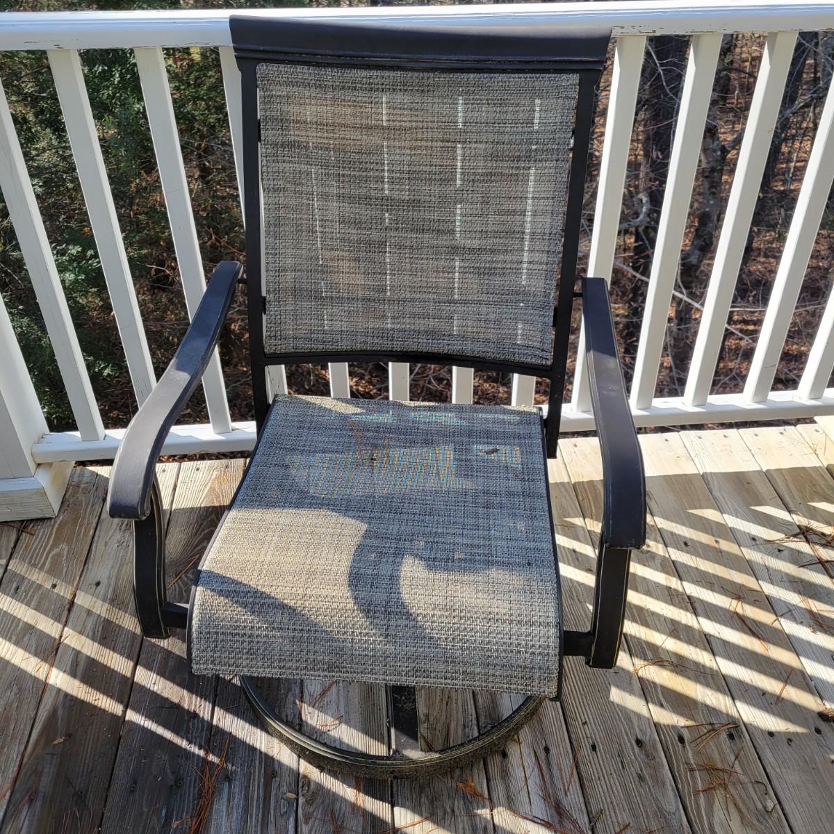 A patio table, chairs and umbrella in good condition. The umbrella and chairs have some lichen growing on them, but otherwise no notable damage. Included is a large patio table with a tile top and metal base. Table measures approximately 68" x 40 x 28.5". Also included is an umbrella that functions as it should, but has no base, and six metal and fabric chairs. Two chairs have a round base and swivel. Local pickup only