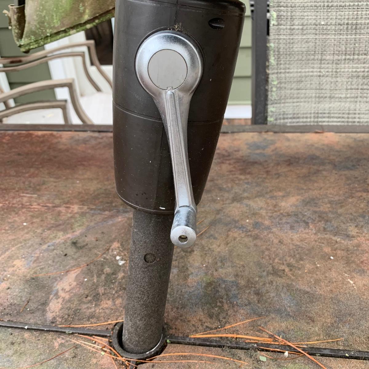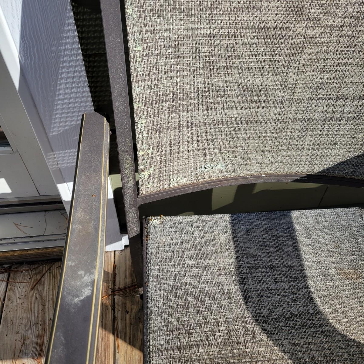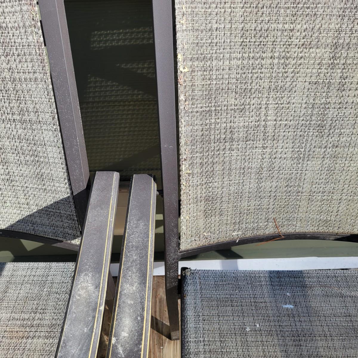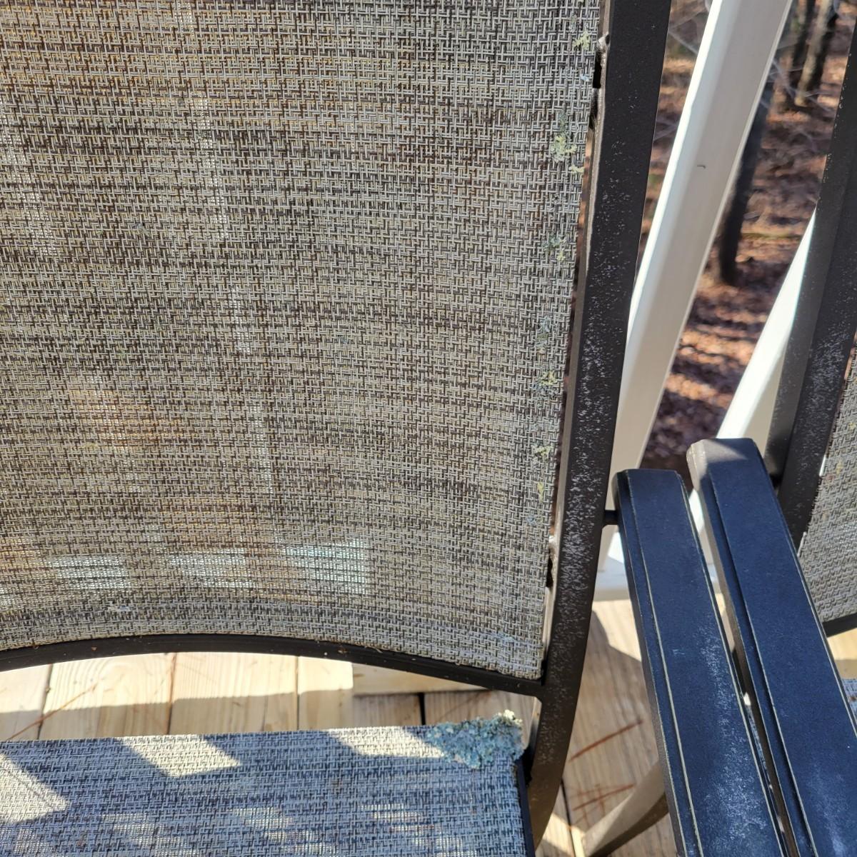 A patio table, chairs and umbrella in good condition. The umbrella and chairs have some lichen growing on them, but otherwise no notable damage. Included is a large patio table with a tile top and metal base. Table measures approximately 68" x 40 x 28.5". Also included is an umbrella that functions as it should, but has no base, and six metal and fabric chairs. Two chairs have a round base and swivel. Local pickup only