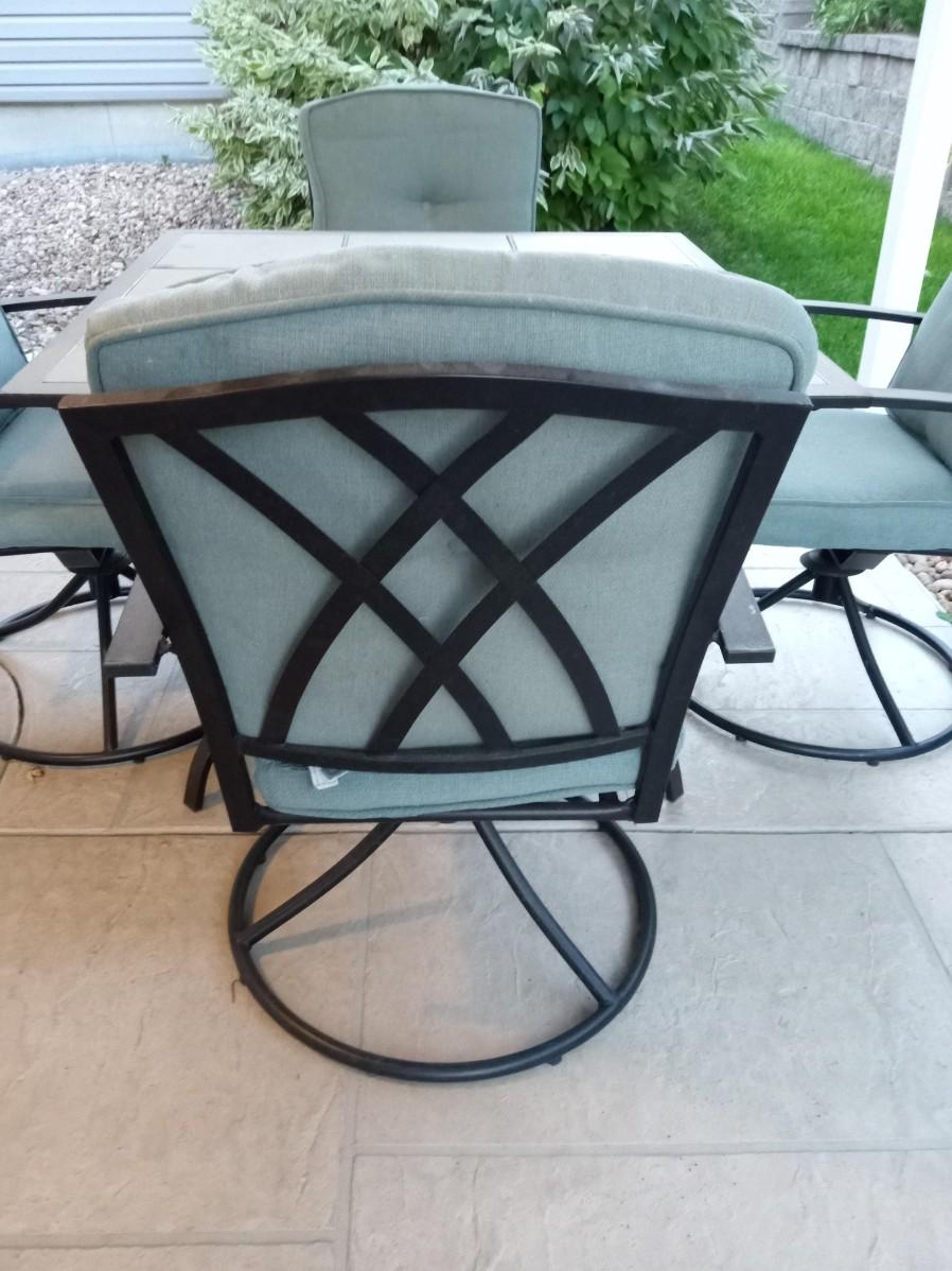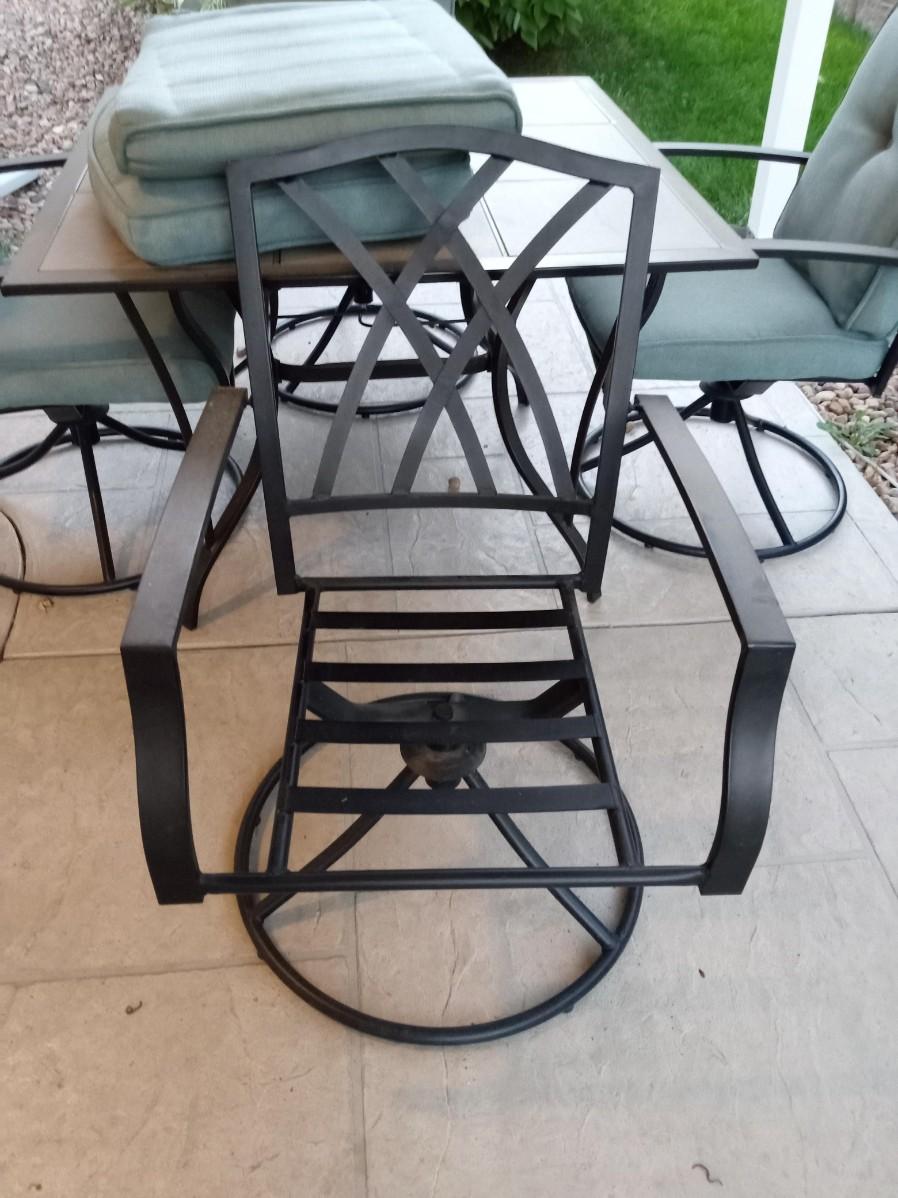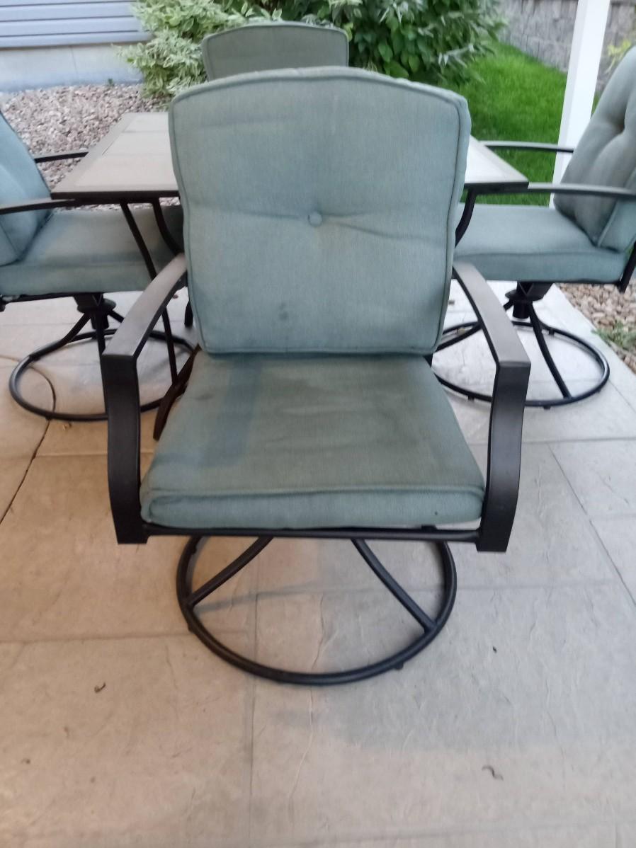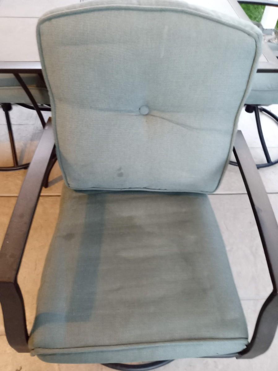 THE CUSHIONS HAVE BEEN LEFT OUT IN THE WEATHER AND NEED TO BE CLEANED BUT THEY ARE IN GOOD SHAPE