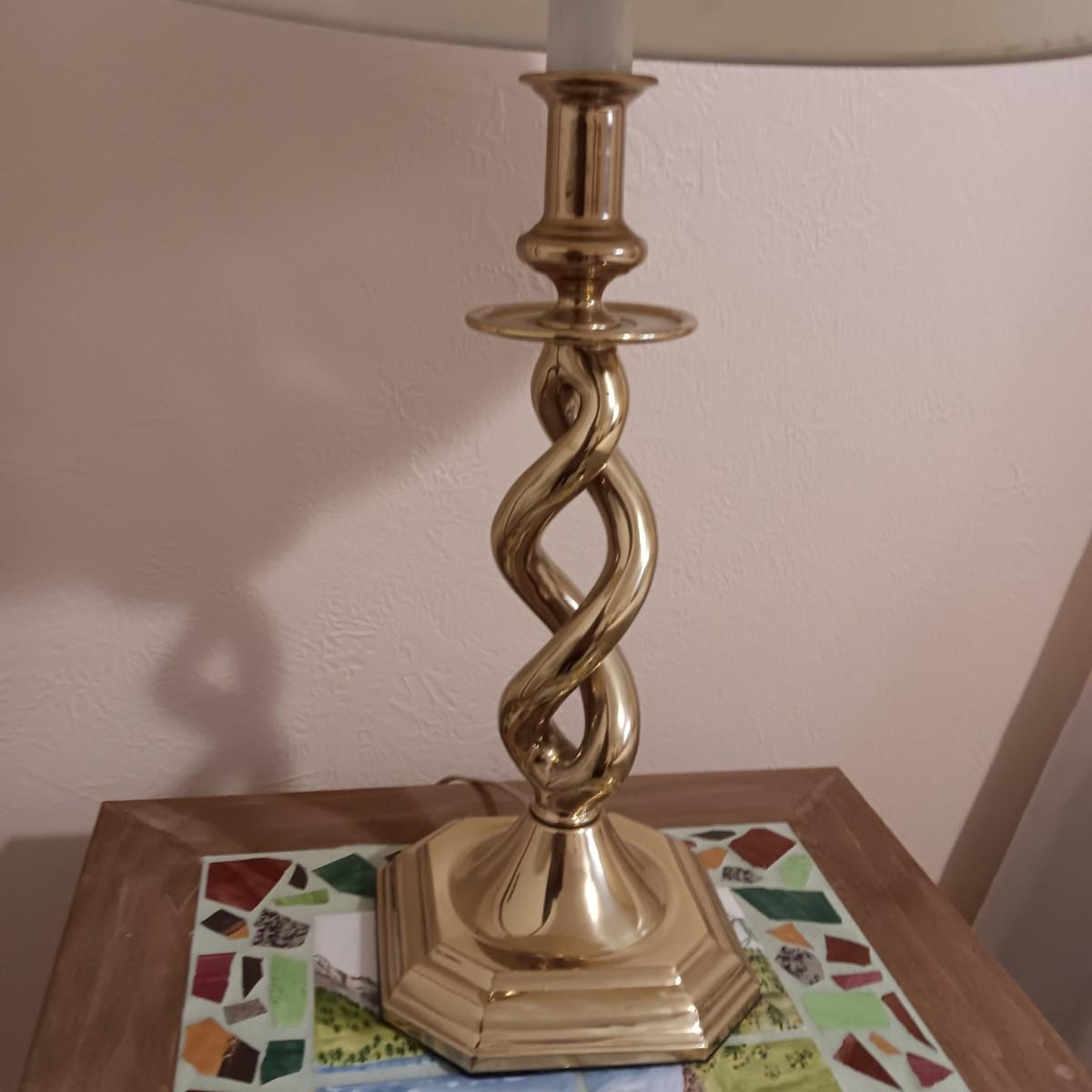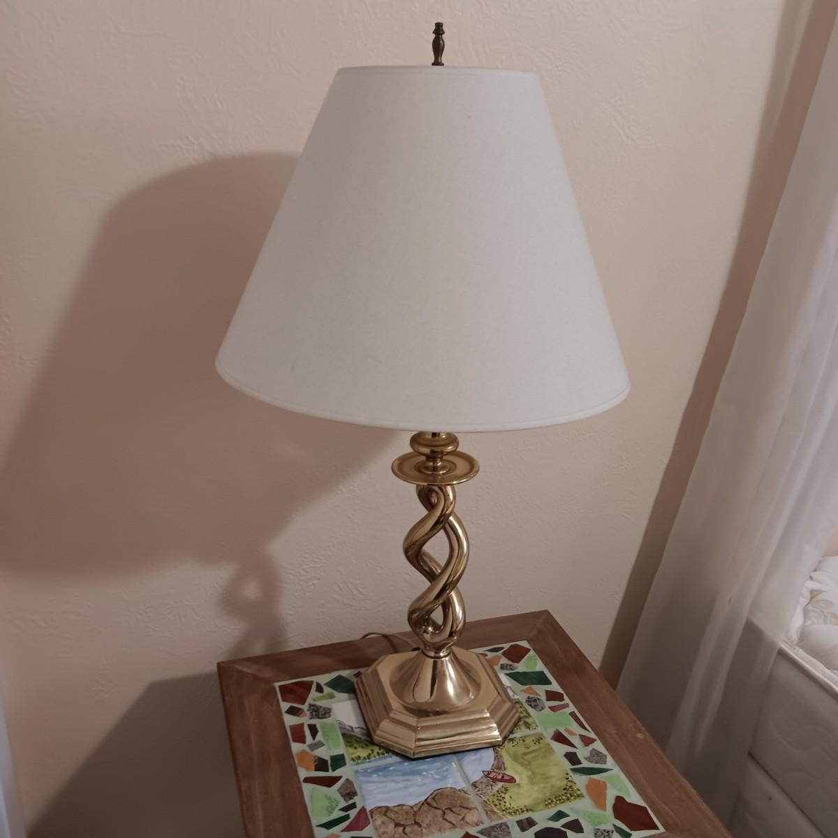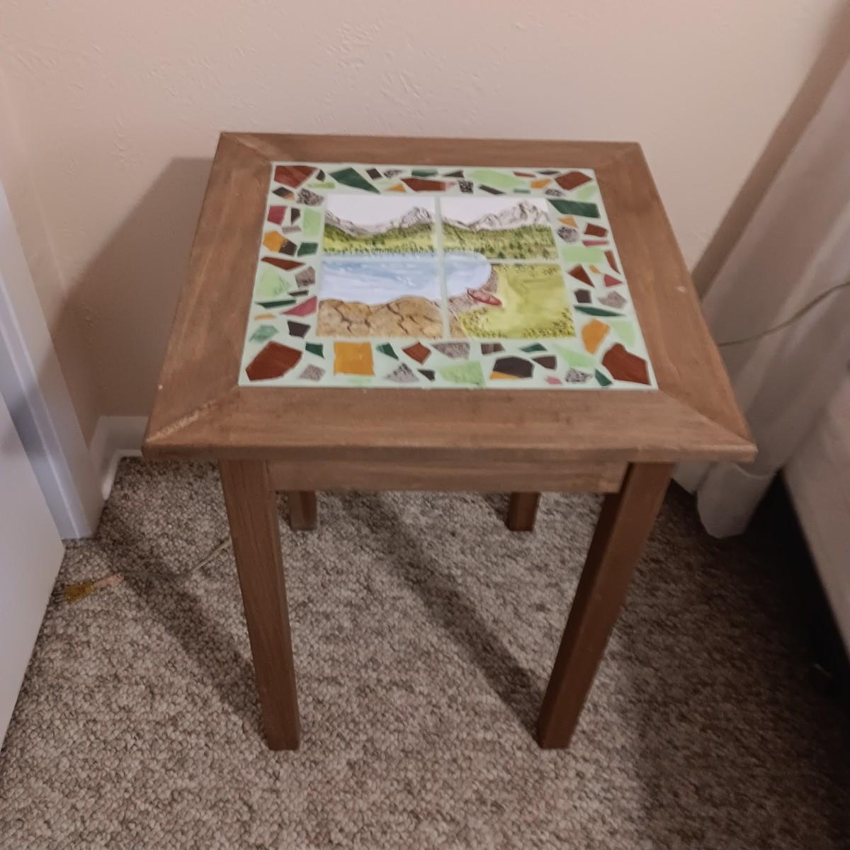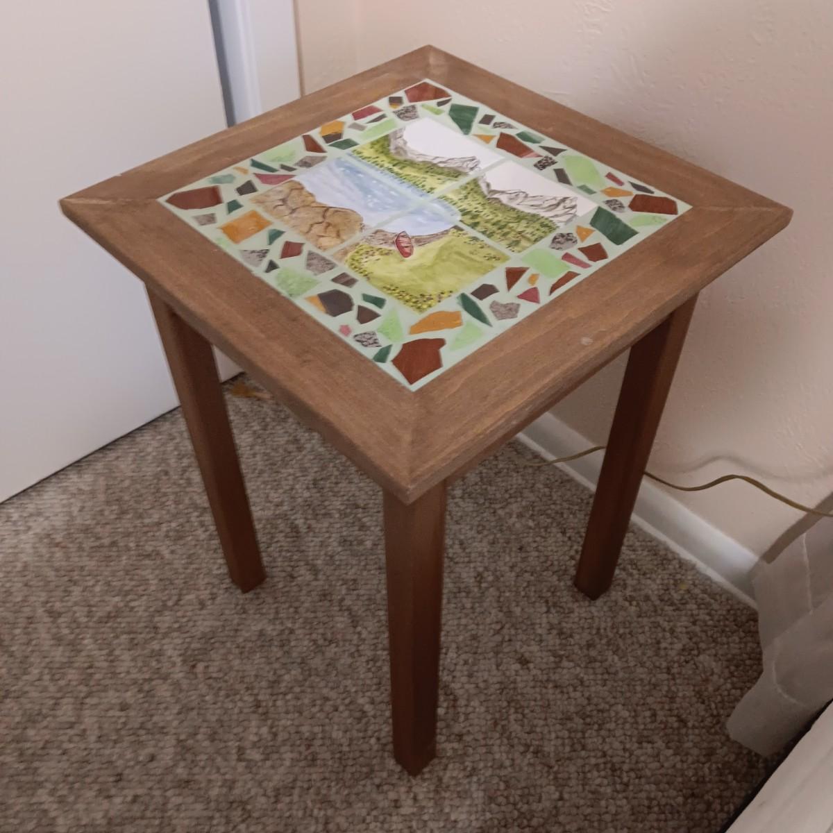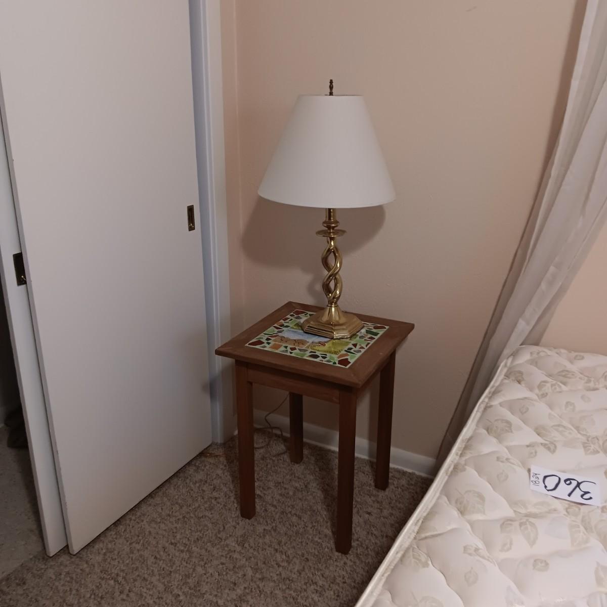 TILE TOP SIDE TABLE AND A BRASS BASE LAMP