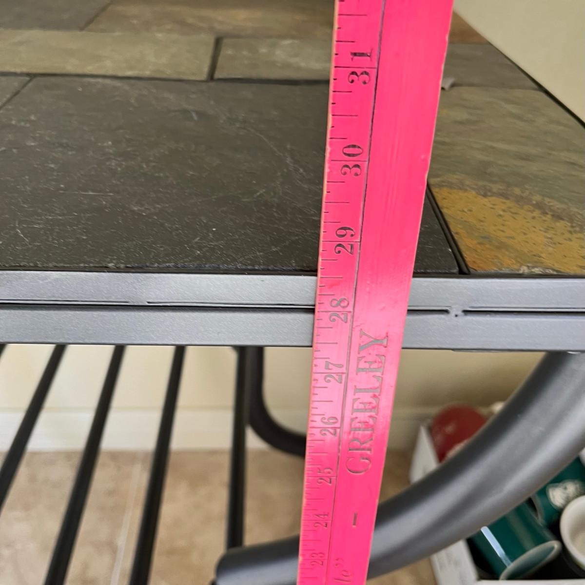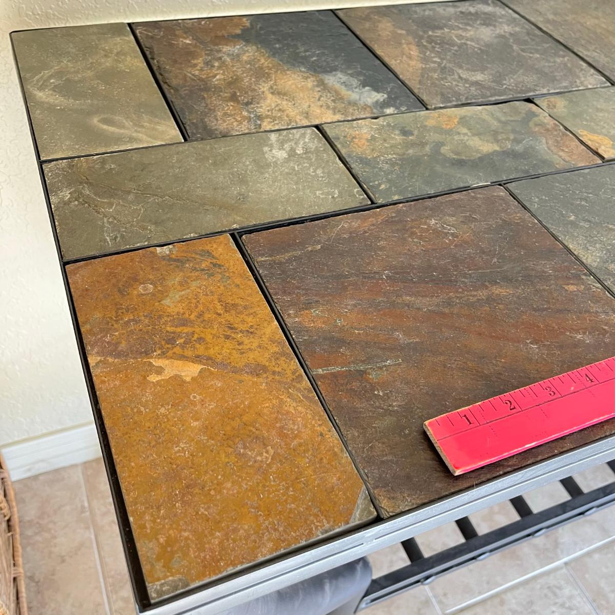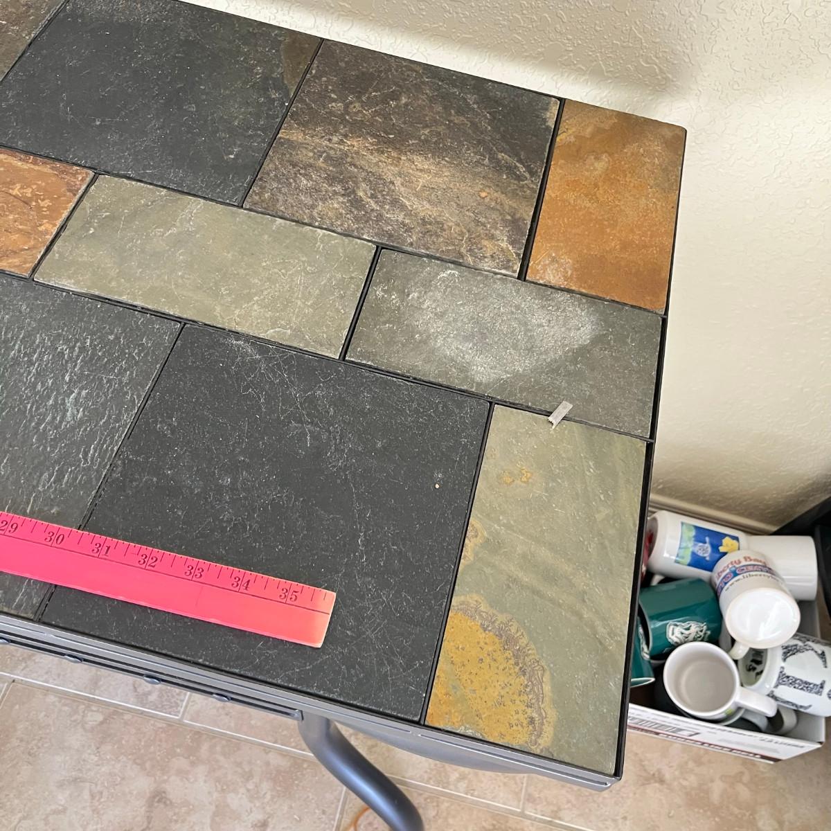 Very sturdy metal table! The tiles are set in & are not attached, so when moving it you will have to take the tiles out first!