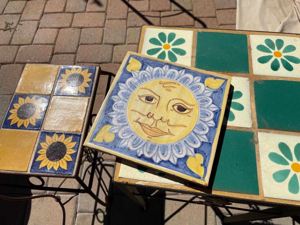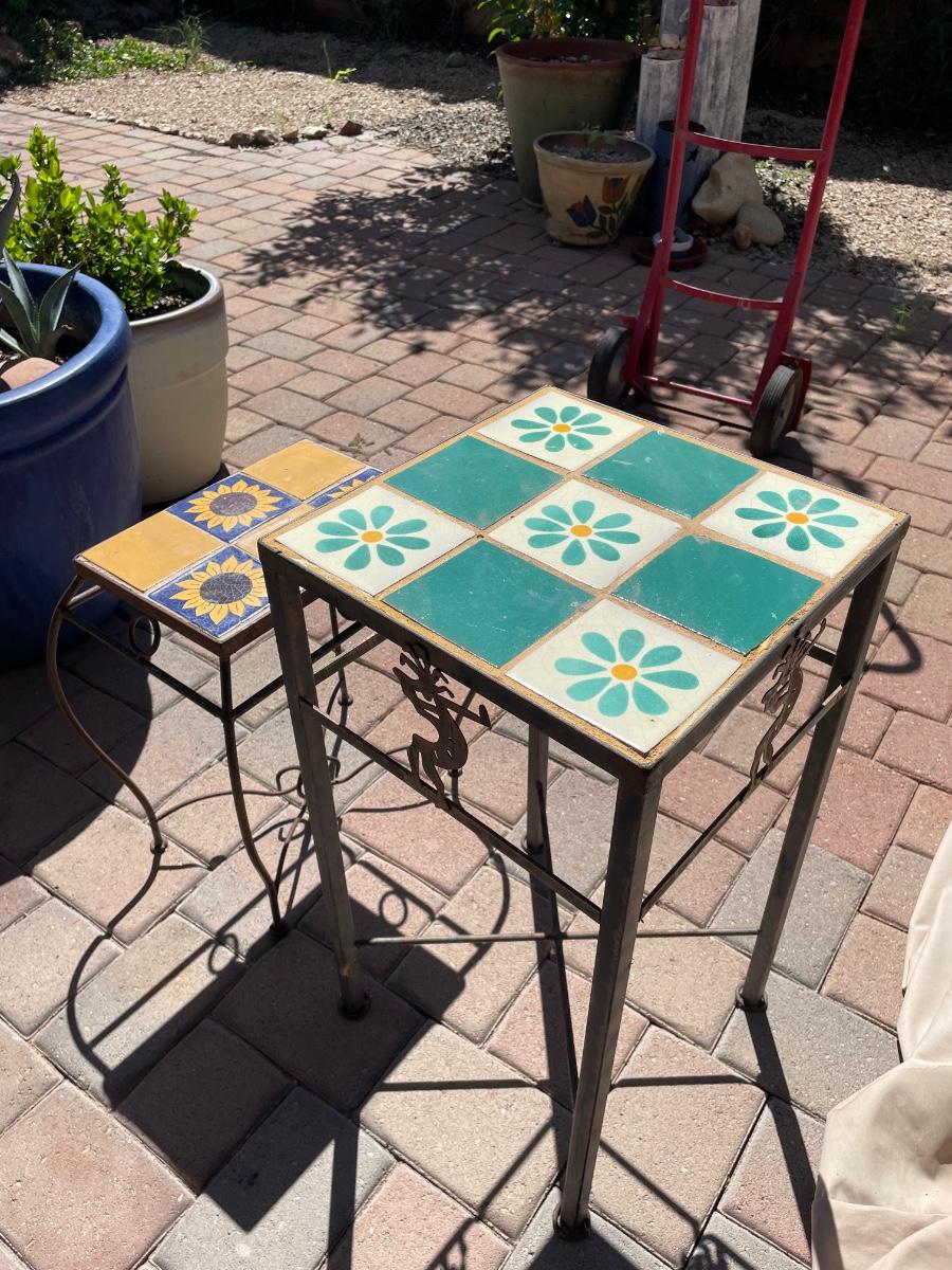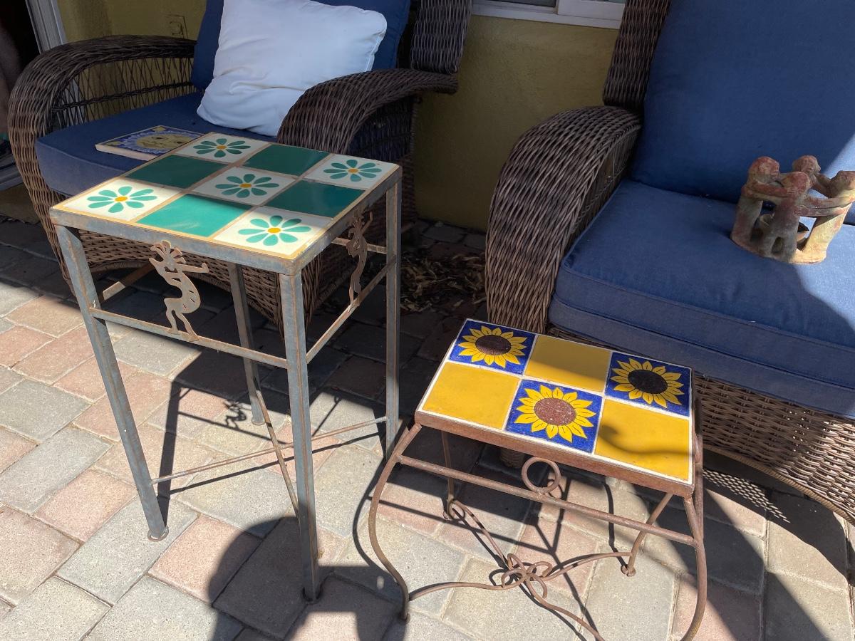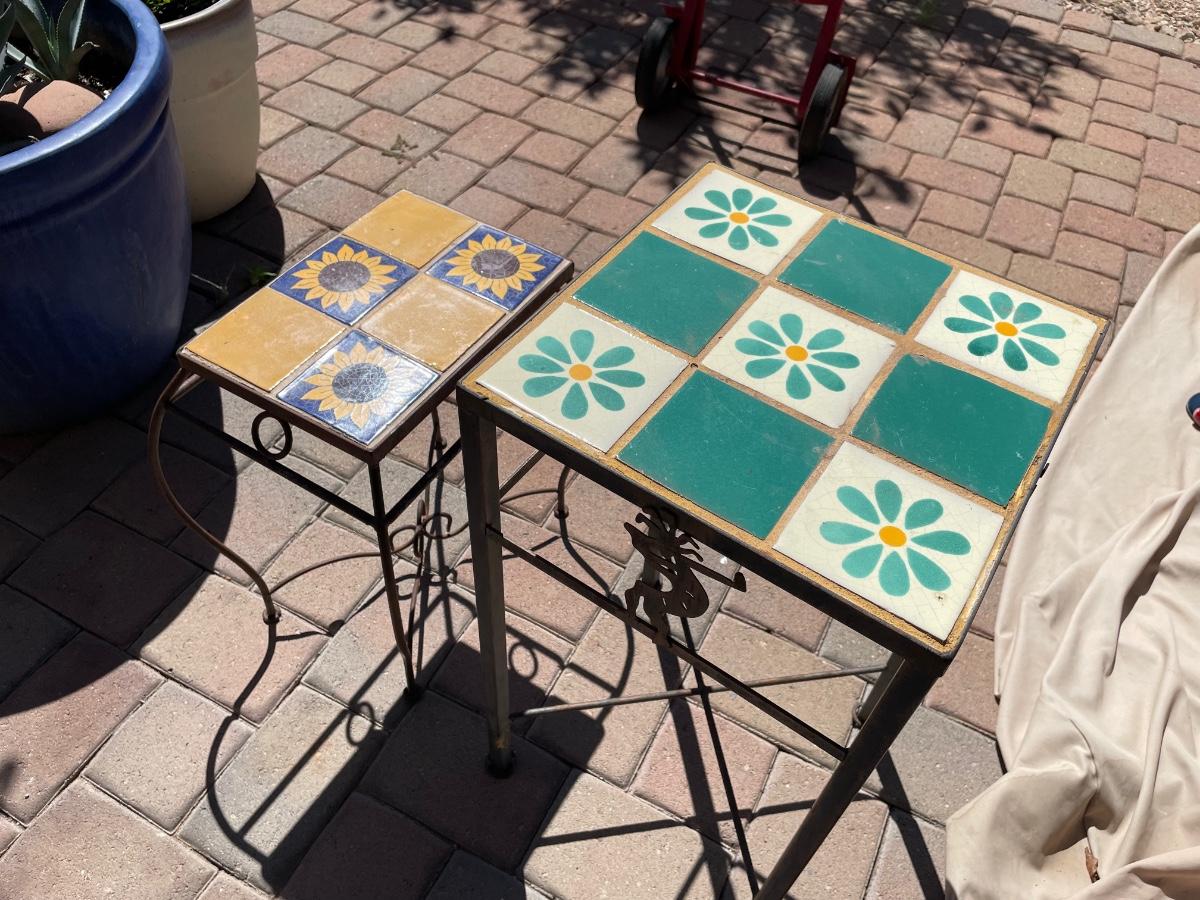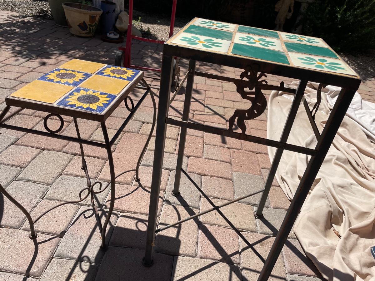 Two tile top outdoor plant stands or side tables in good condition. (Tallest= 13.5inX13.5inX25.5in) (shorter= 14inX10inX18in)