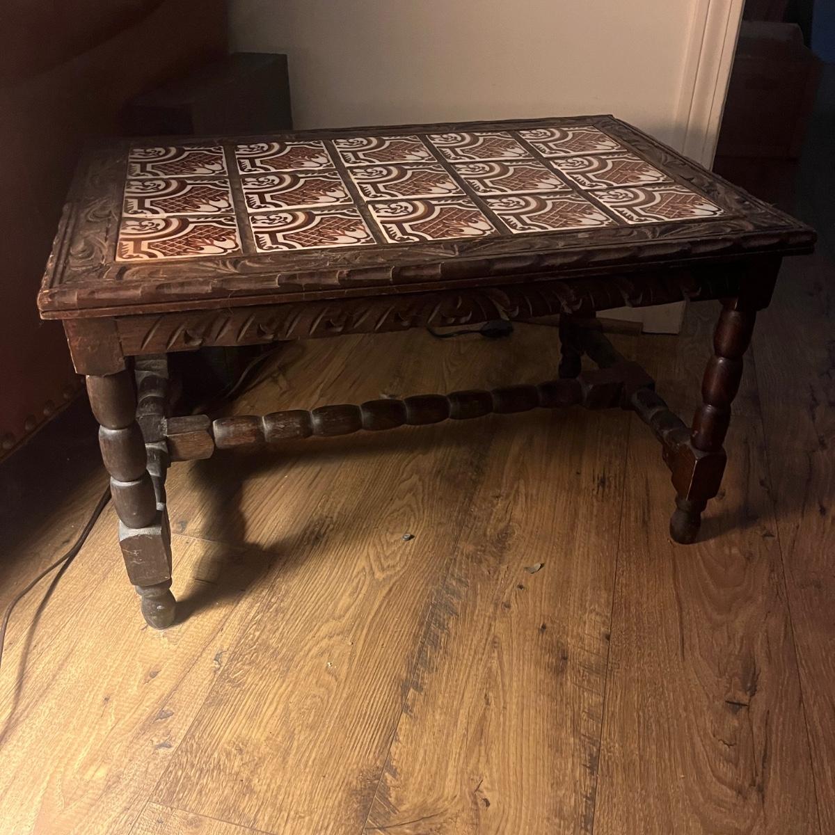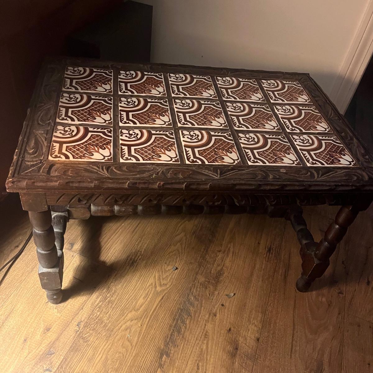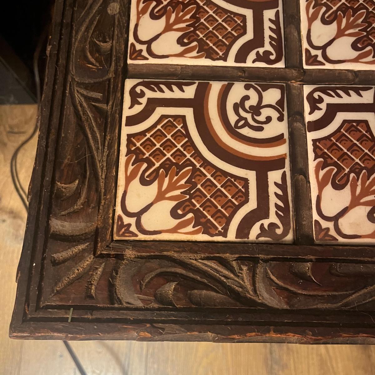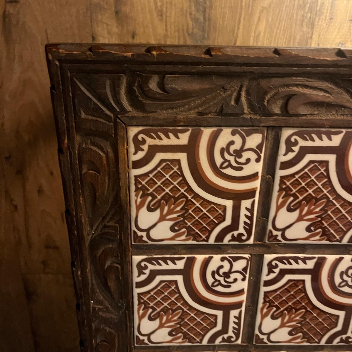 This wooden end table has 12 ceramic tile on the top and what appears to be carved wood on the sides and top edge. Table measures 18” x 27.5” x 16”H.