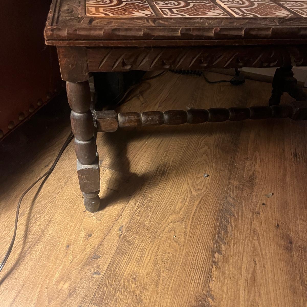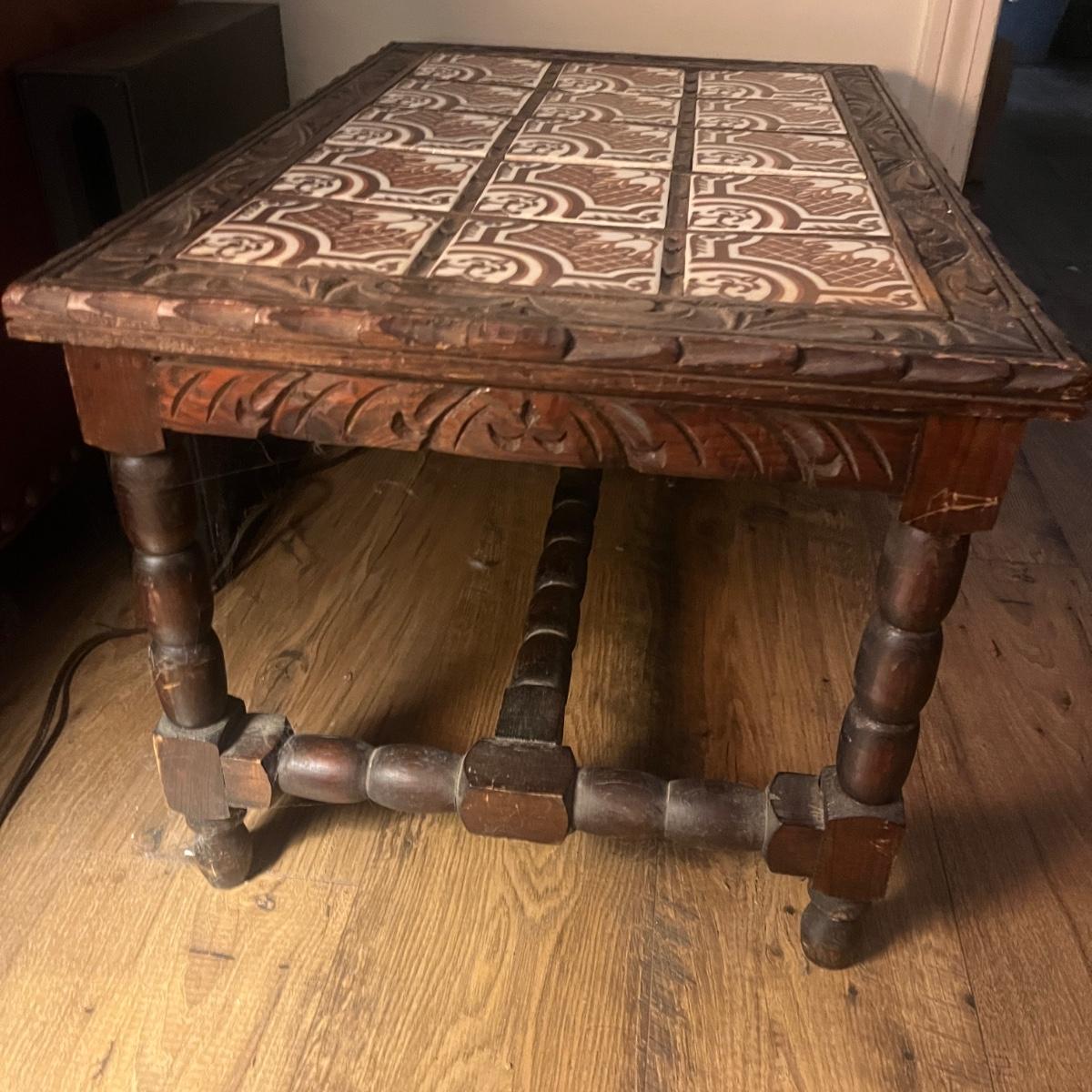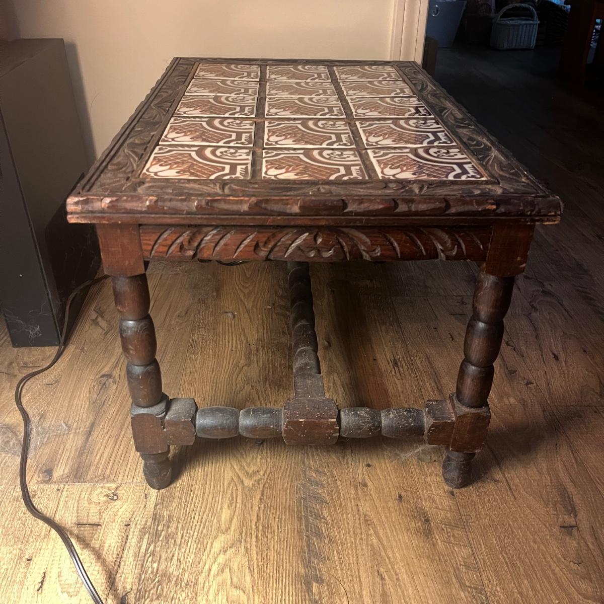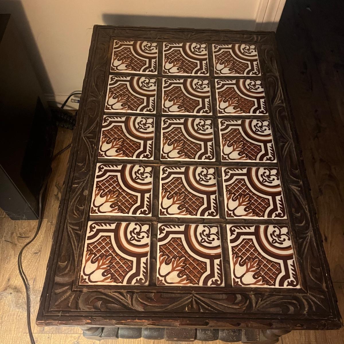 This wooden end table has 12 ceramic tile on the top and what appears to be carved wood on the sides and top edge. Table measures 18” x 27.5” x 16”H.
