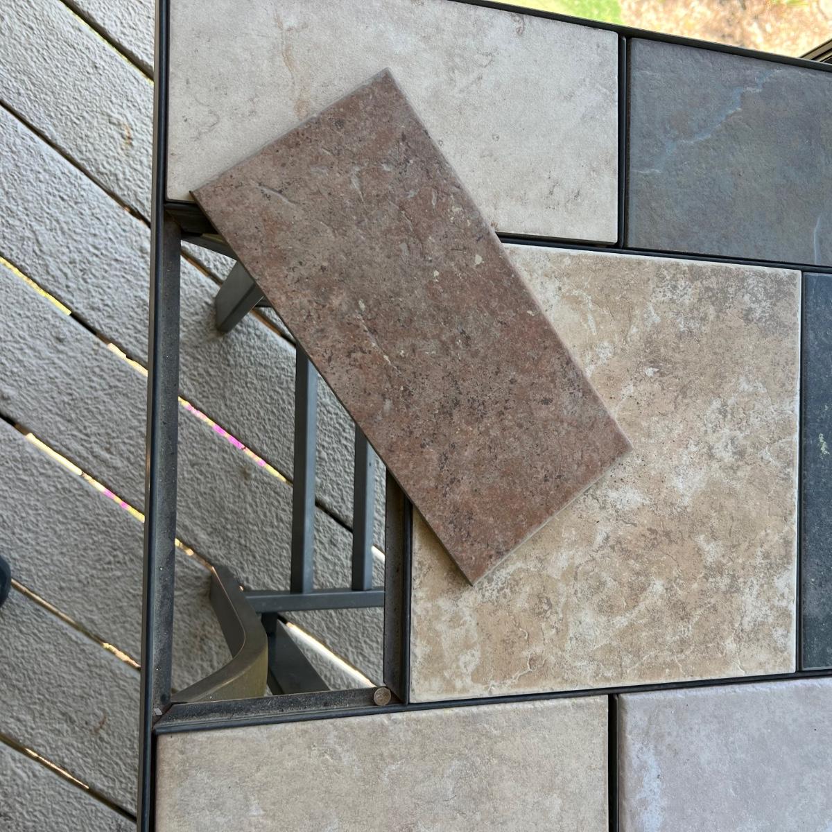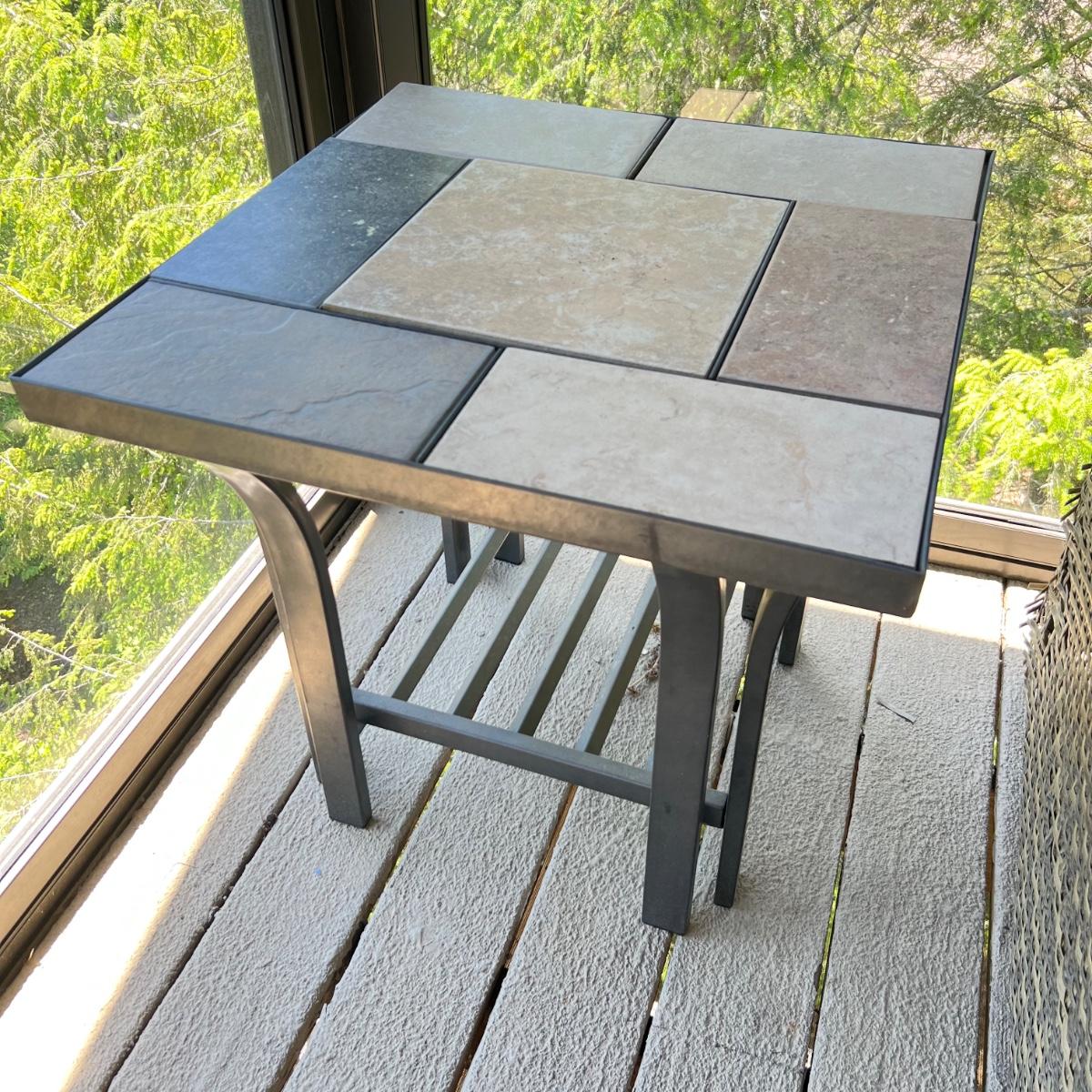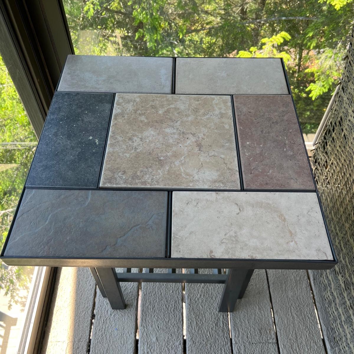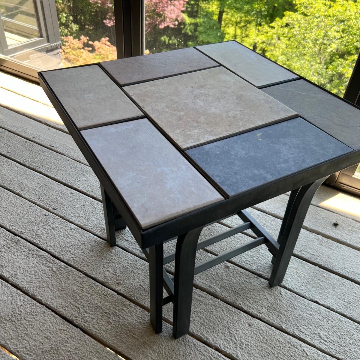 This attractive black metal framed table has replaceable tiles for its tabletop.