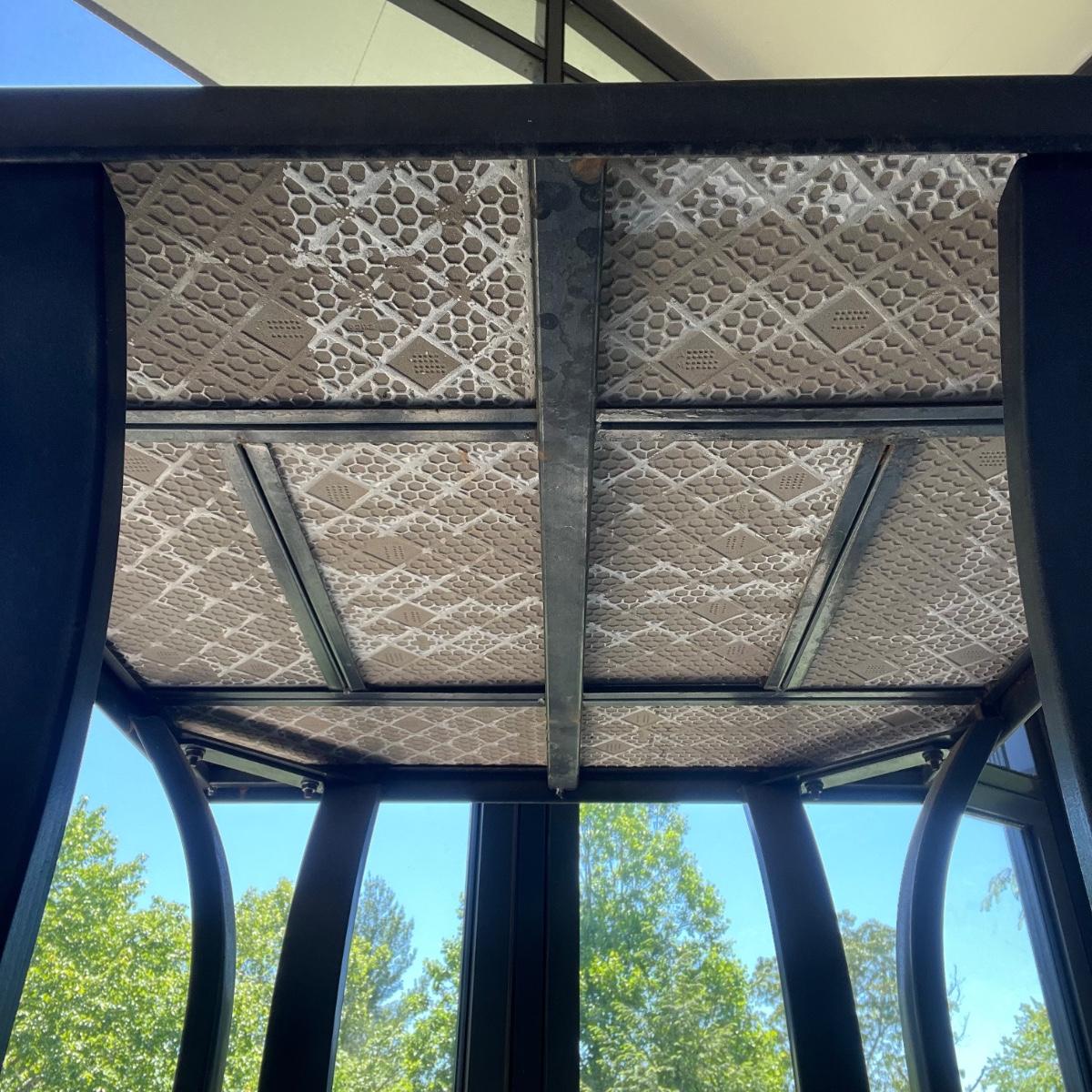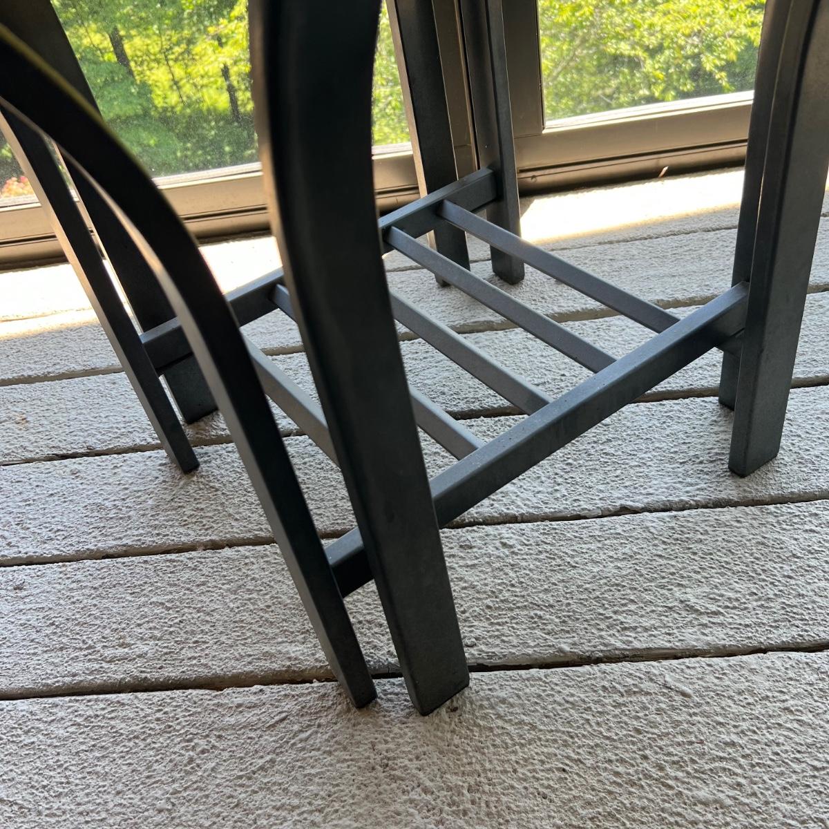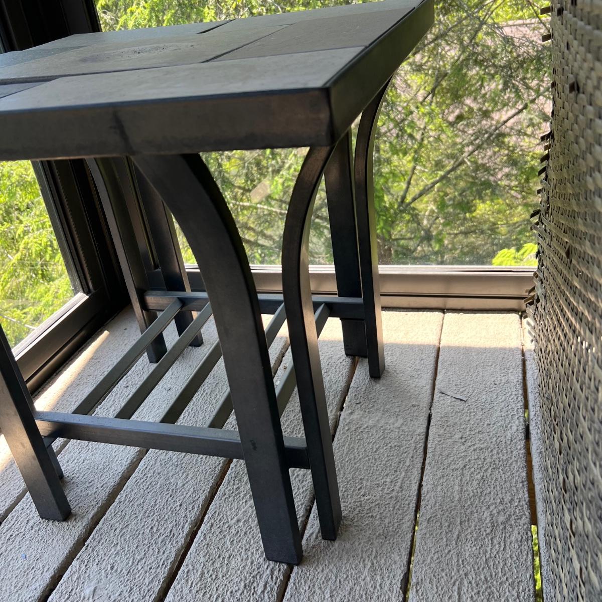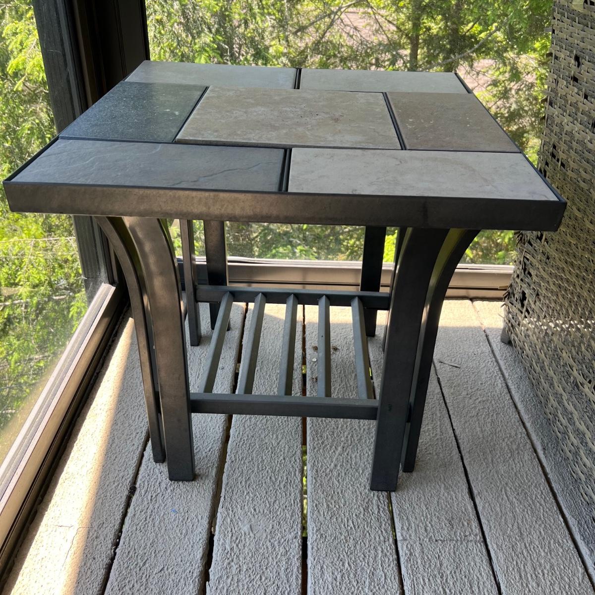 This attractive black metal framed table has replaceable tiles for its tabletop.