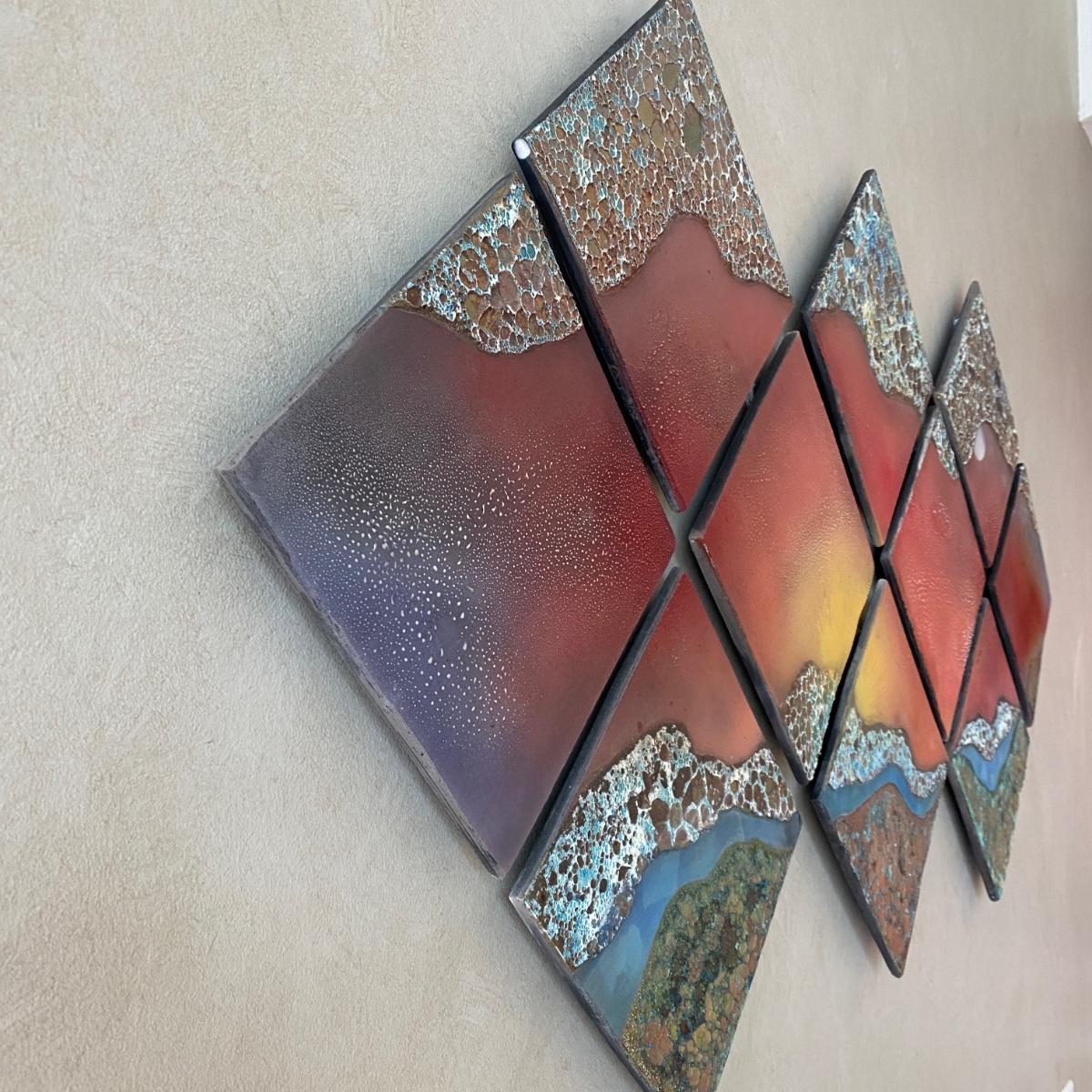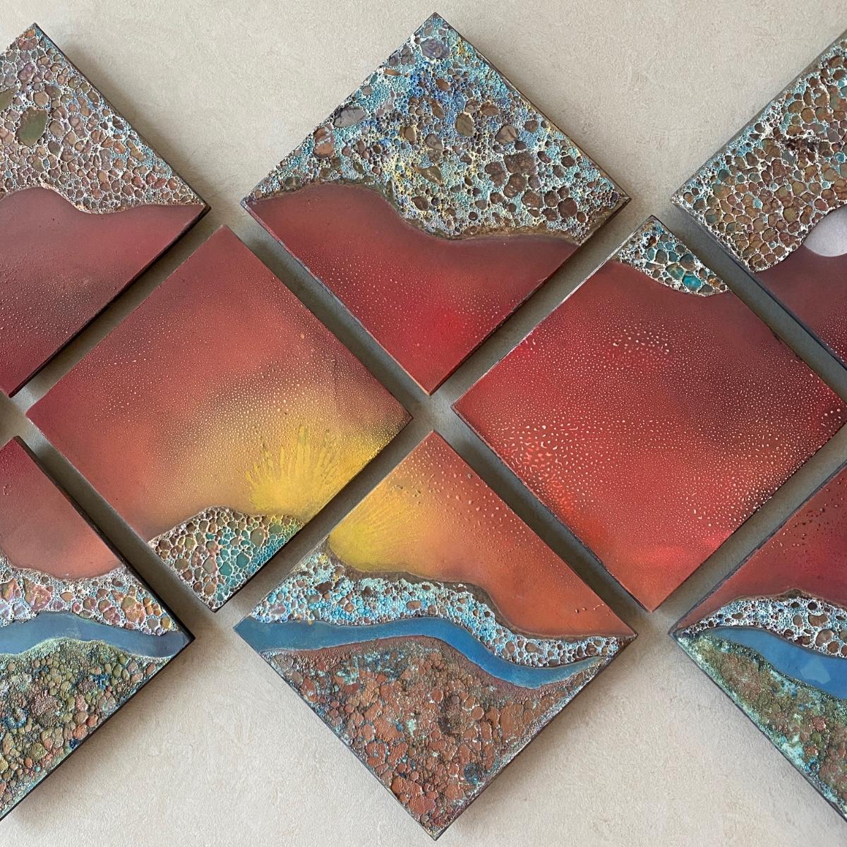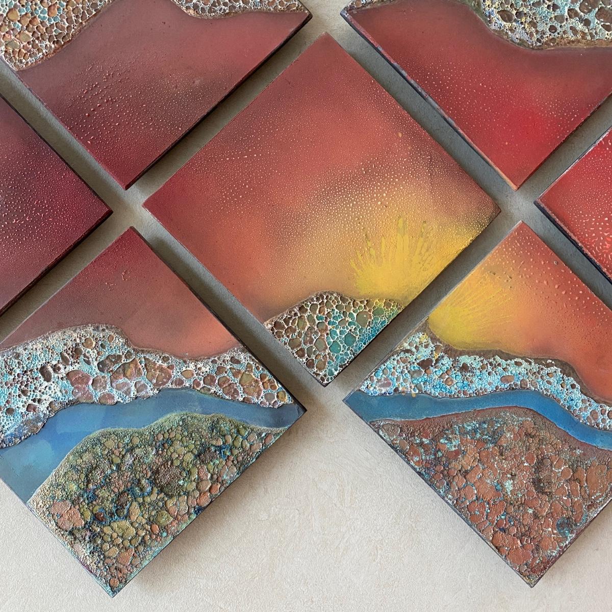 Steven Forbes-DeSoule has created 10 numbered Raku tiles to make a magnificent wall display. Hang horizontal or vertical for a different look. Each tile measures 8.5” x 8.5”. All have numbers and one has a signature. One tile has a small chip on side. See photos. It's hardly noticeable when piece is hanging. Shipping available.