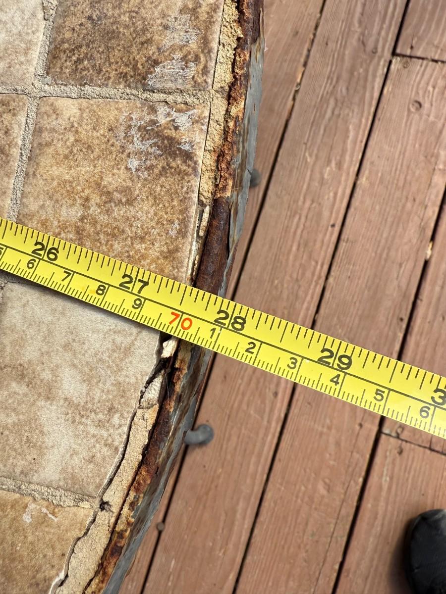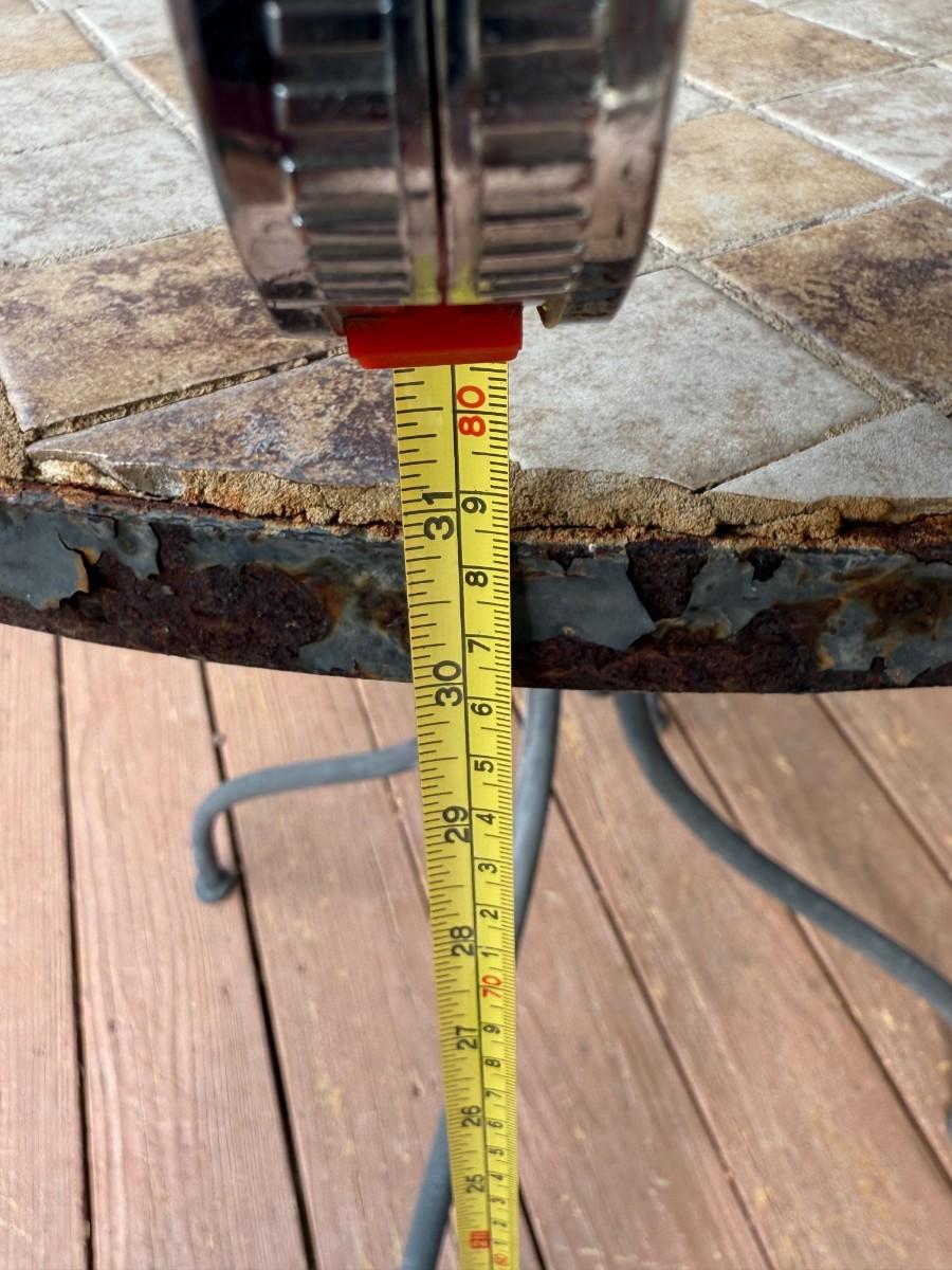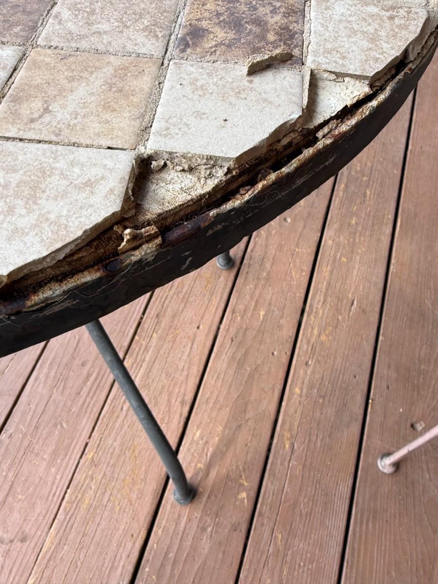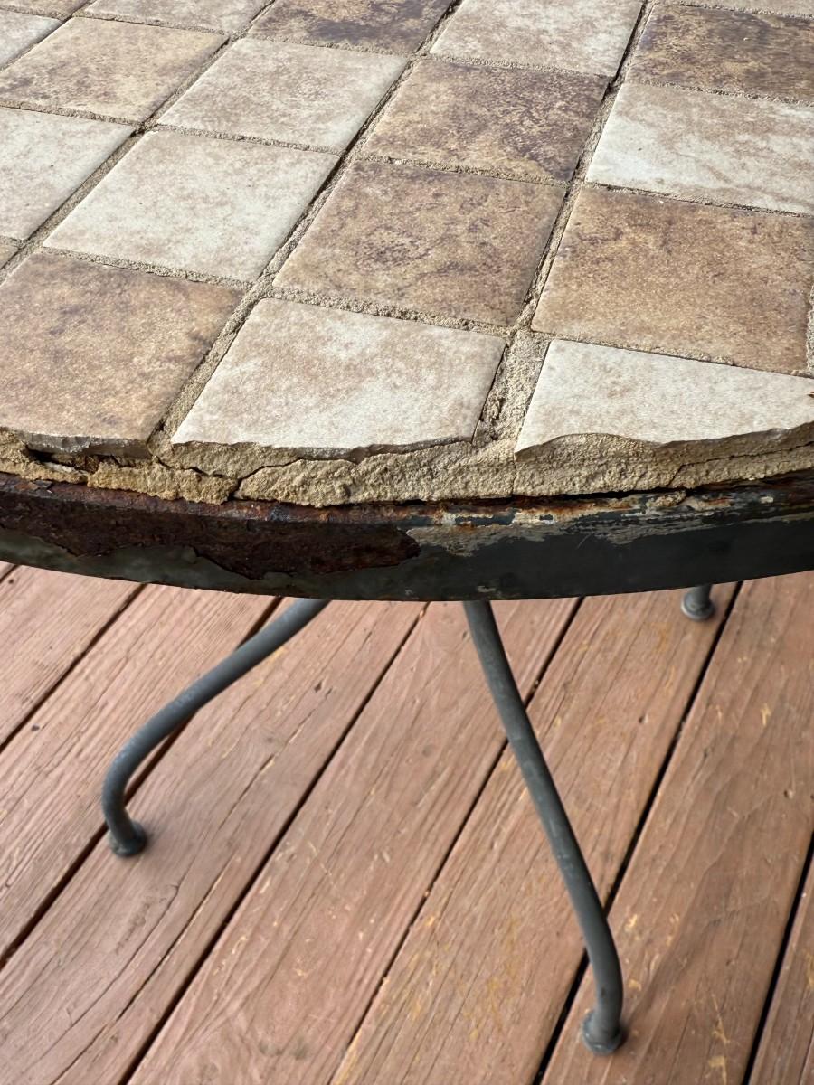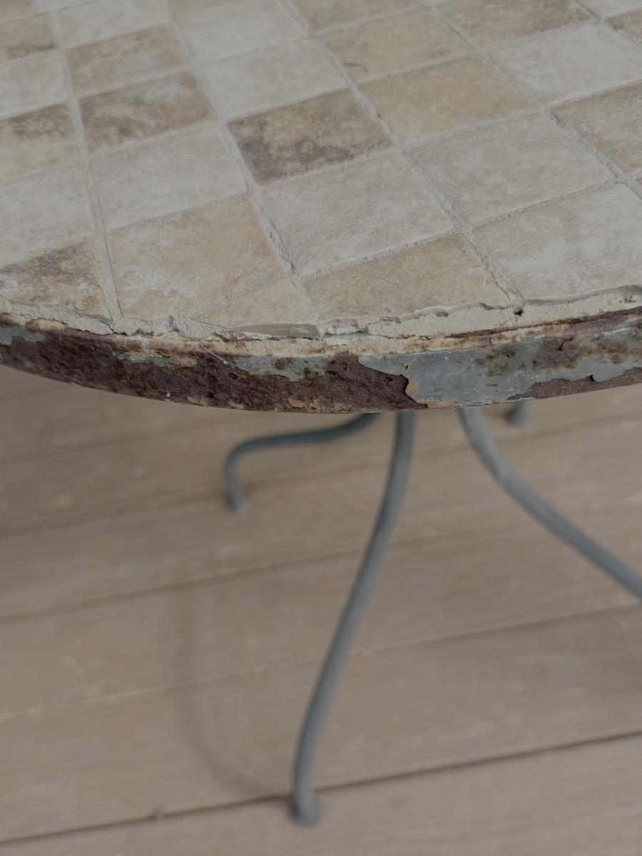 ? The table features neutral stone-look tiles in a checkerboard design and a wrought iron-style curved base.