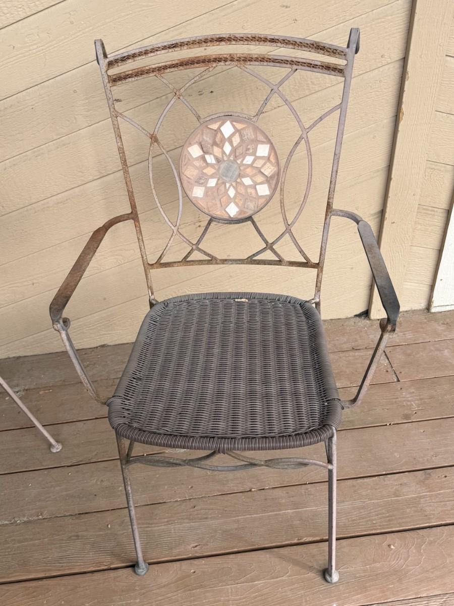 Add charm to your patio or porch with this decorative 3-piece bistro set. The set includes two matching metal chairs with beautiful mosaic-style medallion backs and a round, tile-top table.