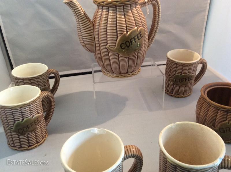 COFFEE POT AND FIVE MUGS WITH A MATCHING GREEZE POT.