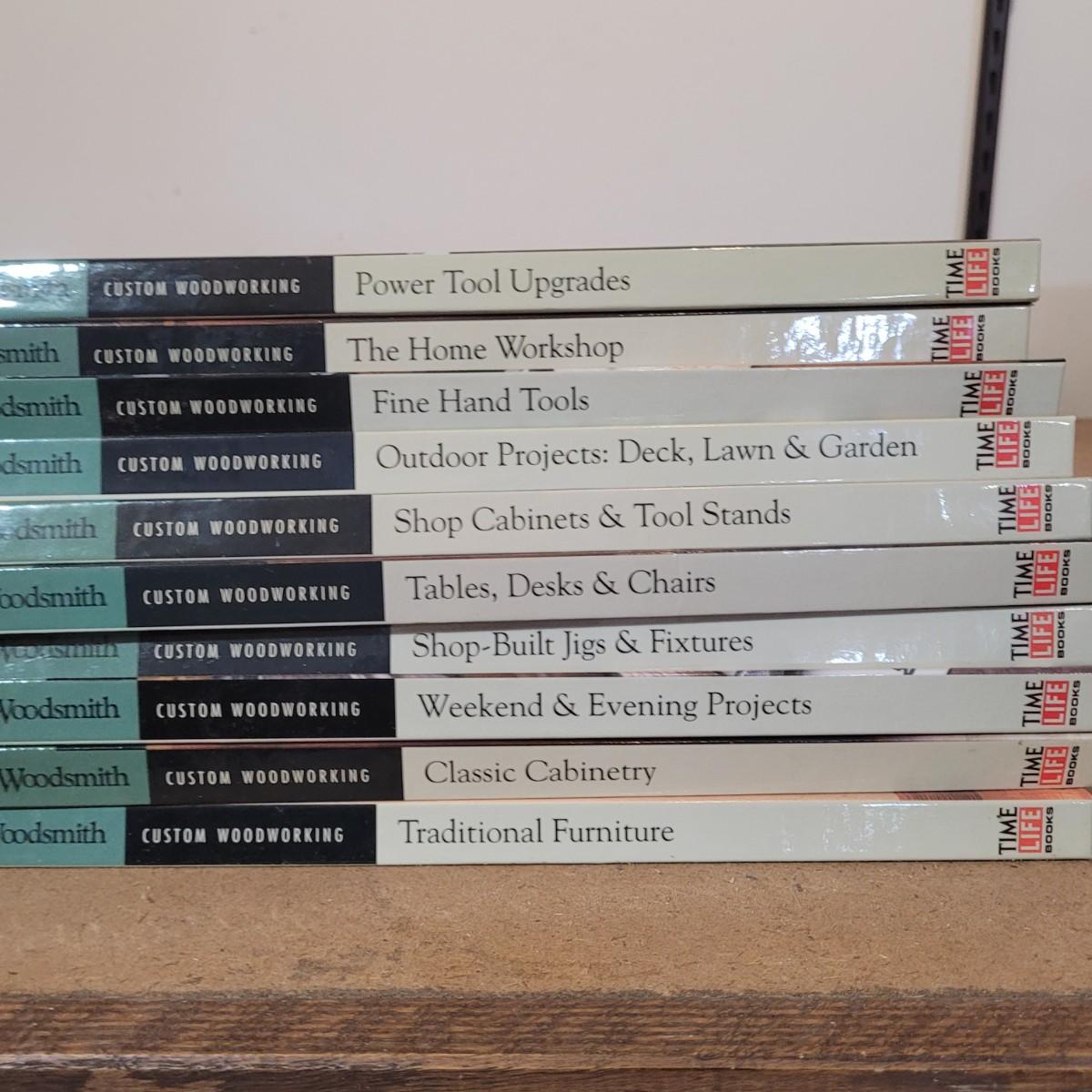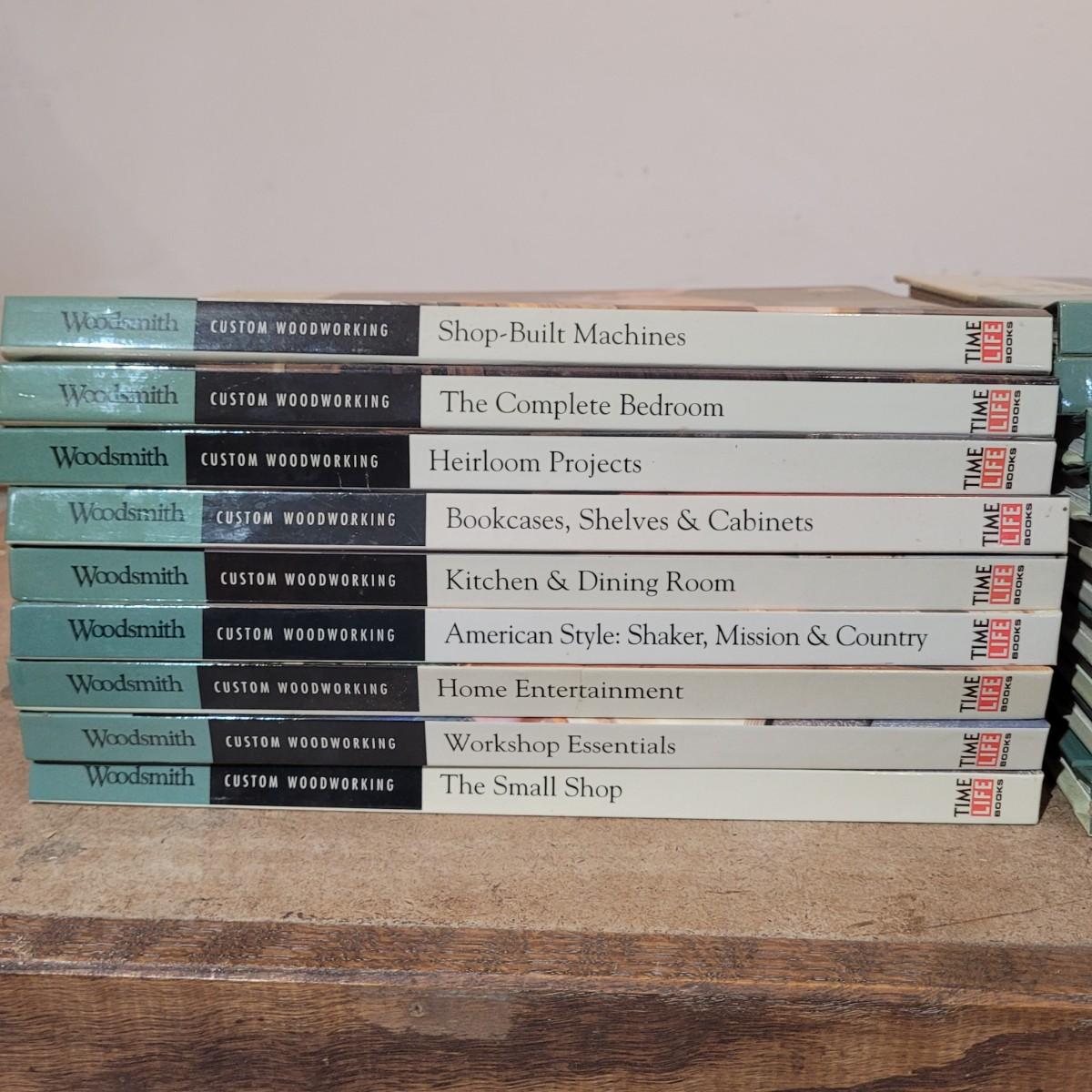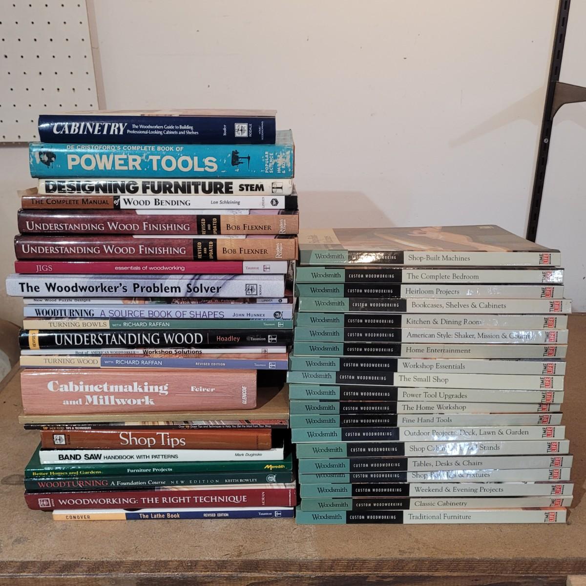 19 Time Life hardback books. Also includes 23 miscellaneous woodworking books. Subjects include, cabinetry, furniture, power tools, wood bending, finishing, techniques, and Shop tips.