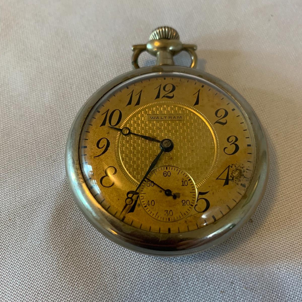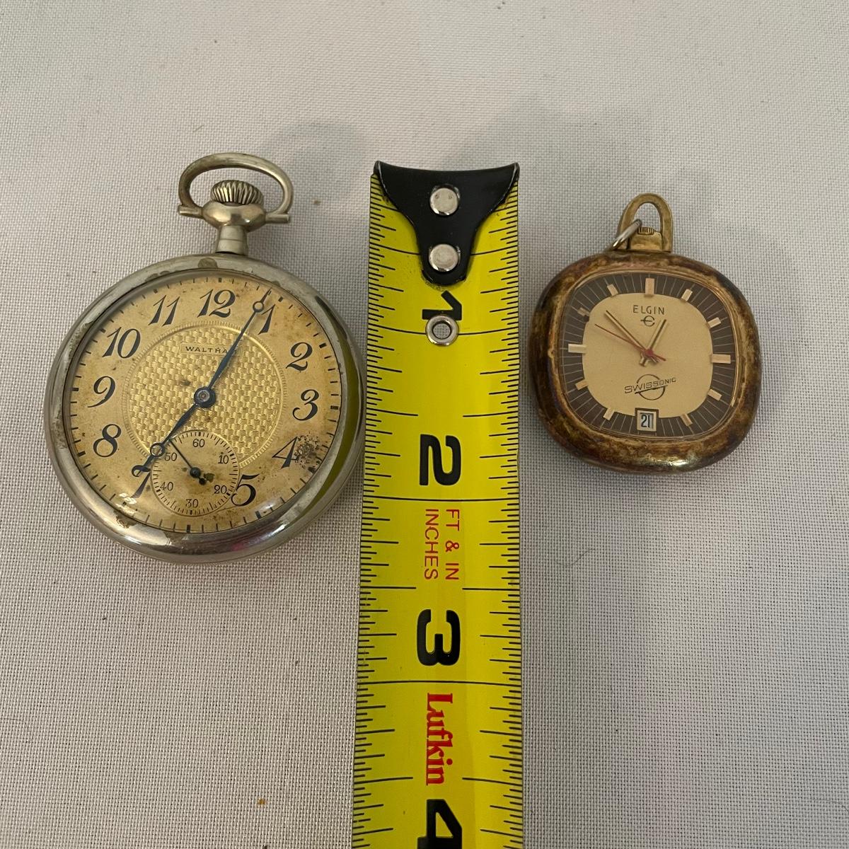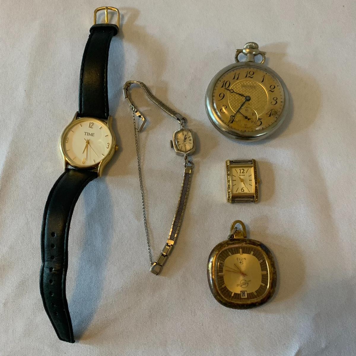 Five time pieces in all where all have moving hands but cannot verify running. Large Waltham pocket watch is wound all the way with no action. Elgin squared pocket is heavy and cannot open back. Shipping available.