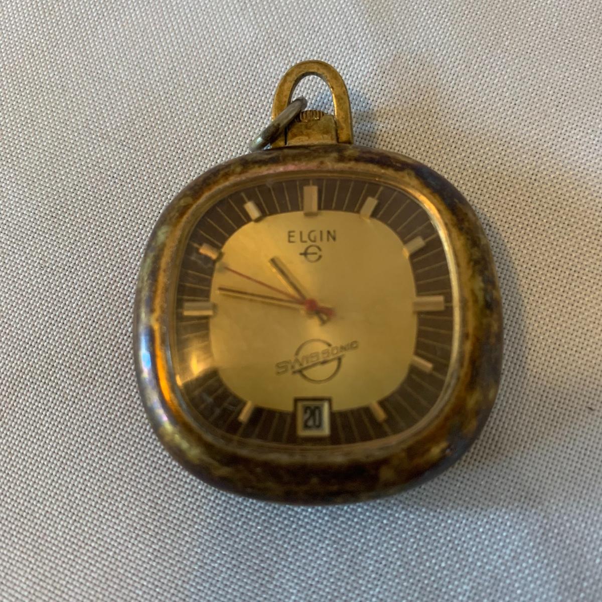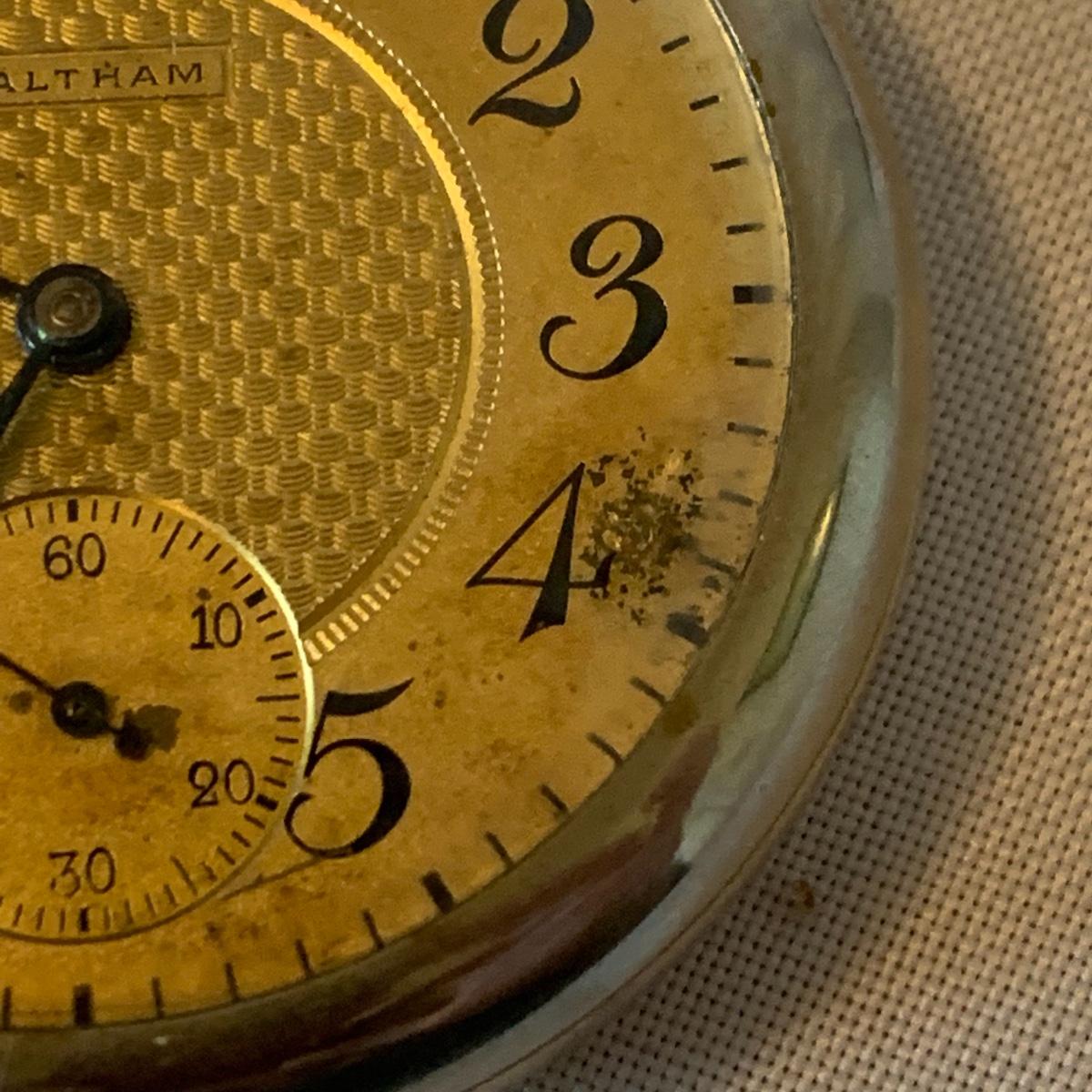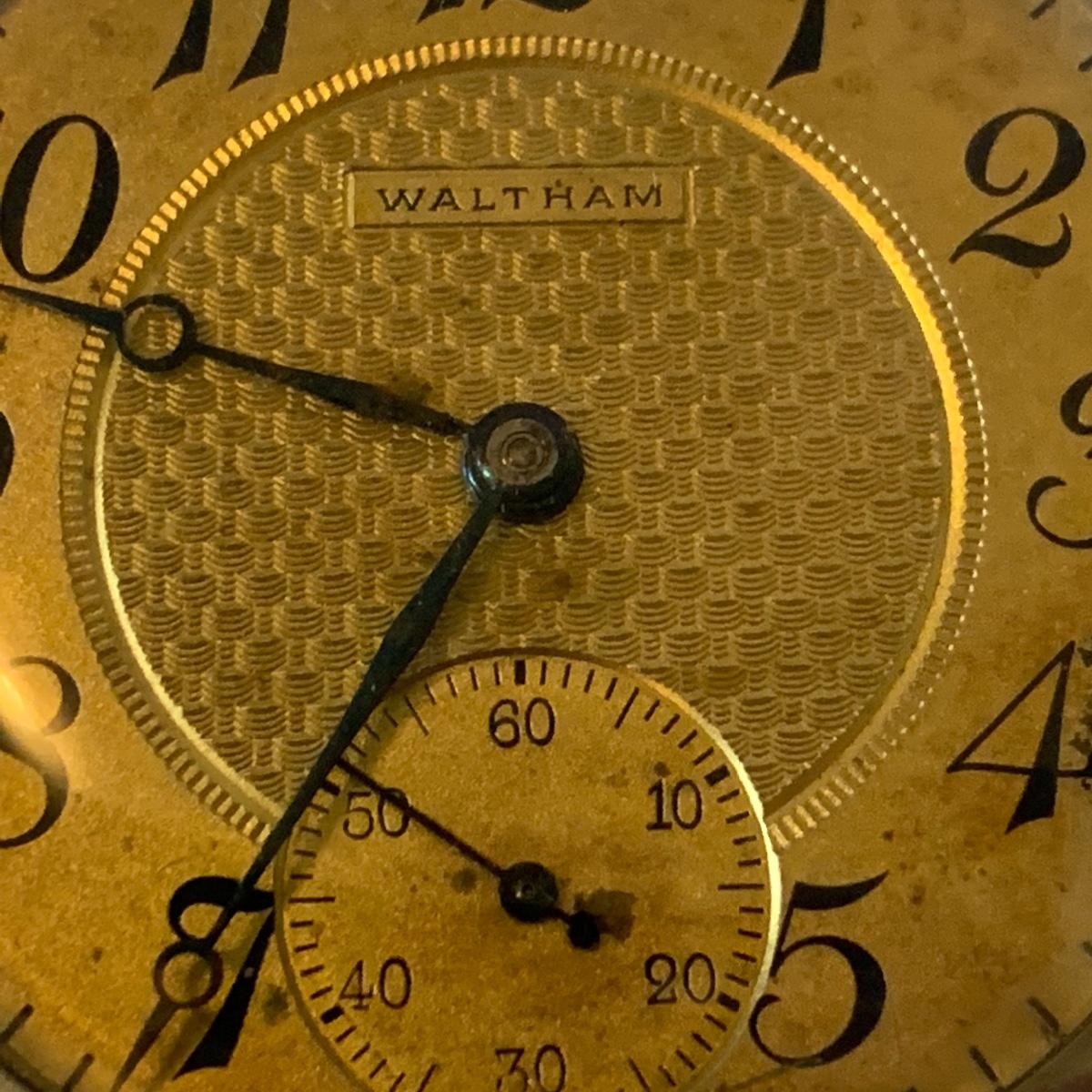 Five time pieces in all where all have moving hands but cannot verify running. Large Waltham pocket watch is wound all the way with no action. Elgin squared pocket is heavy and cannot open back. Shipping available.