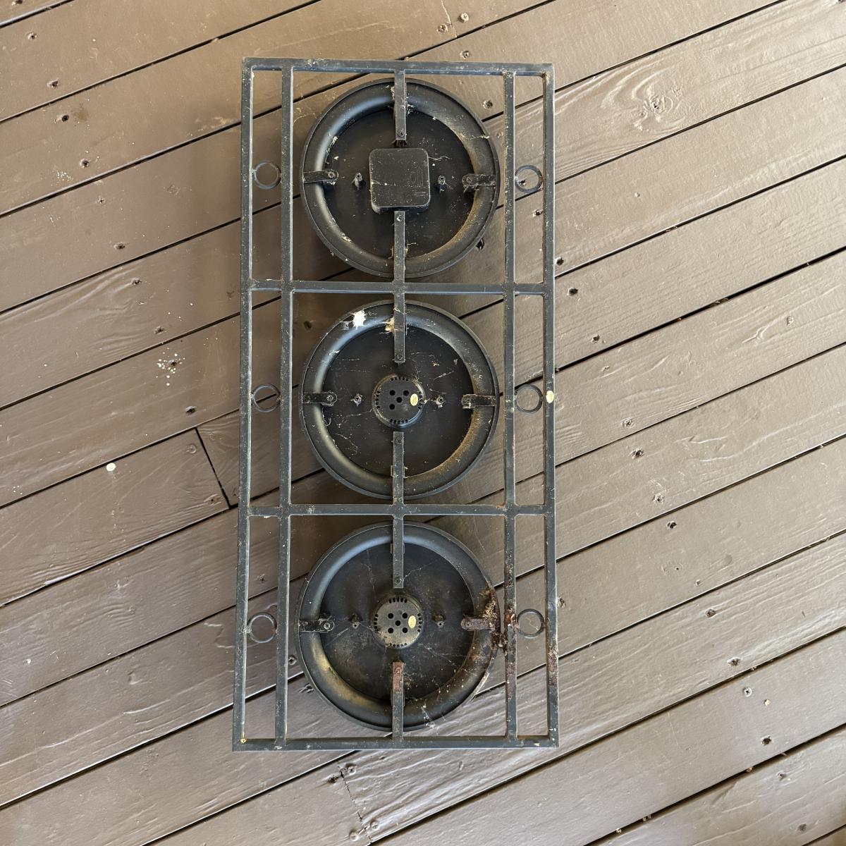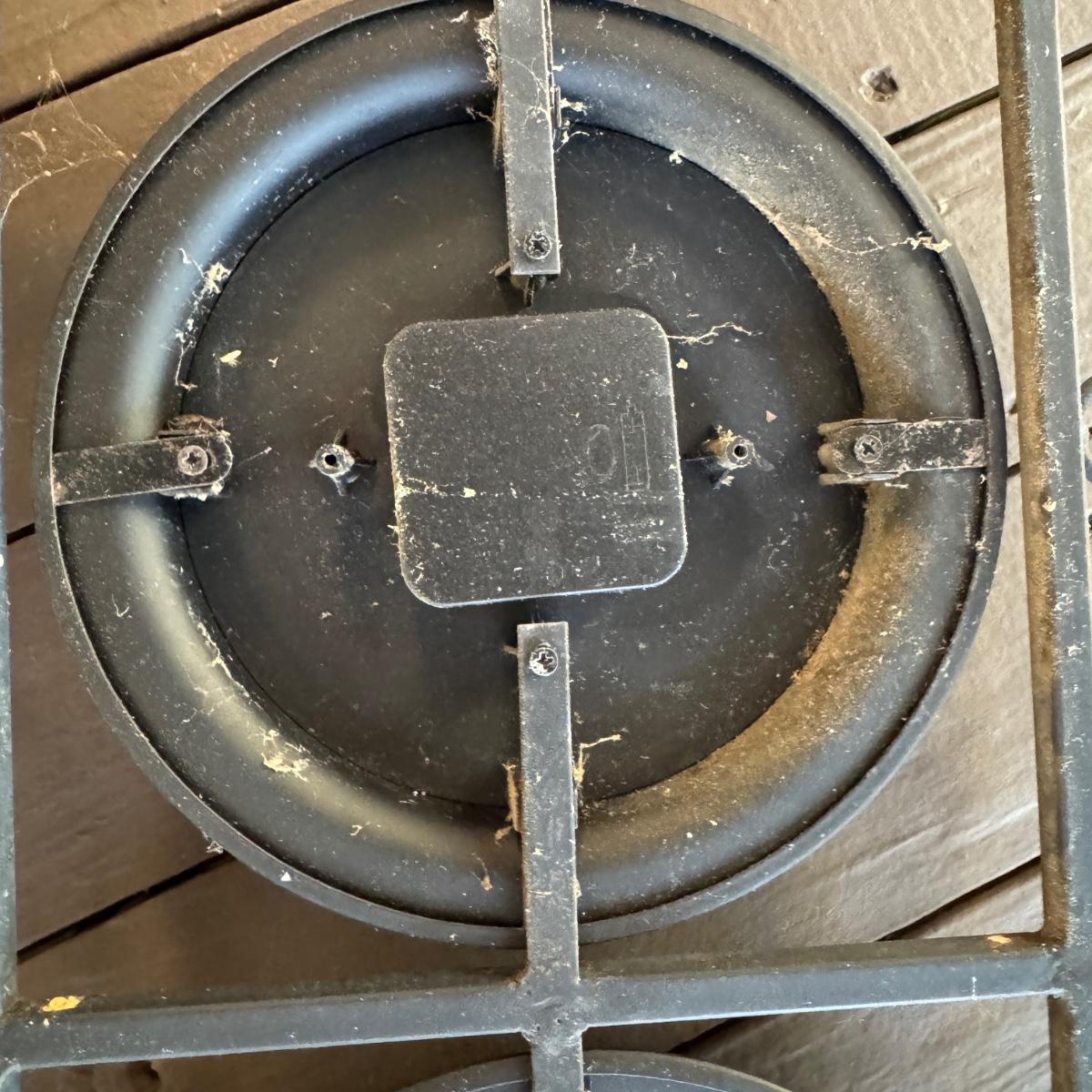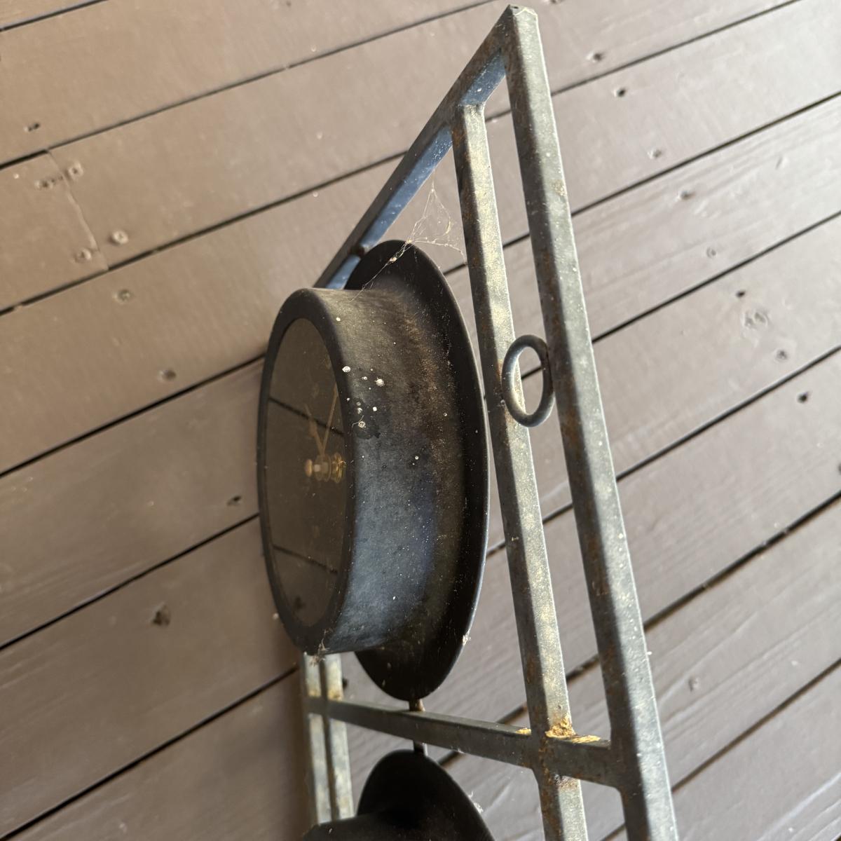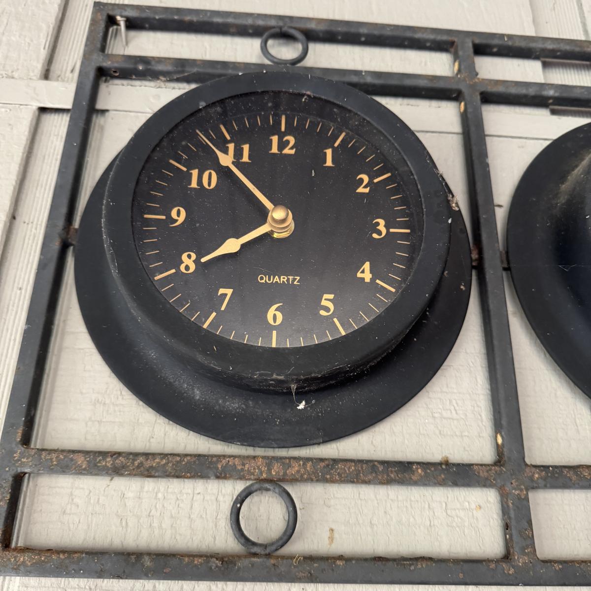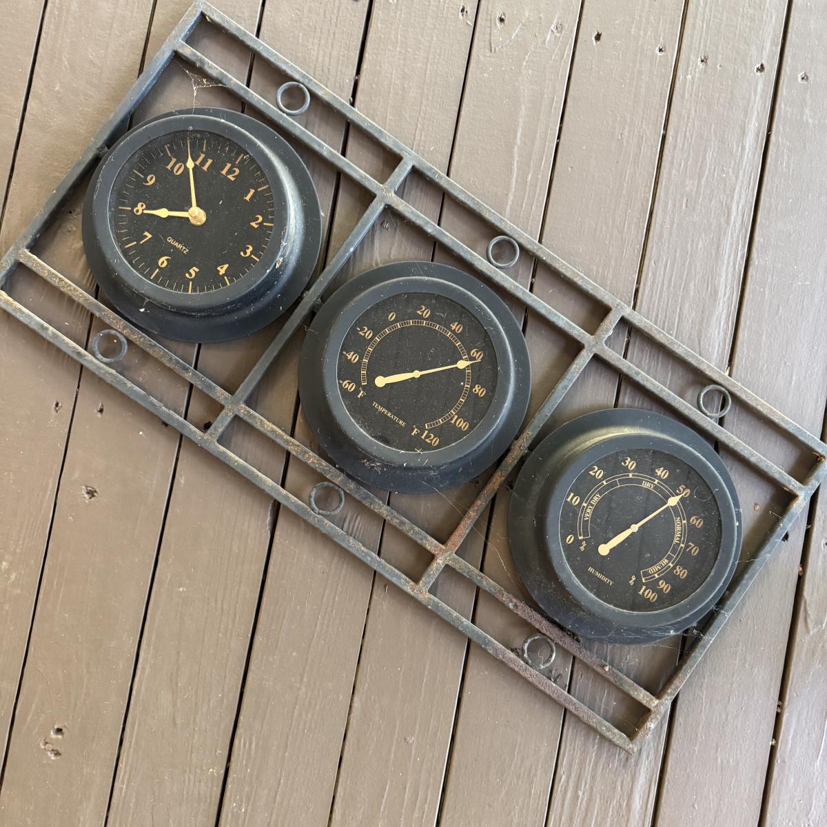 Fun useful outdoor clock that also has temperature and humidity gauges. Unable to test but the temp and humidity are probably correct. Clock hands haven’t moved so likely needs a battery. Has some rust on metal from being outdoors. Measures 26.5” x 12”