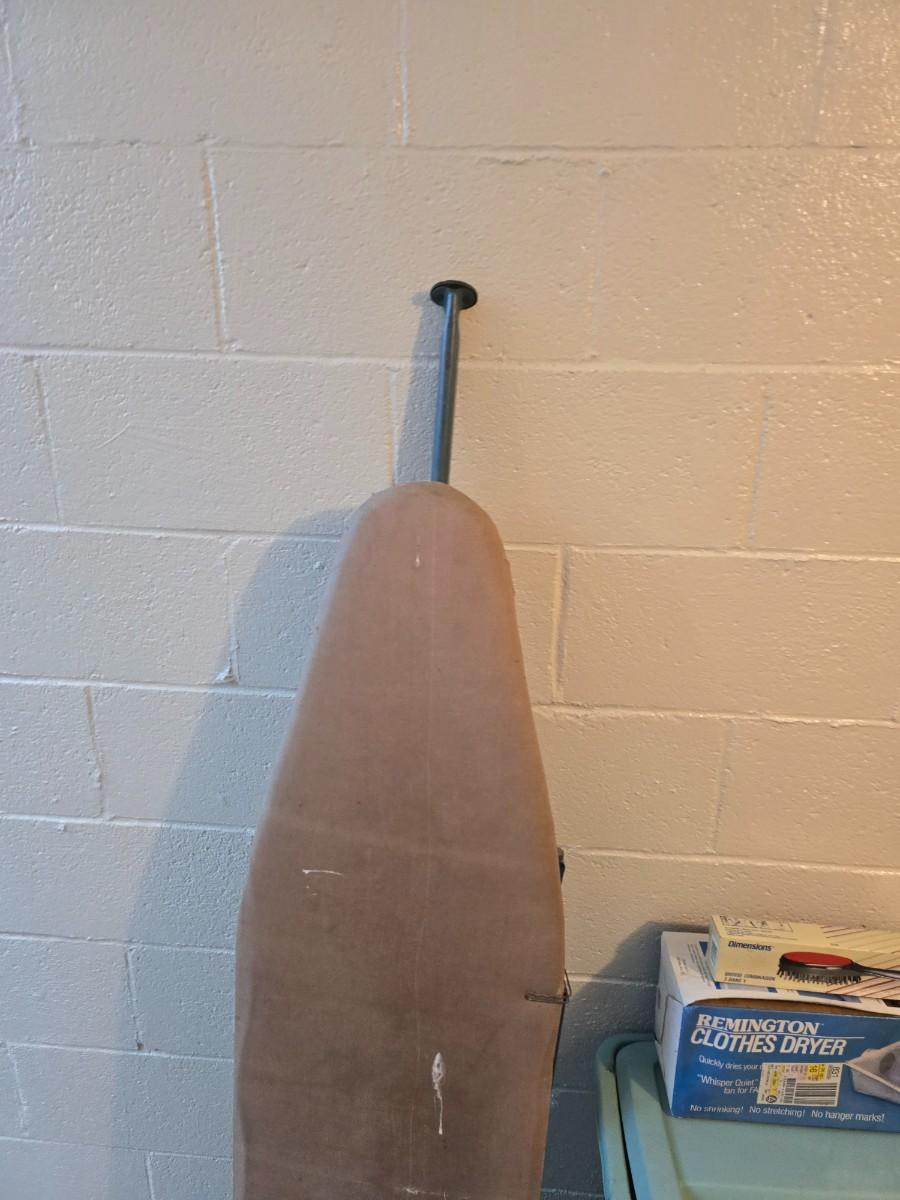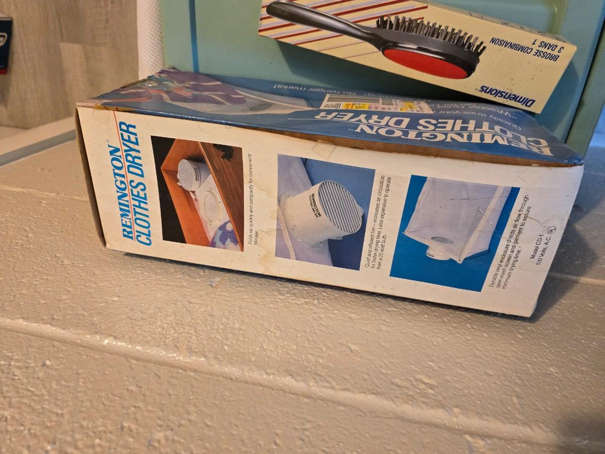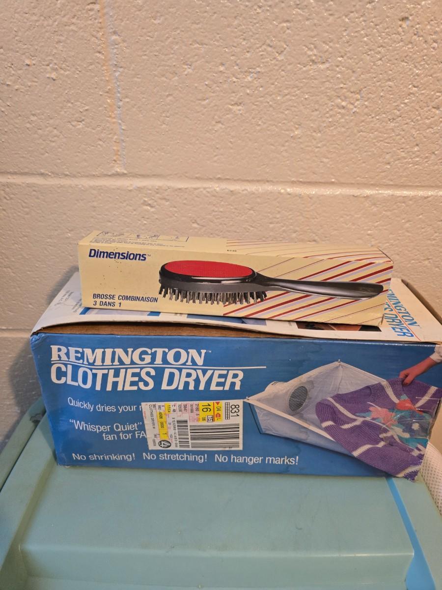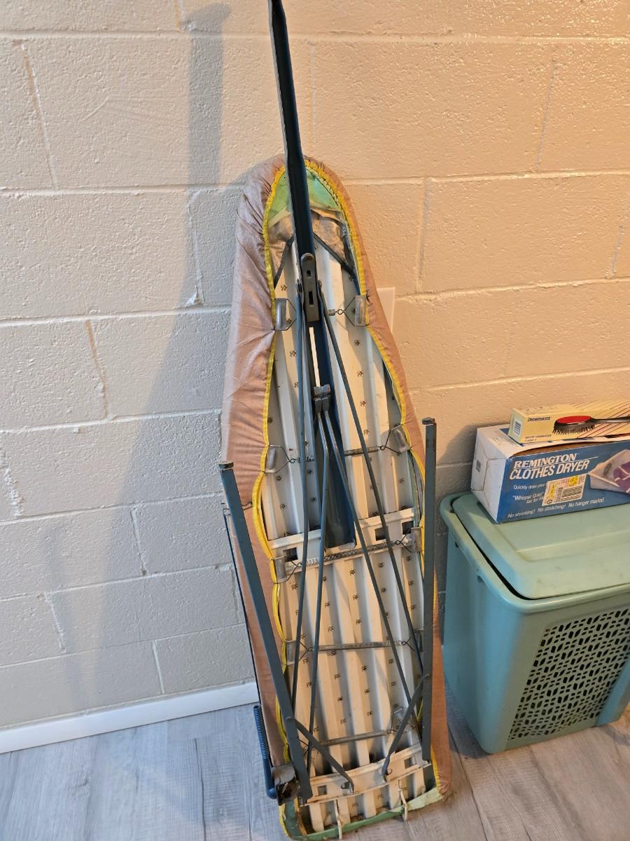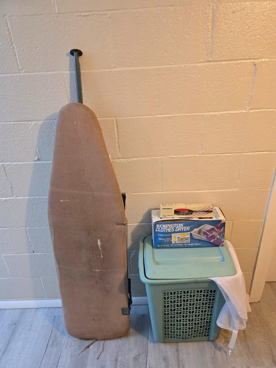 Time to do laundry!!Old metal Ironing board with hamper, laundry bag, Clothes iron, Lint brush and a Remington clothes dryer