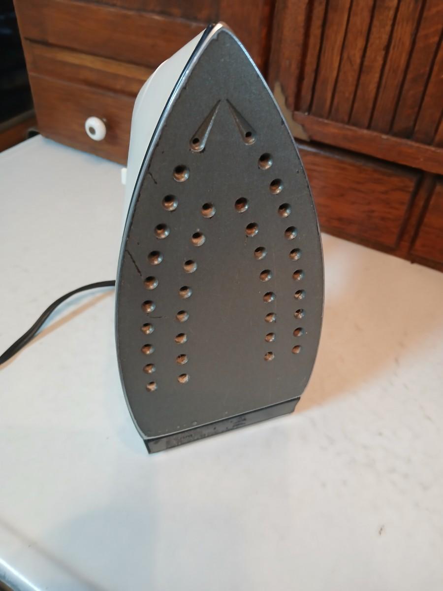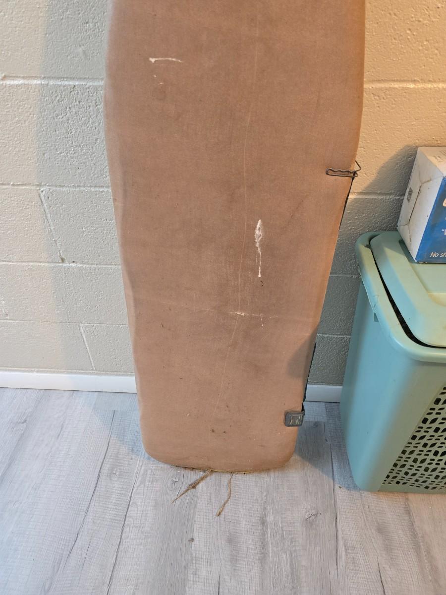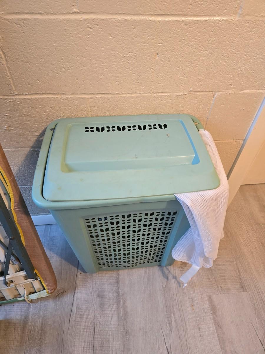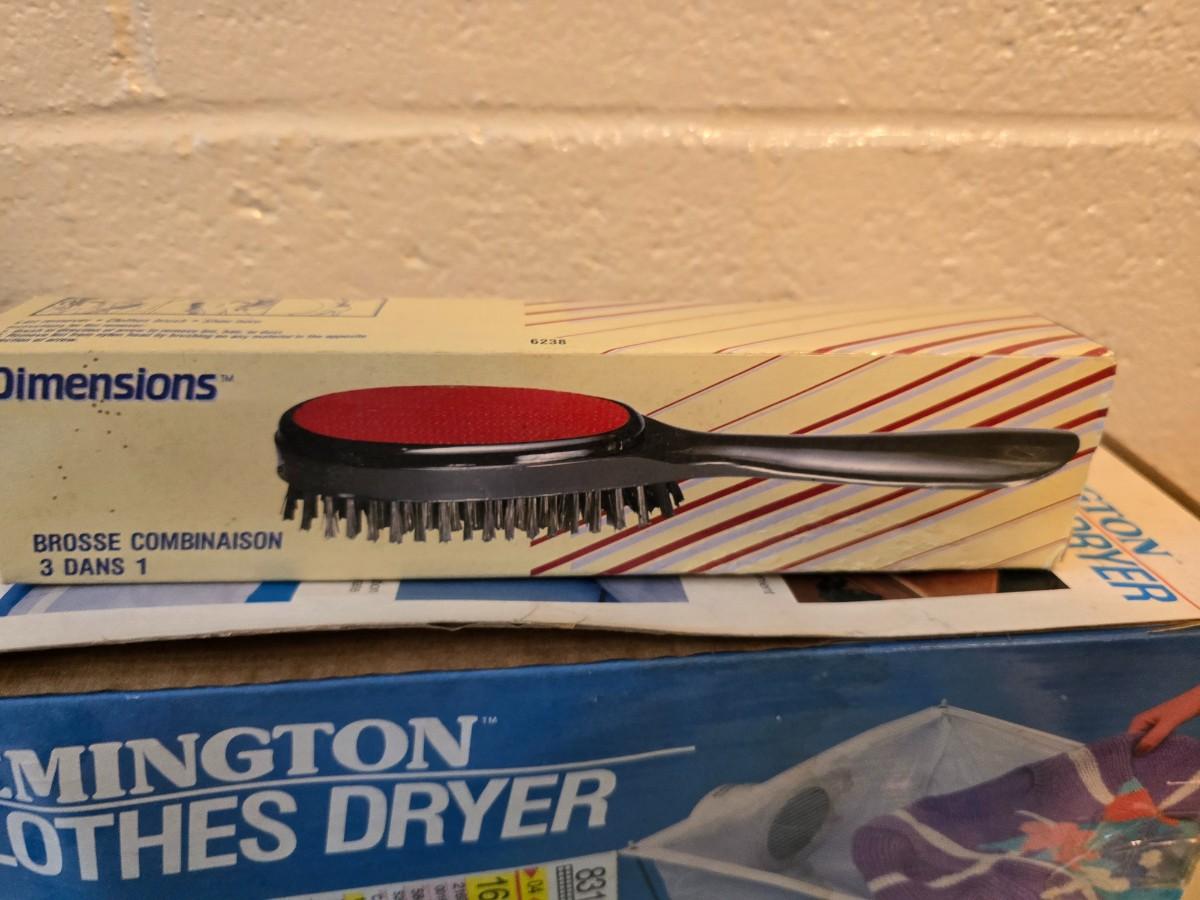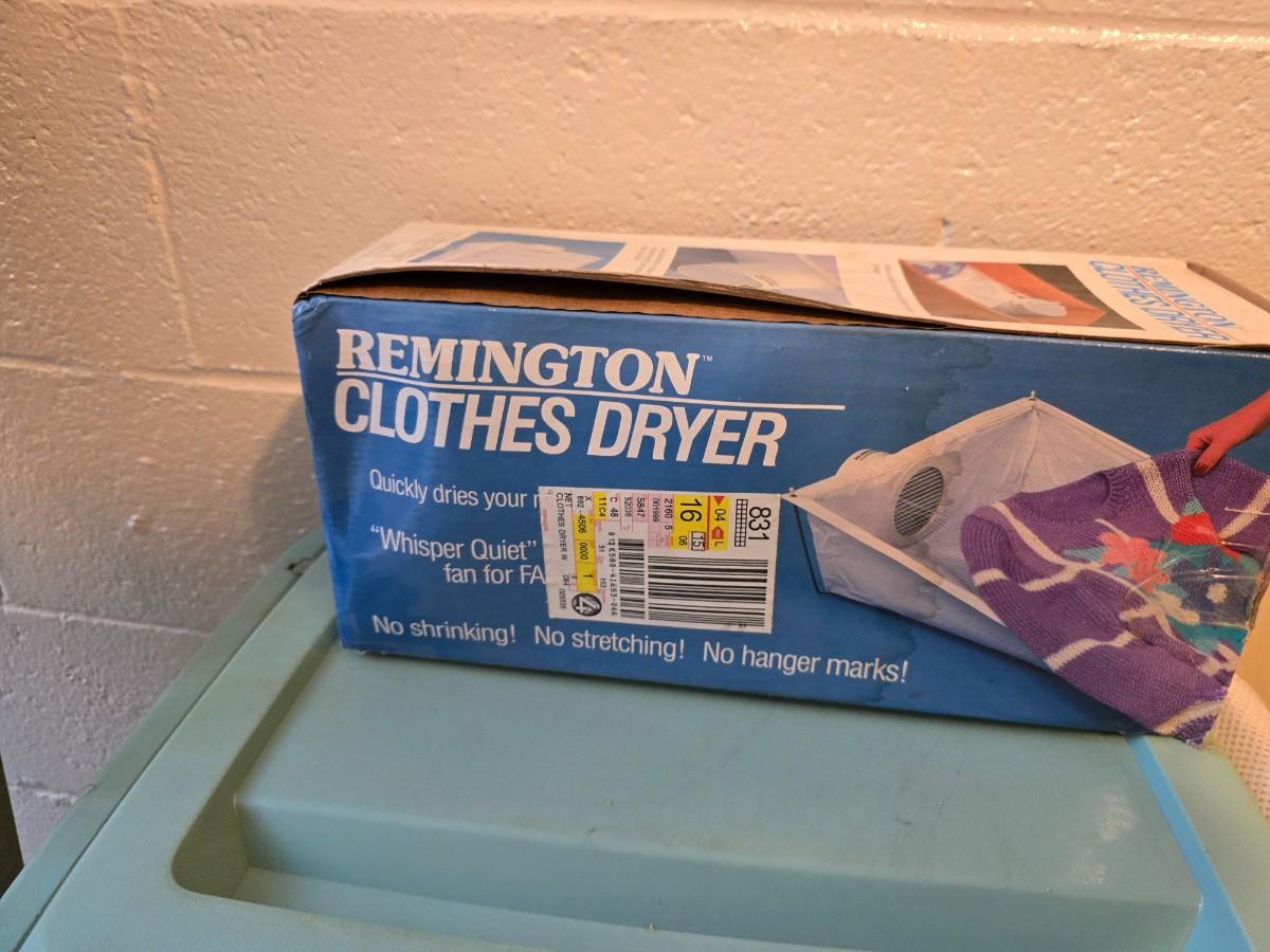 Time to do laundry!!Old metal Ironing board with hamper, laundry bag, Clothes iron, Lint brush and a Remington clothes dryer
