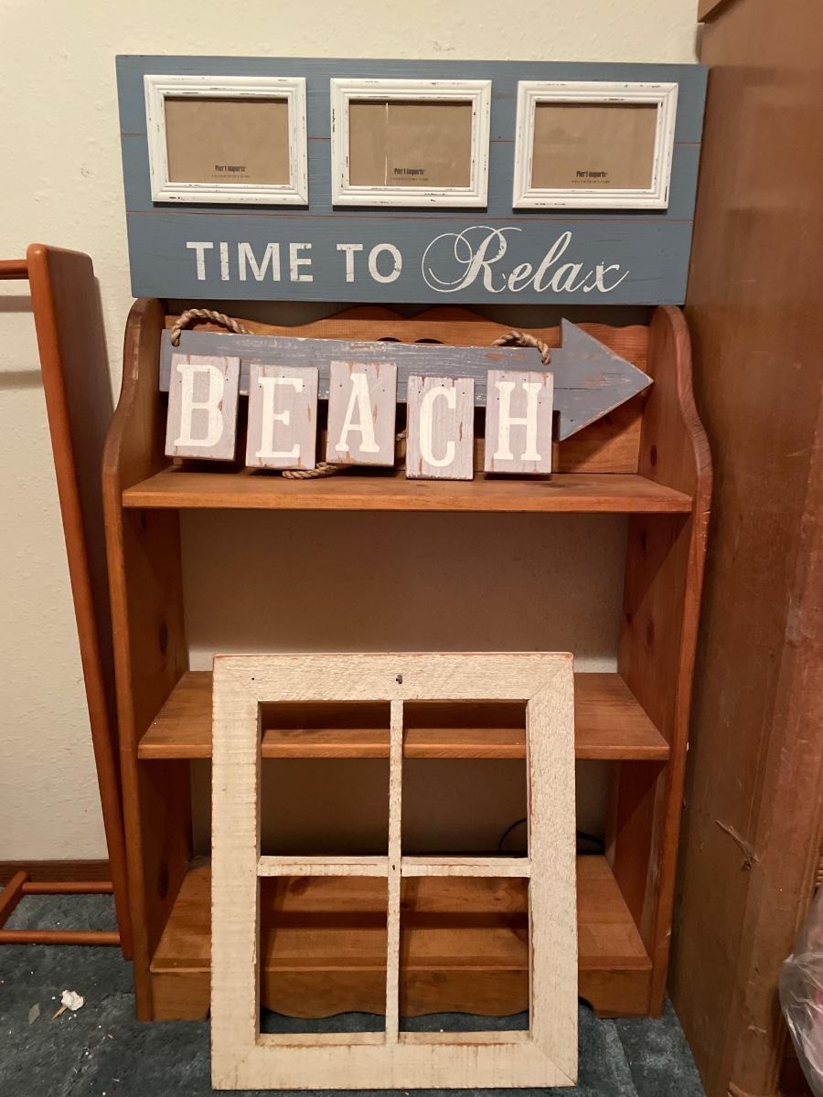 You are bidding on the Pier 1 Imports Time to relax picture frame dimensions are 26 1/2” wide x 10 1/2” tall x l1 1/2”deep , beach sign dimensions are 24” wide x 8” tall x 1/2” deep and the white colored wood frame dimensions are 19” tall x 16” wide x 1” deep.