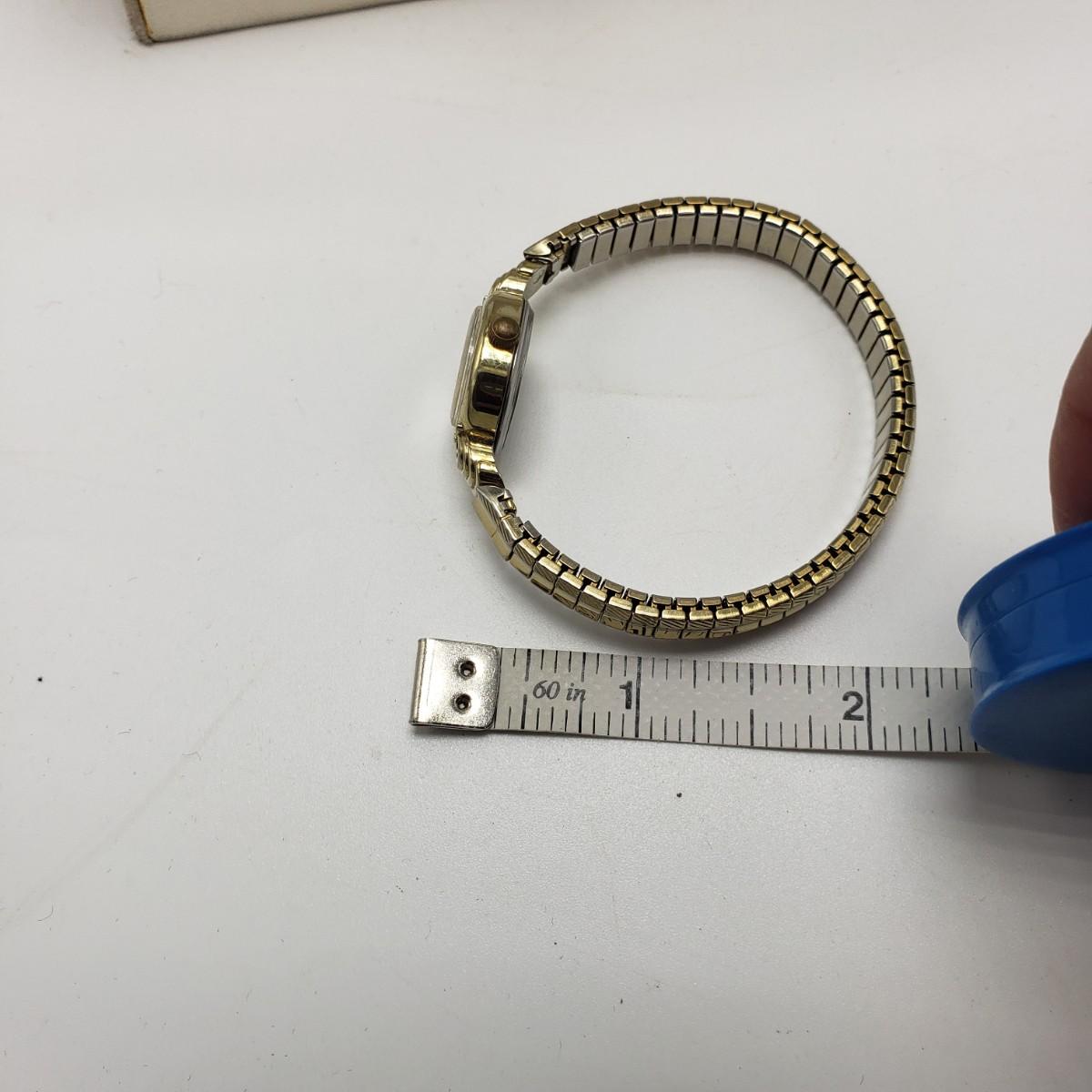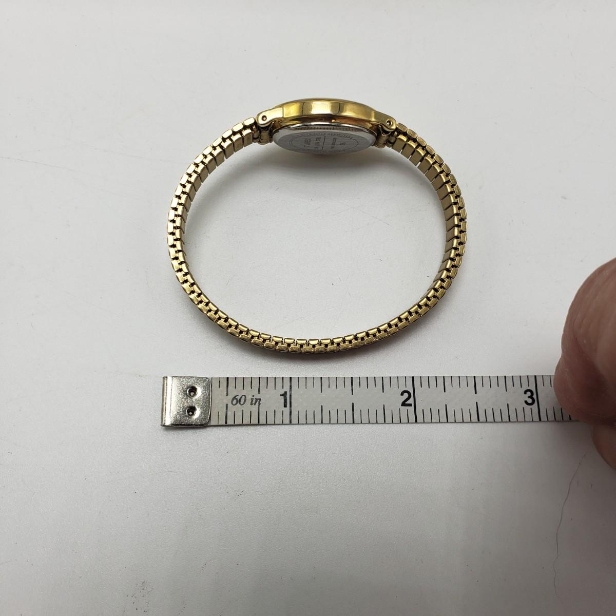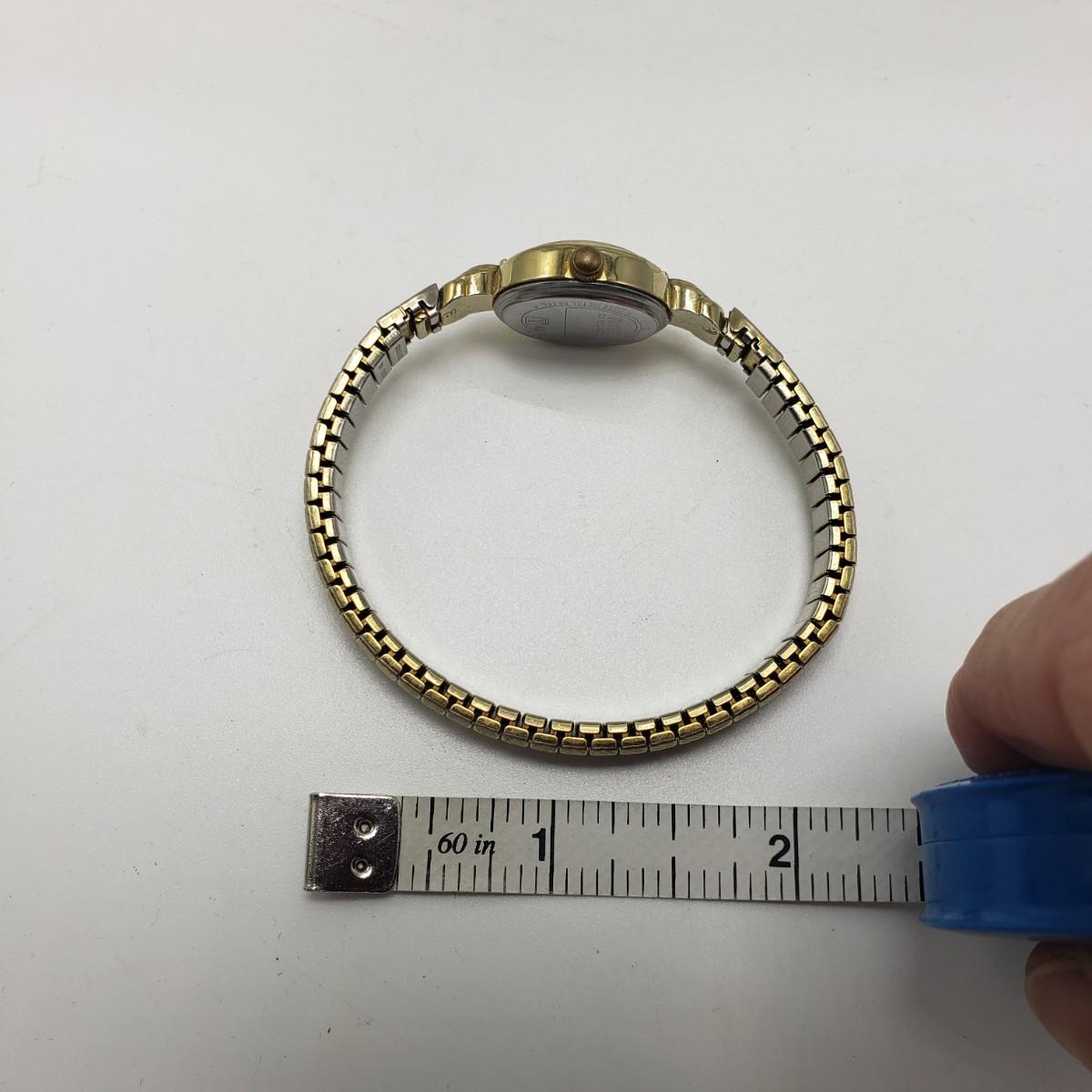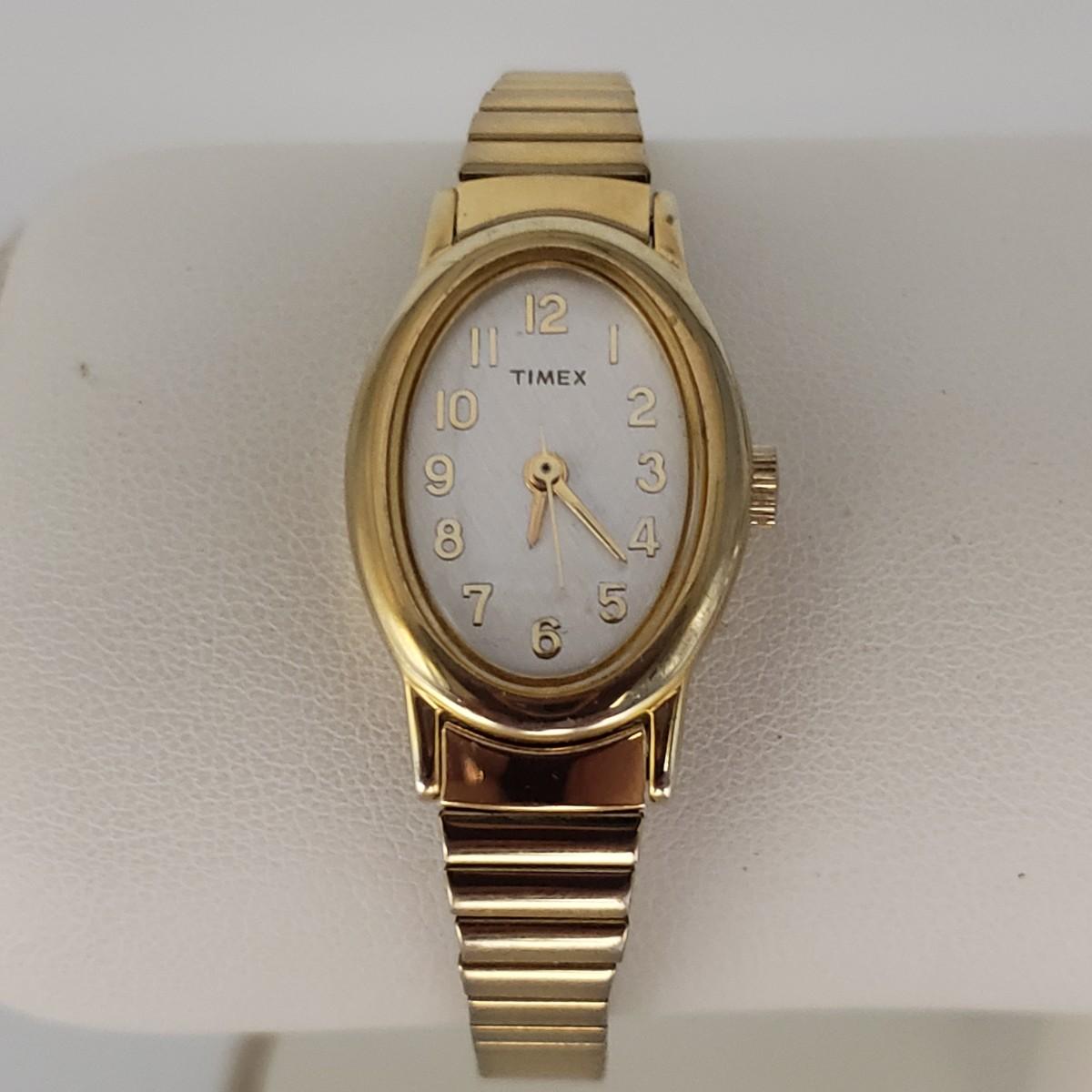 This three piece women's watch lot features two gold colored Timex watches and a silver Benrus watch. The two Timex watches have elastic bands that still feel strong when stretched. The bands measure 2". The silver colored Benrus watch has a hook and chain clasp. There are two knots in the chain, but feel they can be detangled, we just didn't want to risk it. All watches are stainless steel and are not currently working.