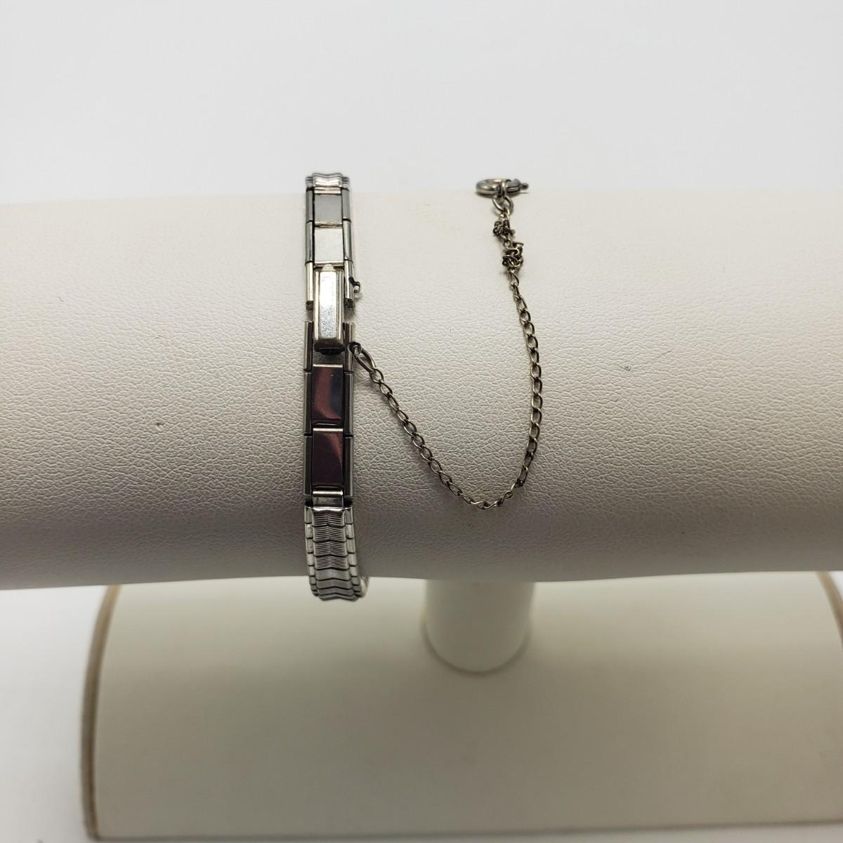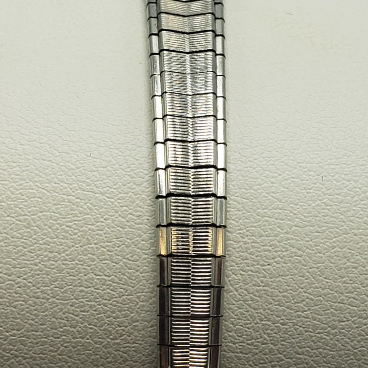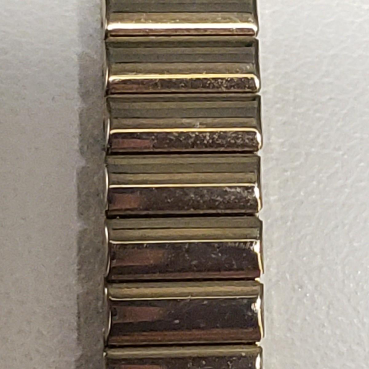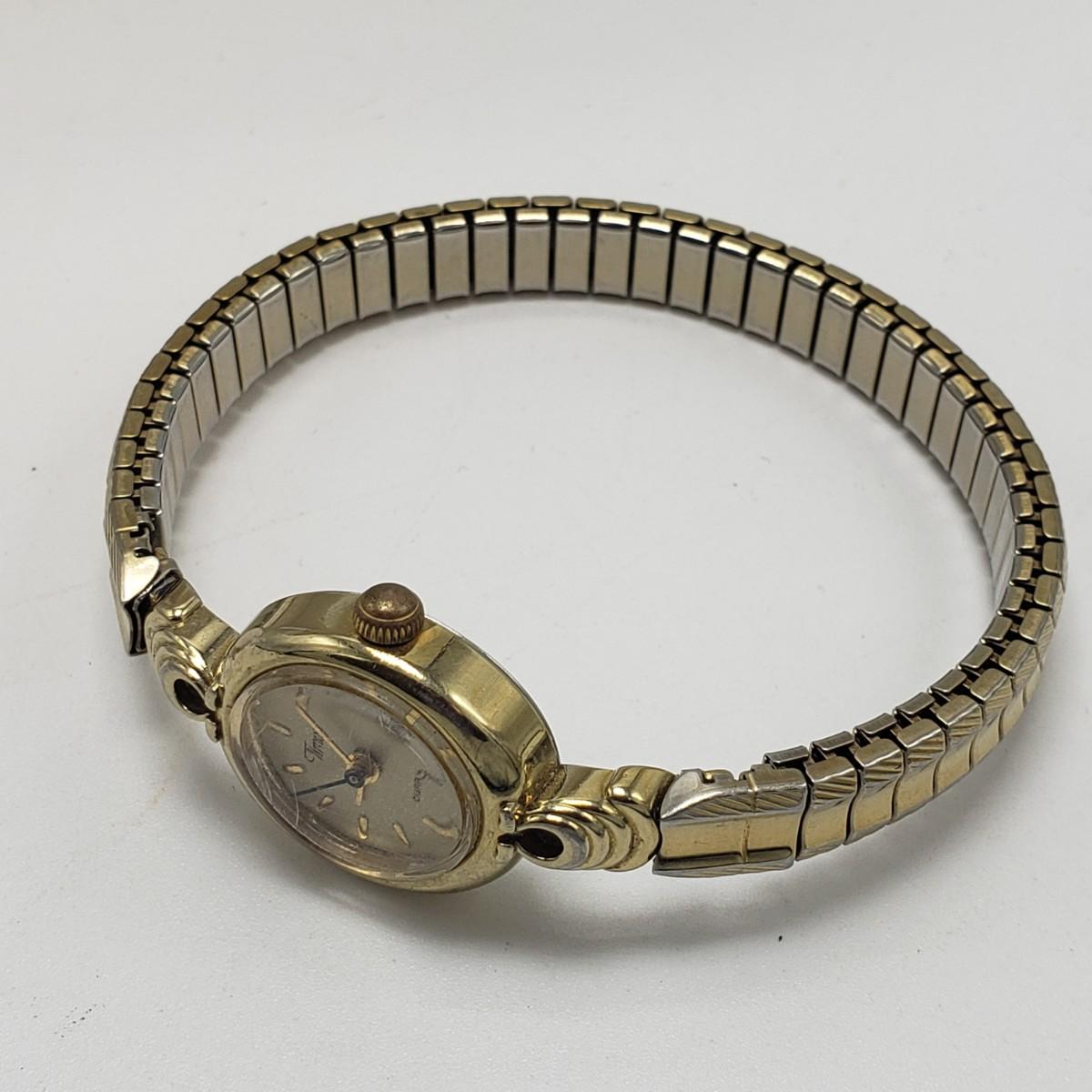 This three piece women's watch lot features two gold colored Timex watches and a silver Benrus watch. The two Timex watches have elastic bands that still feel strong when stretched. The bands measure 2". The silver colored Benrus watch has a hook and chain clasp. There are two knots in the chain, but feel they can be detangled, we just didn't want to risk it. All watches are stainless steel and are not currently working.