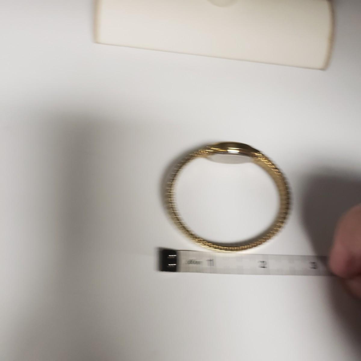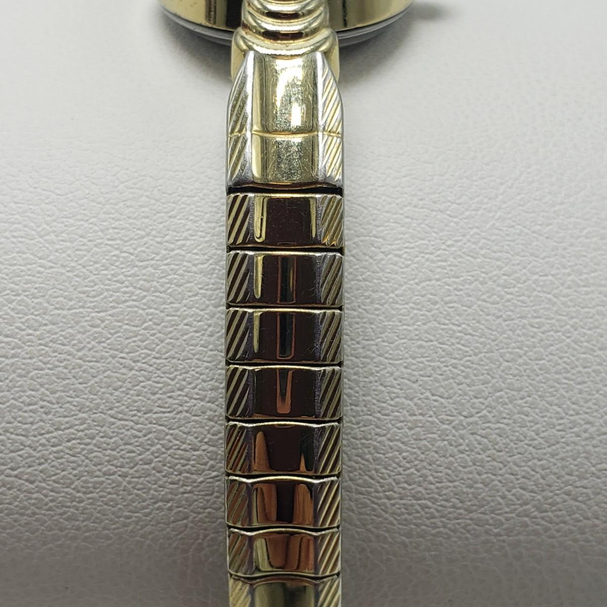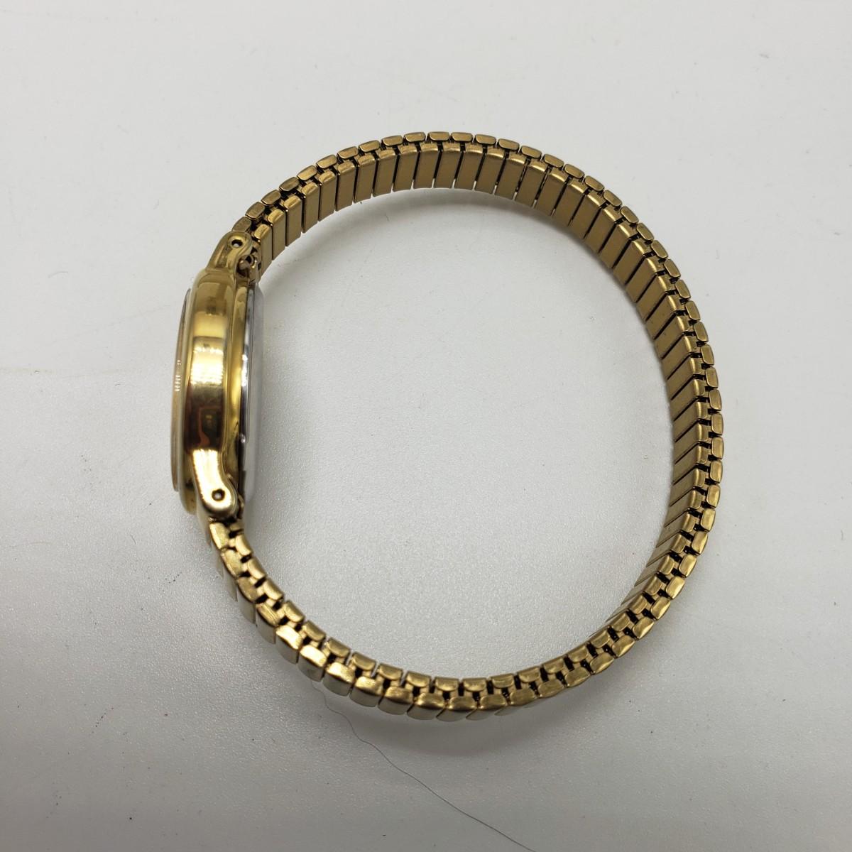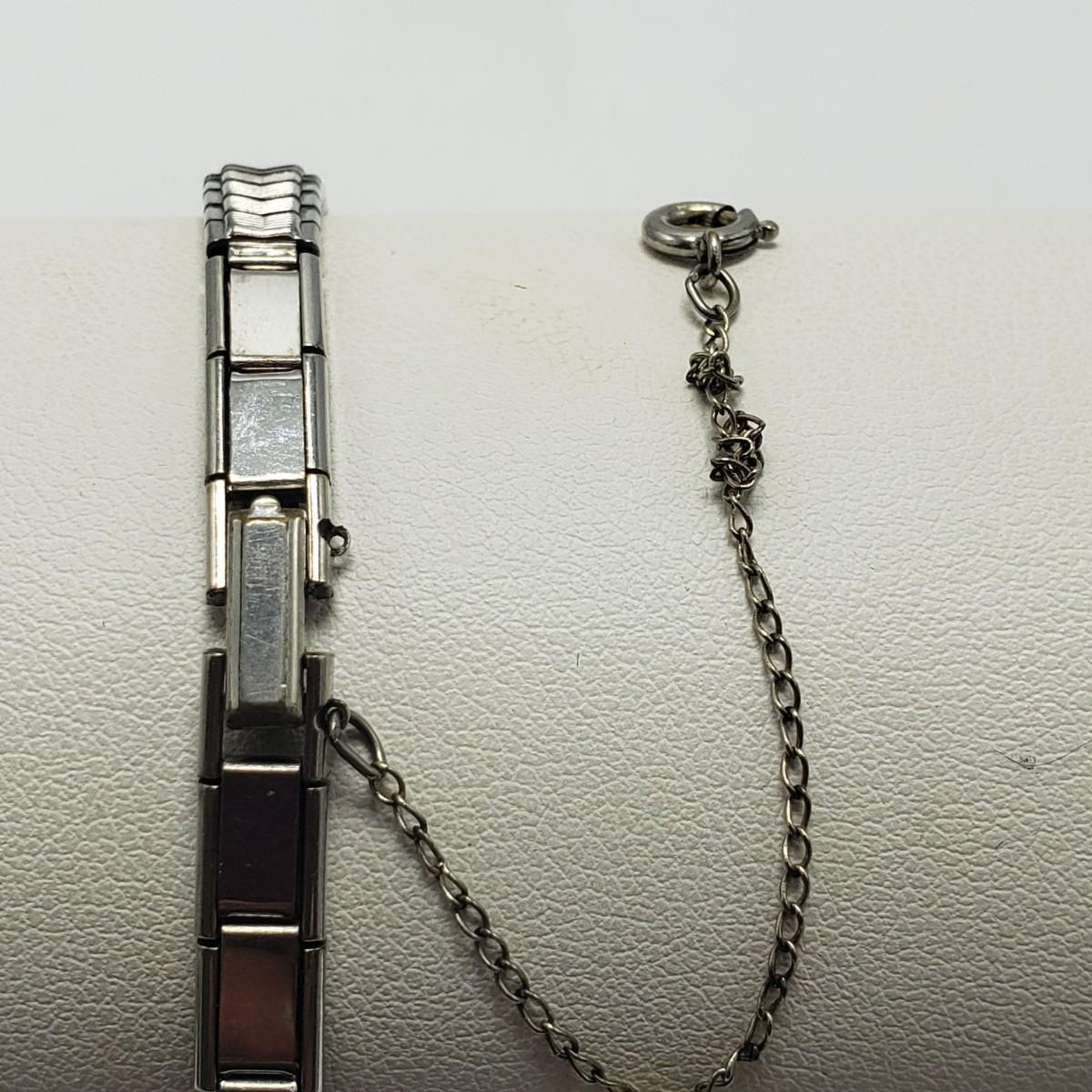 This three piece women's watch lot features two gold colored Timex watches and a silver Benrus watch. The two Timex watches have elastic bands that still feel strong when stretched. The bands measure 2". The silver colored Benrus watch has a hook and chain clasp. There are two knots in the chain, but feel they can be detangled, we just didn't want to risk it. All watches are stainless steel and are not currently working.