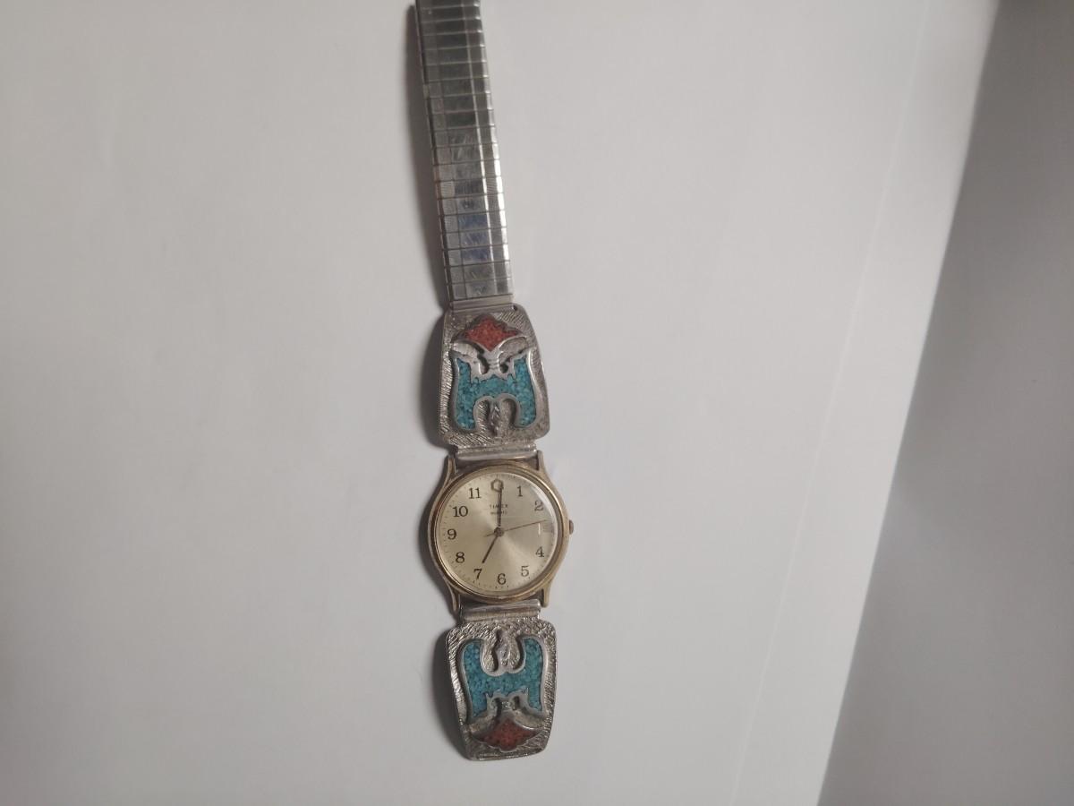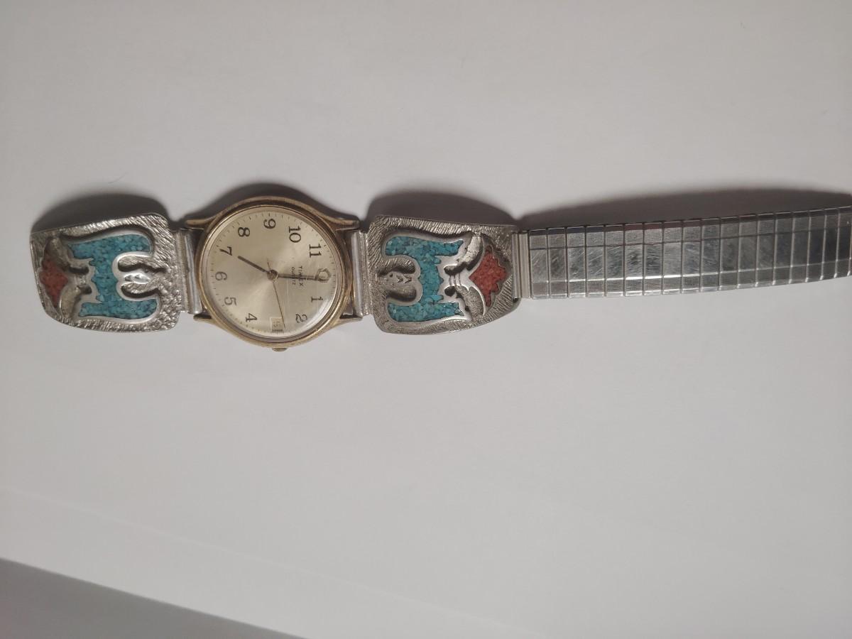 Timex Watch Silver-tone metal with ornate Southwestern-style inlays Watch Band