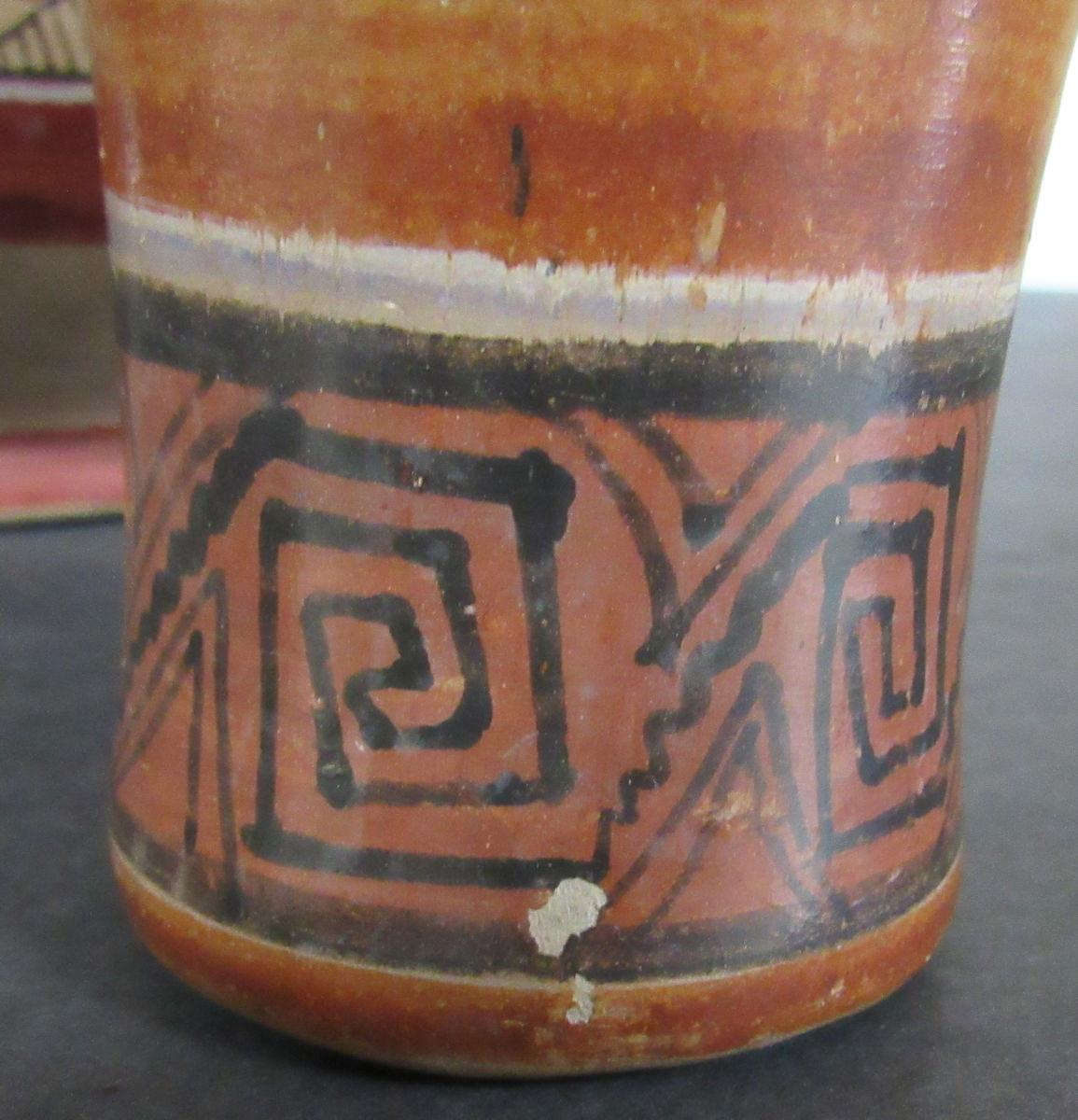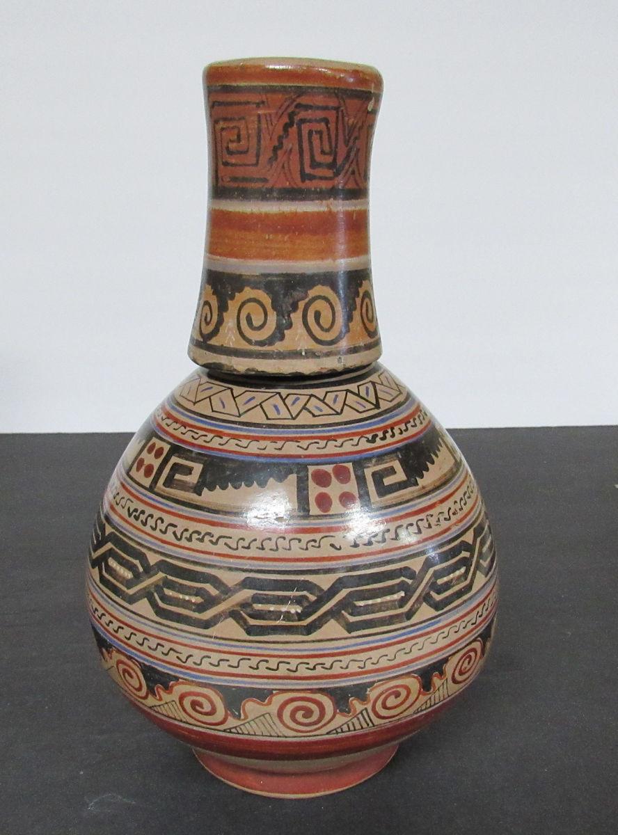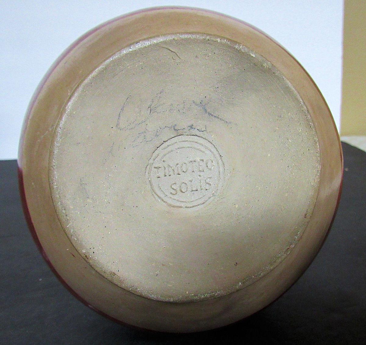 No chips or cracks but does have paint wear. I can't find dates or history on artist Timoteo Solis, but know he was from El Salvador and there are pieces of his pottery for sale throughout the net.