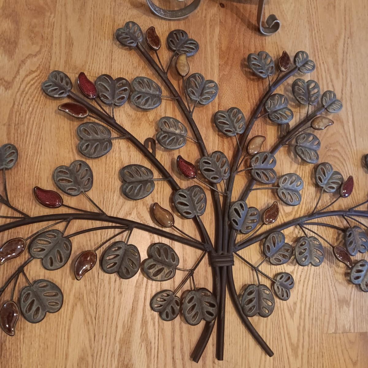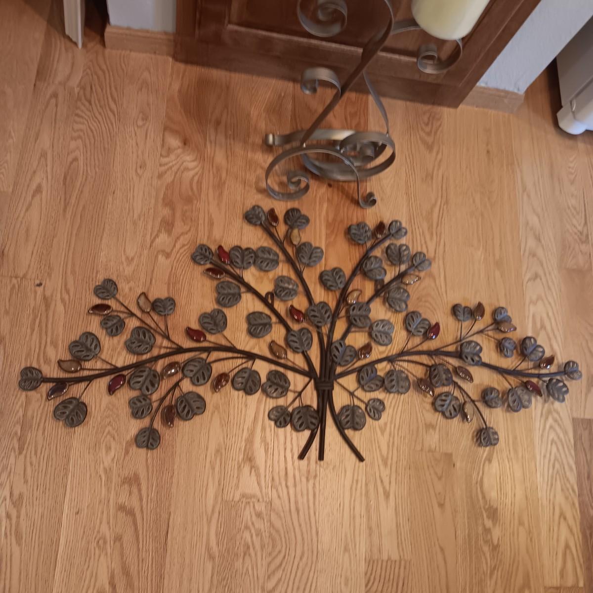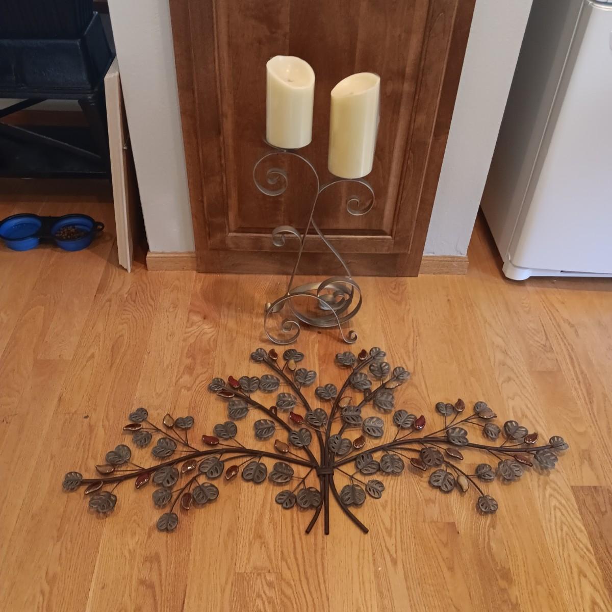 TIN AND CERAMIC LEAF WALL HANGING PLUS AN IRON CANDLE HOLDER W/FLAMELESS CANDLES