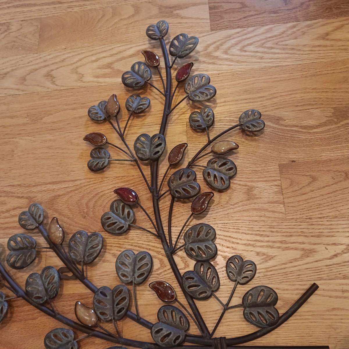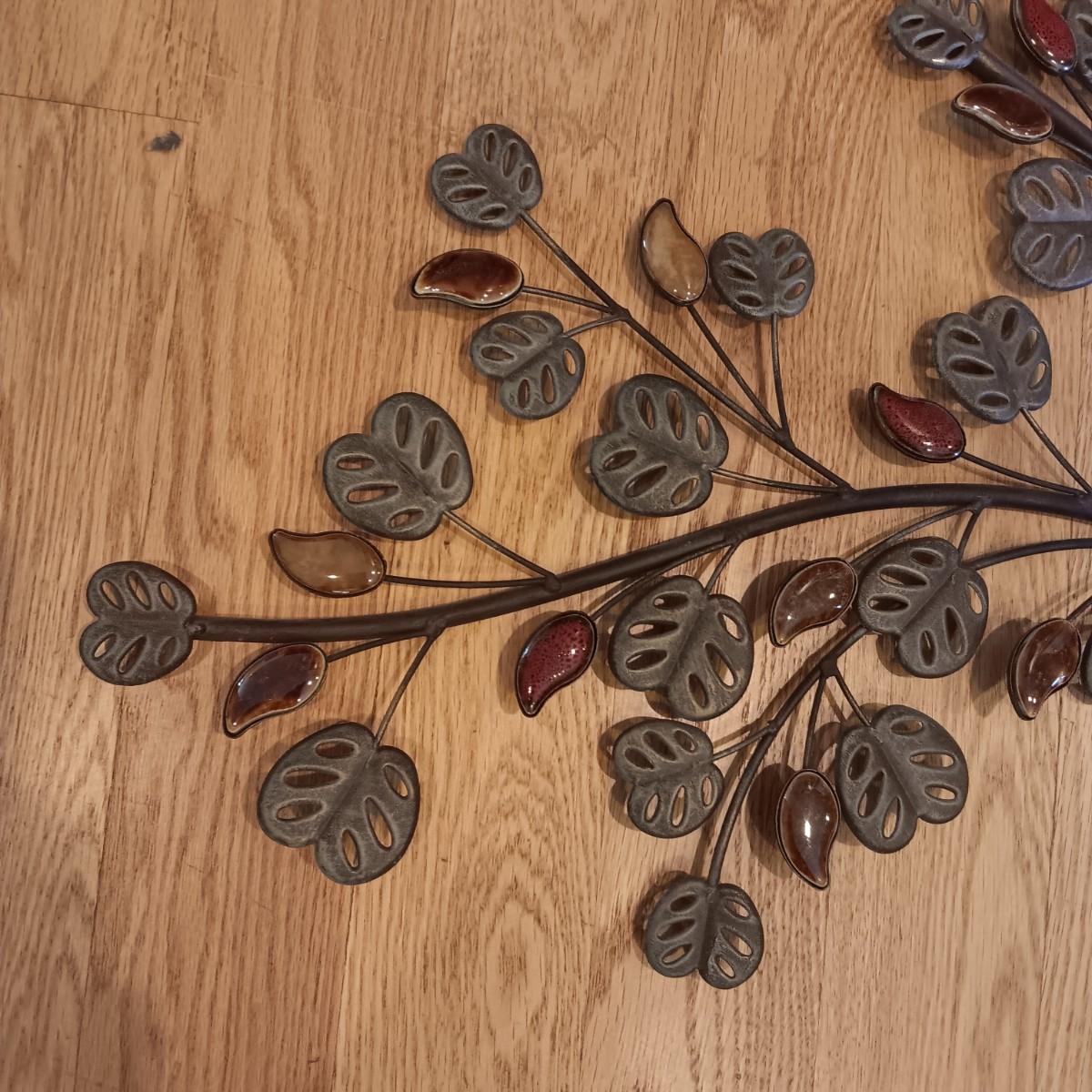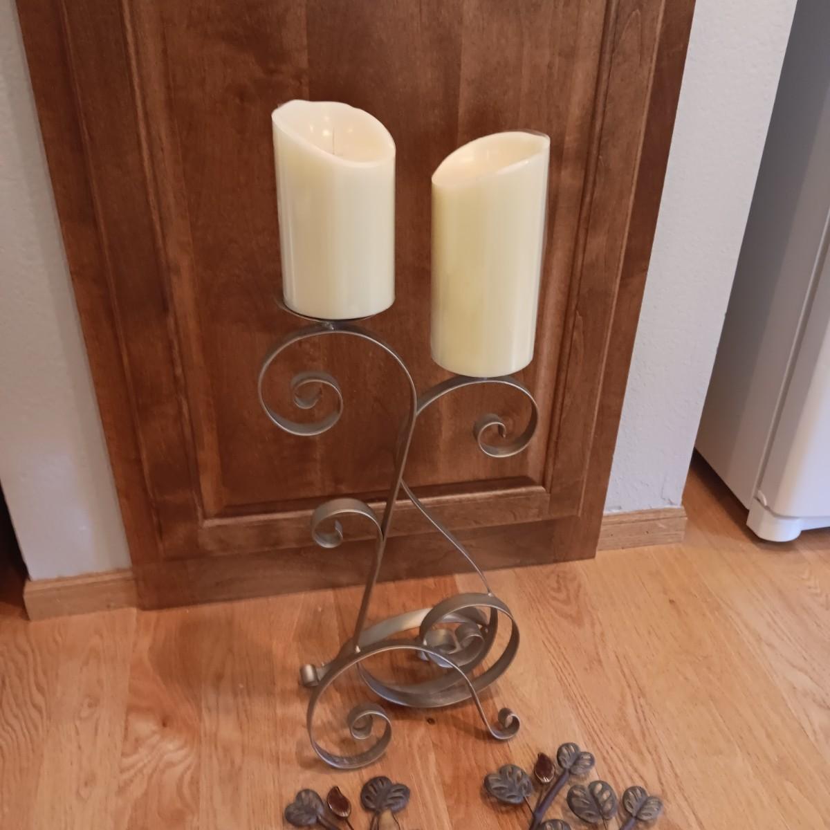 TIN AND CERAMIC LEAF WALL HANGING PLUS AN IRON CANDLE HOLDER W/FLAMELESS CANDLES