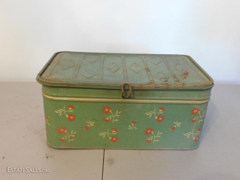 Painted tin box. Has some rusting and wear.