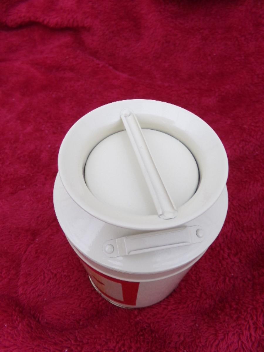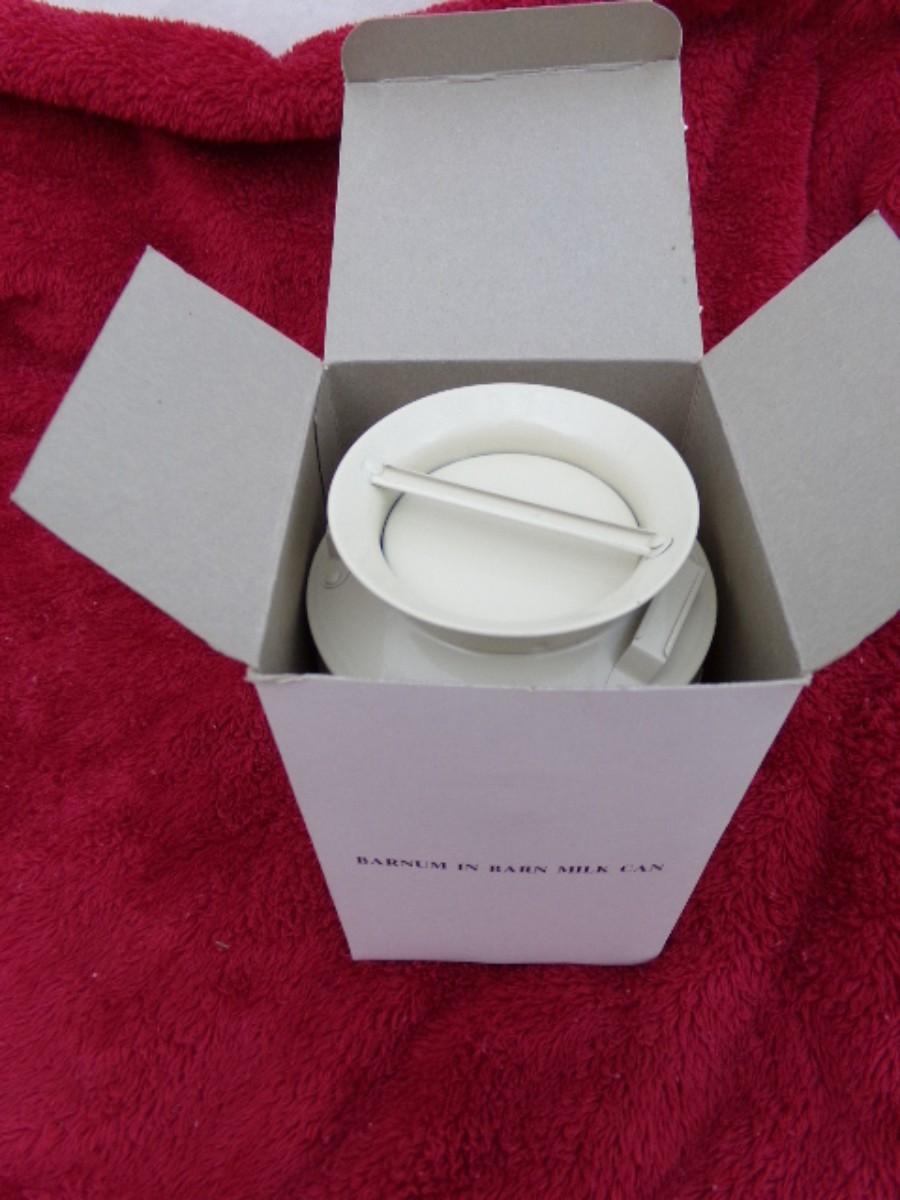 A tin container that resembles an old milk can.Picture is an illustration named “Barnum in the Barn” by Roger Nannini c.1989. About 6+” tall. LNIB Originally came filled with Tootsie Rolls.