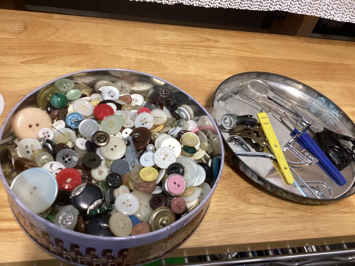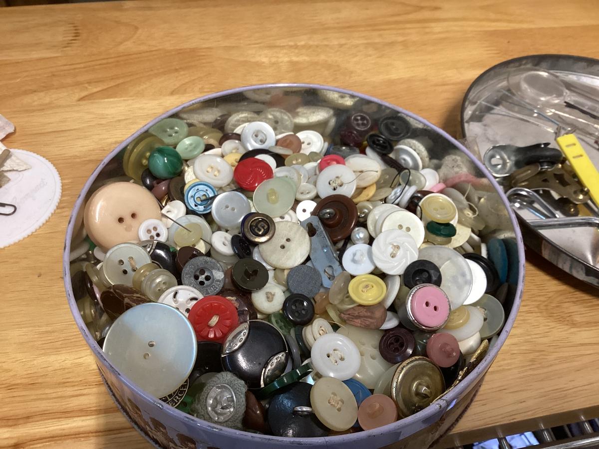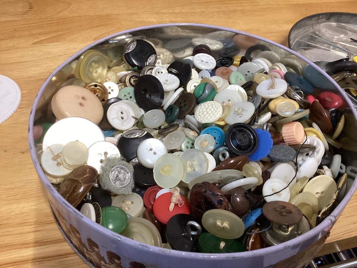 tin full of buttons and a few misc. sewing items