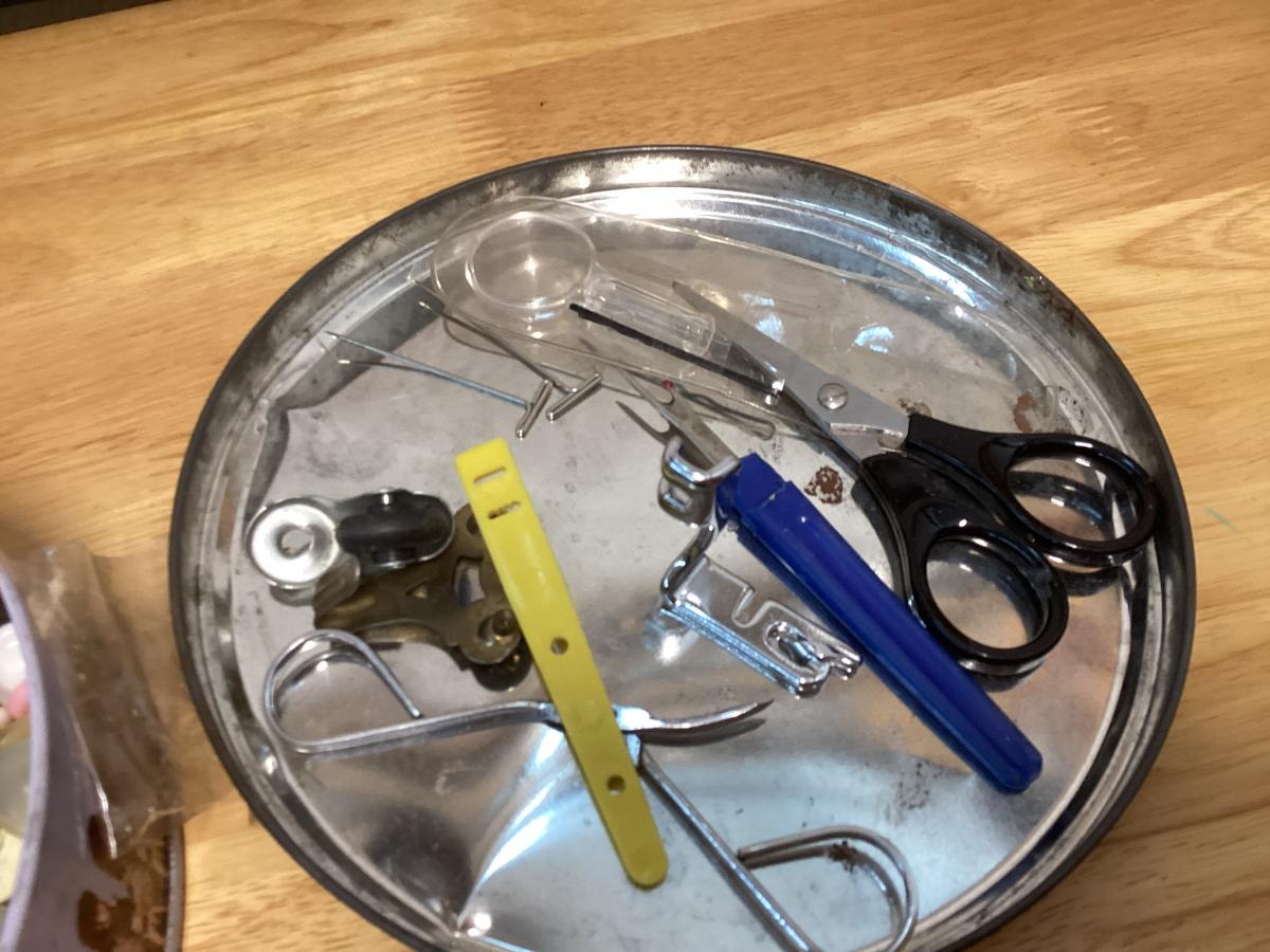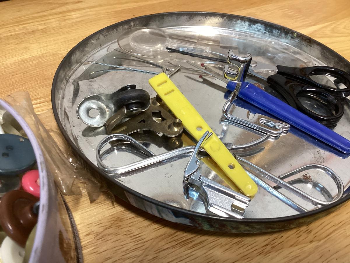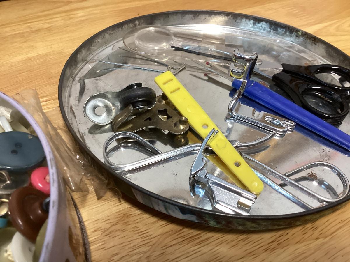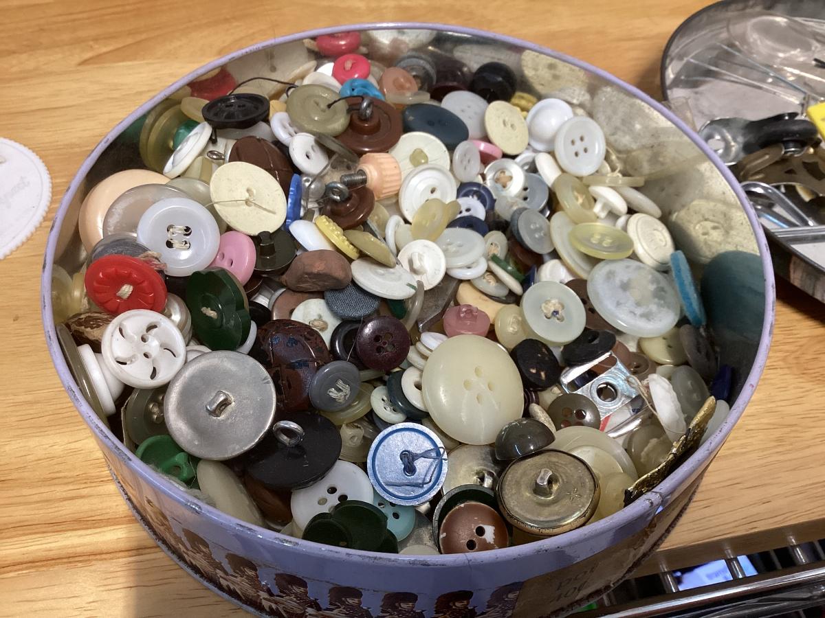 tin full of buttons and a few misc. sewing items