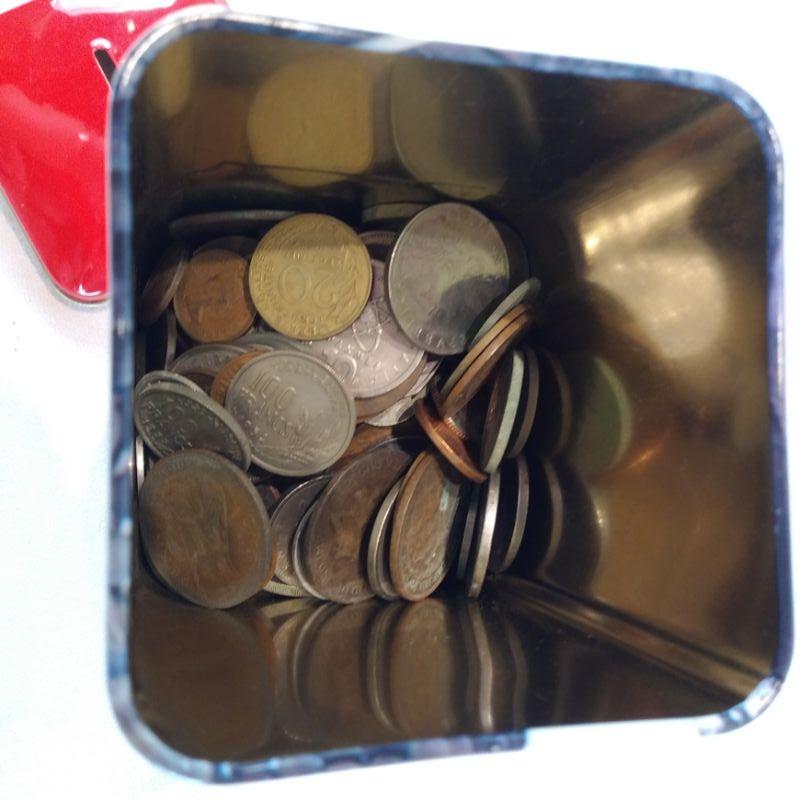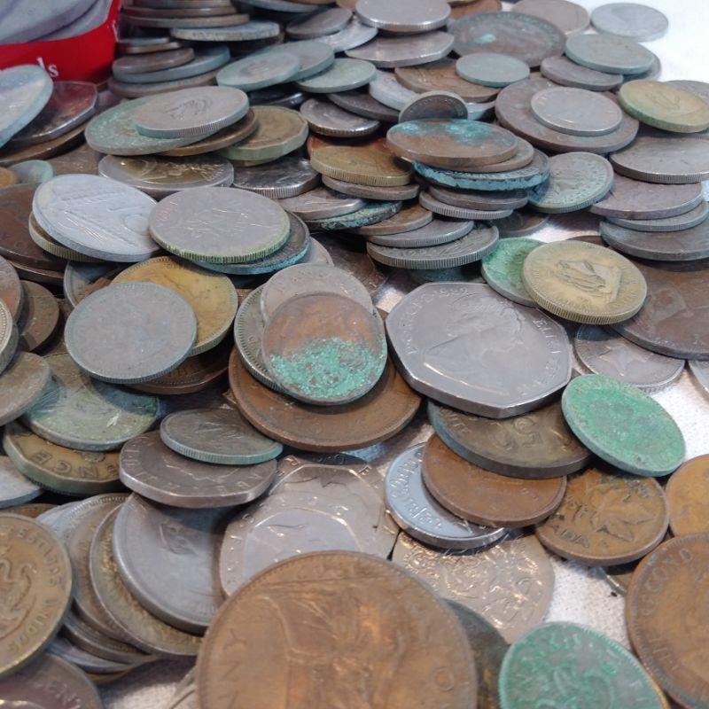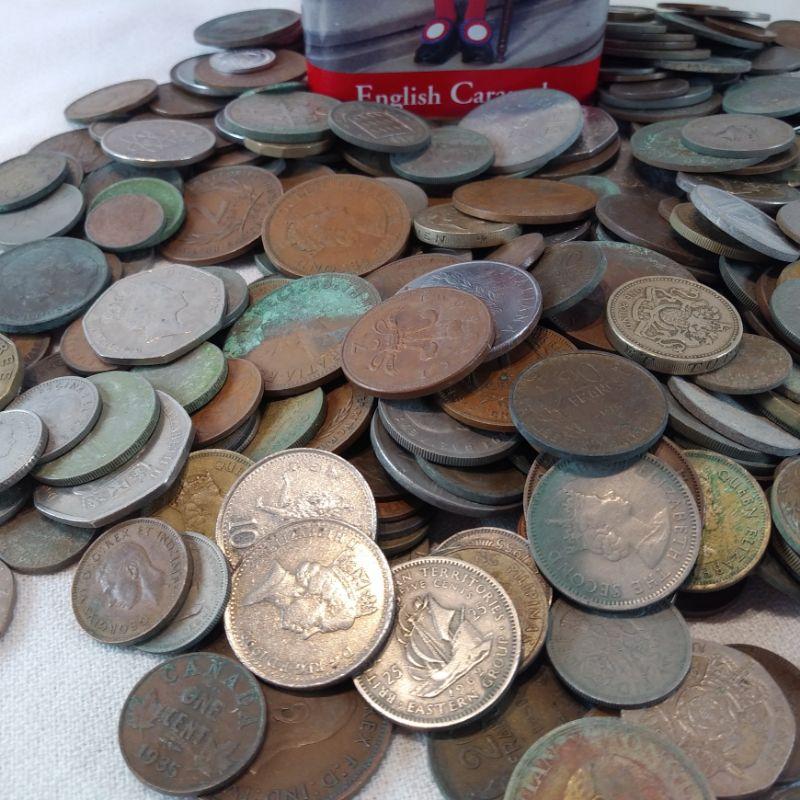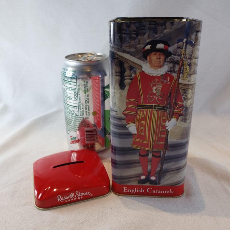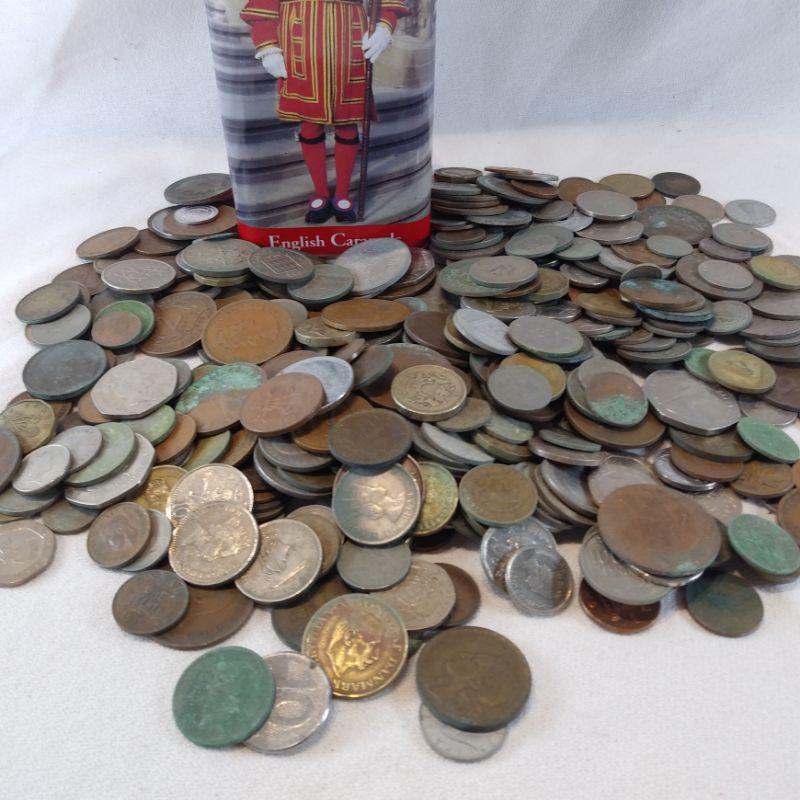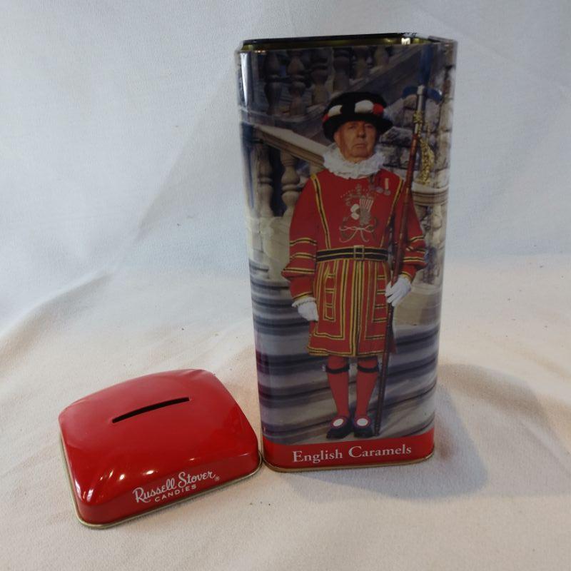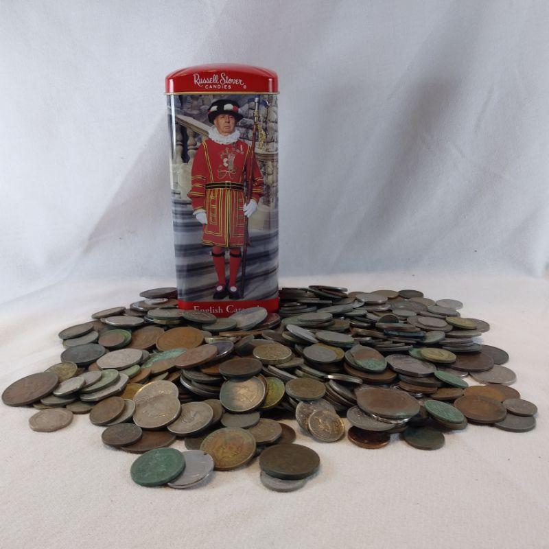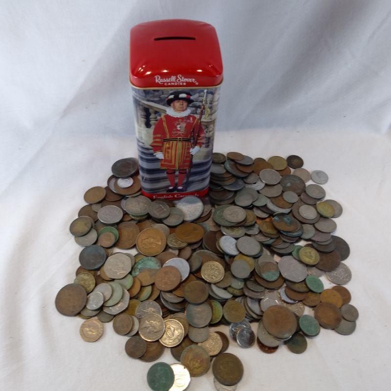 Some are shiny, some are green, and all the rest are in between. There are approximately 300 foreign coins. There are francs, marks, liras and asian coins - who knows. These coins came from the recent estate we liquidated in Ft. Lauderdale, FL and somehow got overlooked in that sale and shipped back to Louisville with a few other finer items we will be offering in upcoming sales. The folks from that estate were monied and very well traveled. The tin is 7-inches tall X 3-inches square - and is a newer Russell Stover Candies Tin Bank featuring a Beefeater.